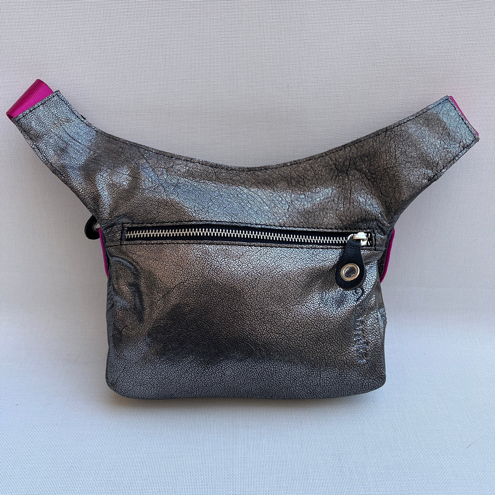 Bolsillo trasero extra con cremallera en Plata y tirador especial de piel.