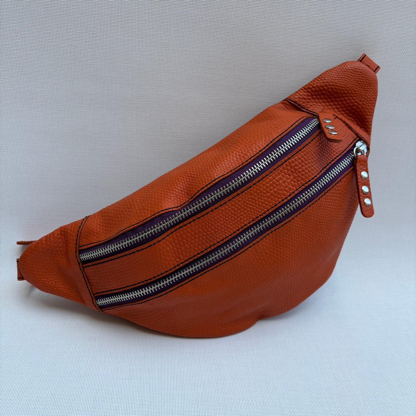 Bolsillo intermedio con gran apertura (24 cm) + Cremallera metálica en plata y tirador en piel con tachuelas a juego.