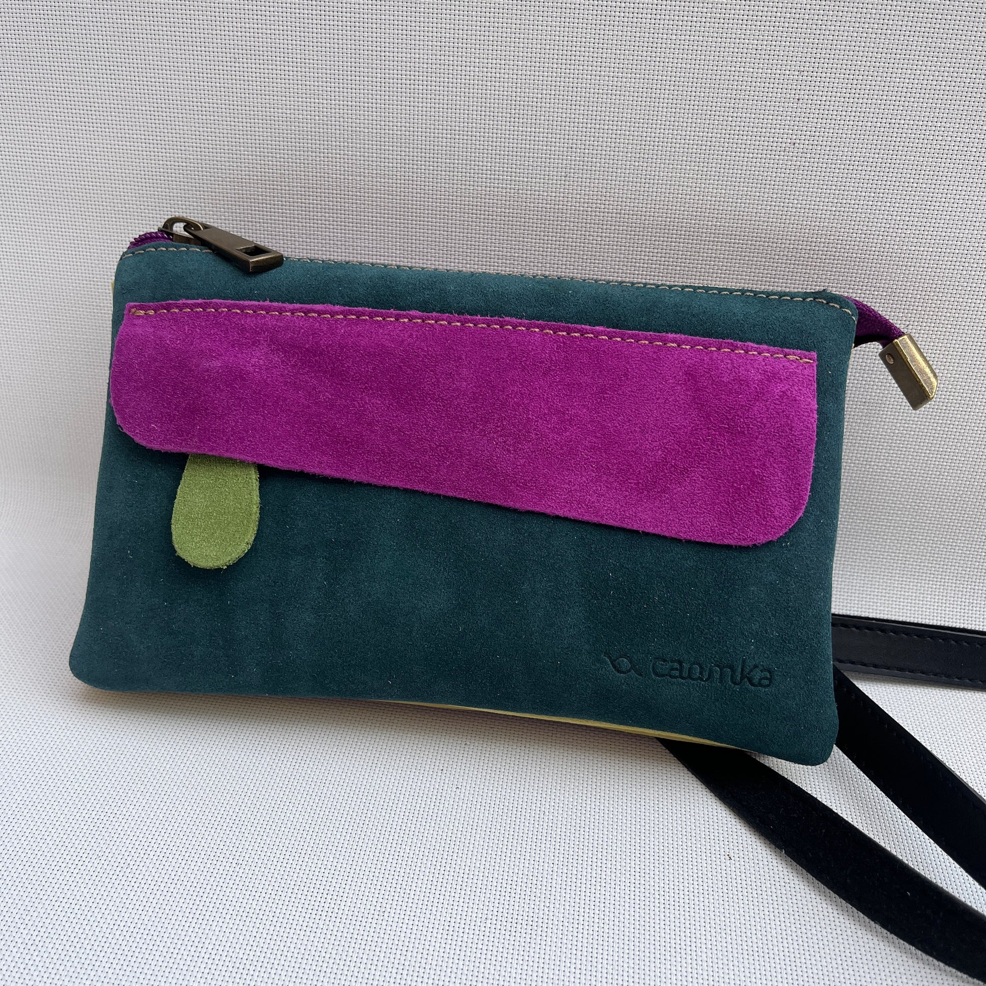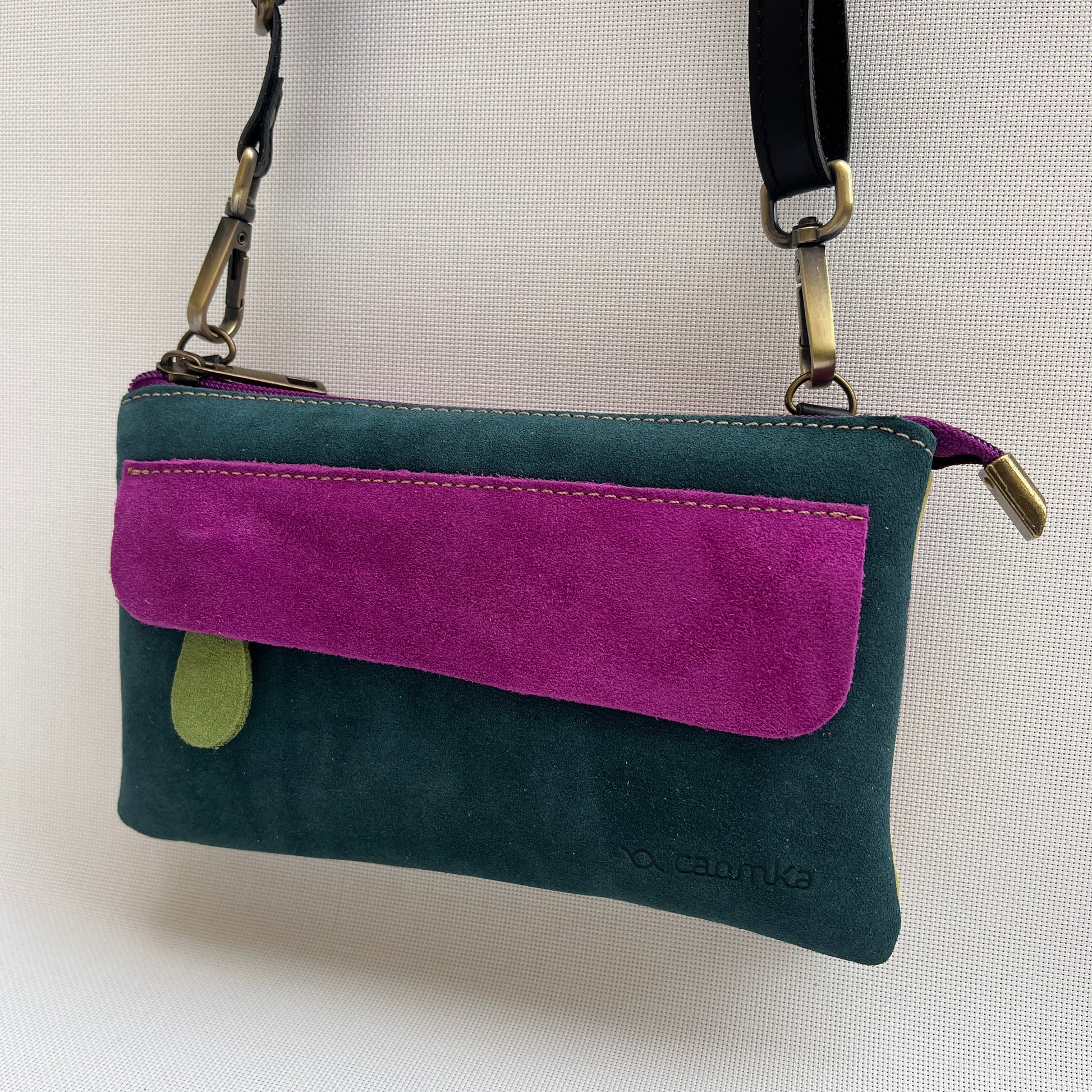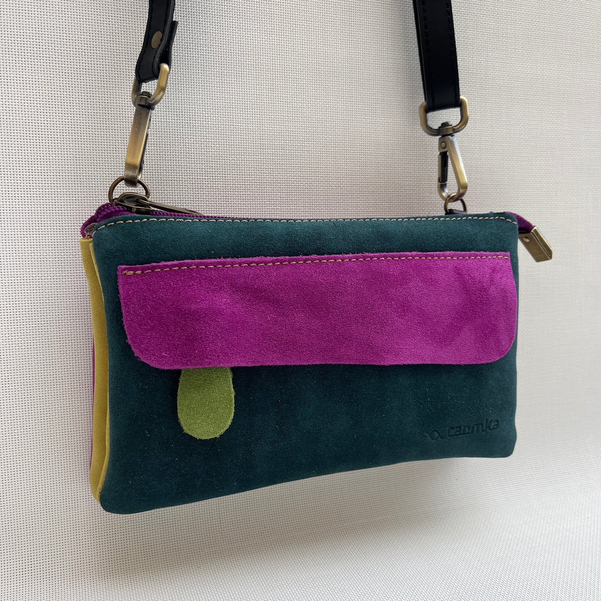 Bolso de mano, riñonera, bolsito para llevar cruzado o en el hombro. MULTIFUNCIÓN (Riñonera - Bolso - Bandolera - Bolso de mano) confeccionado en piel de serraje en una original combinación de colores.