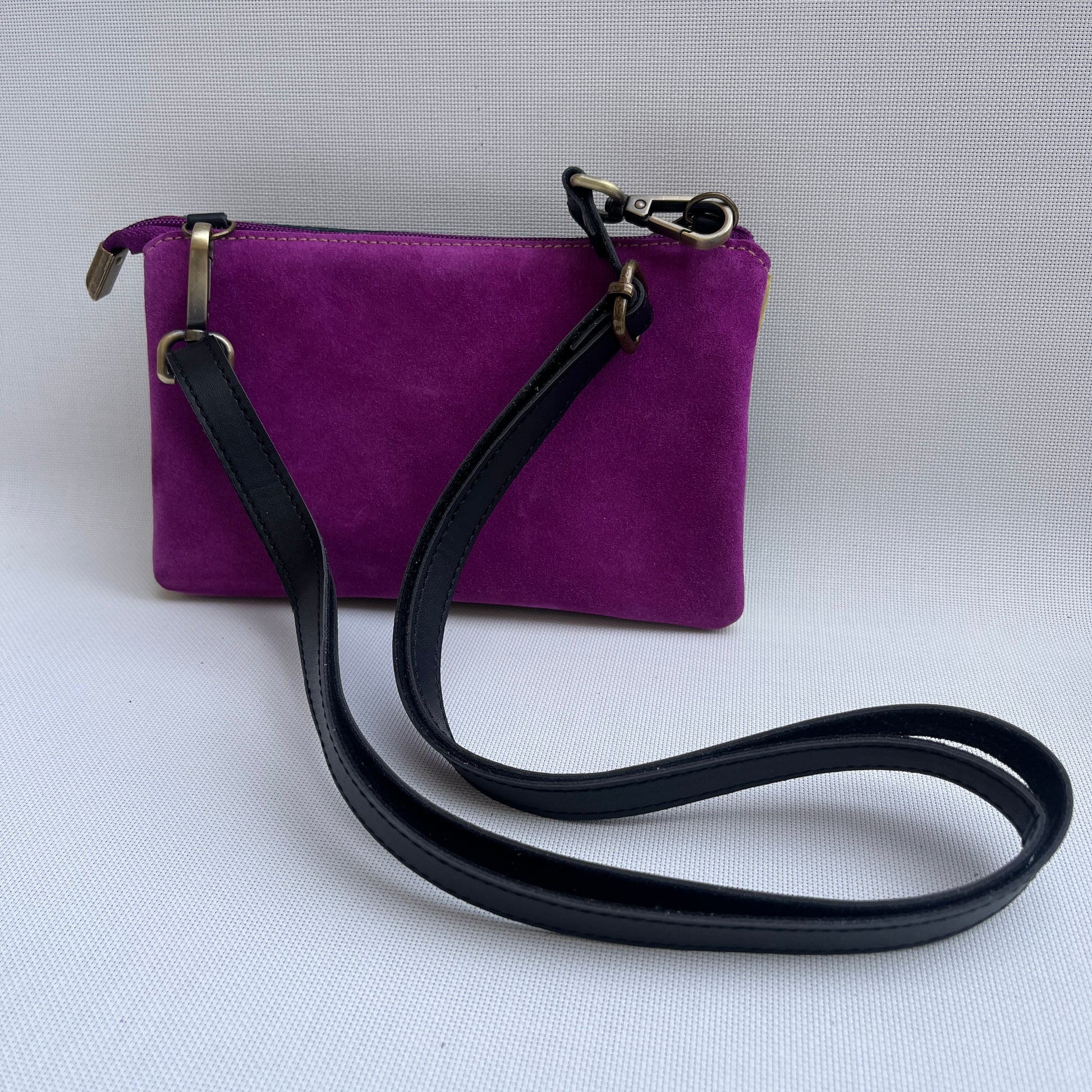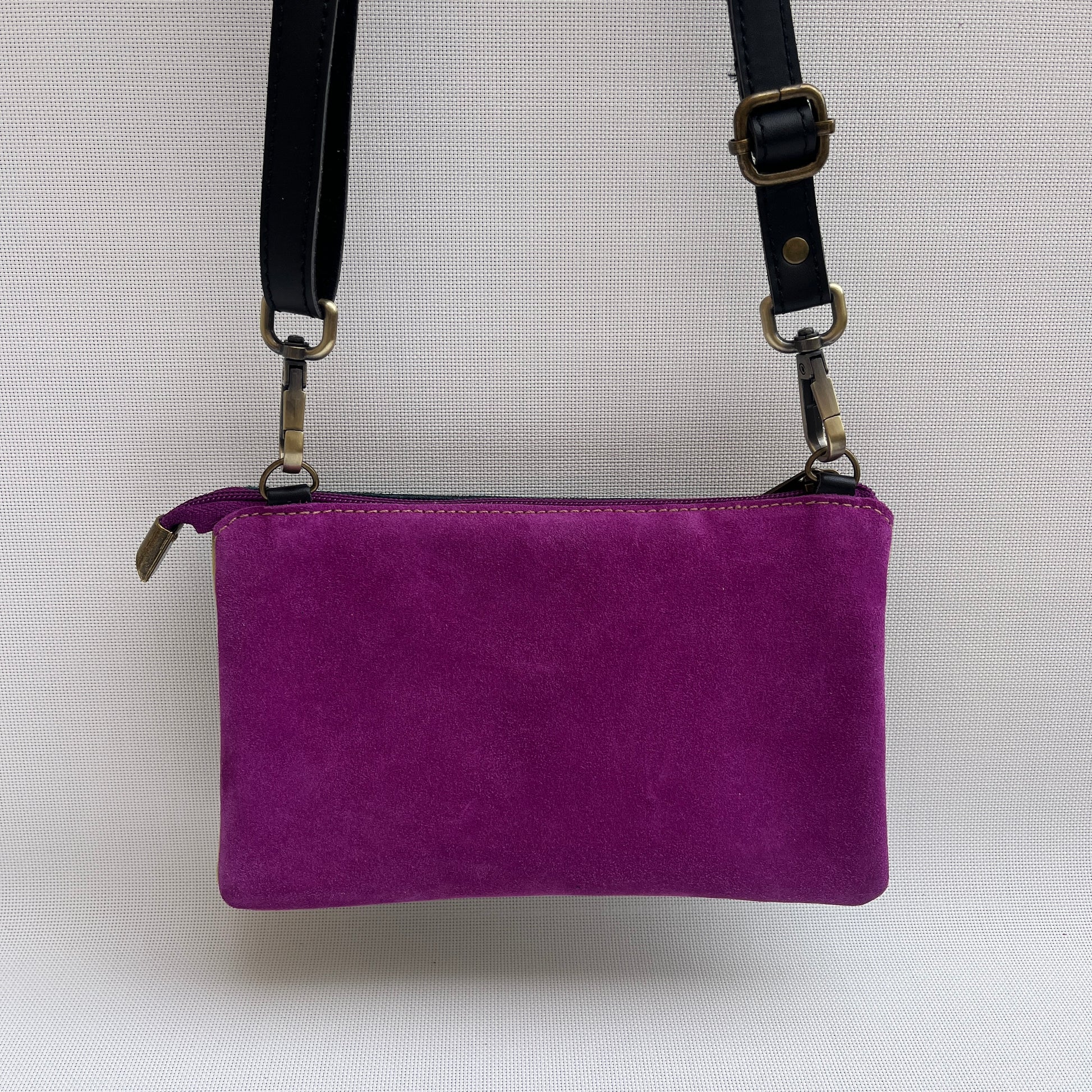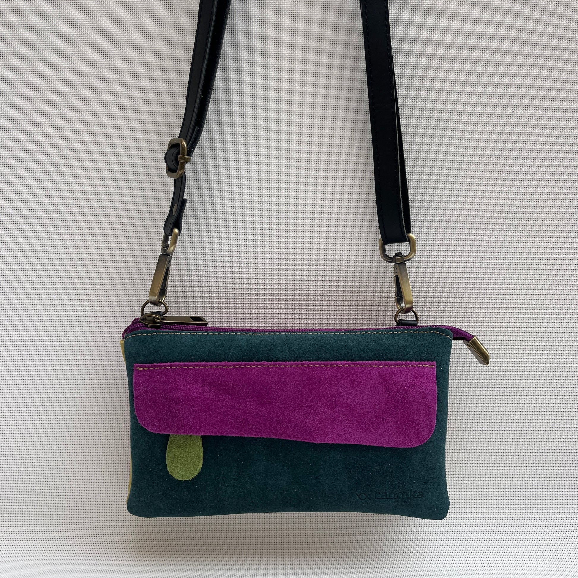 Bolso de mano, riñonera, bolsito para llevar cruzado o en el hombro. MULTIFUNCIÓN (Riñonera - Bolso - Bandolera - Bolso de mano) confeccionado en piel de serraje en una original combinación de colores.