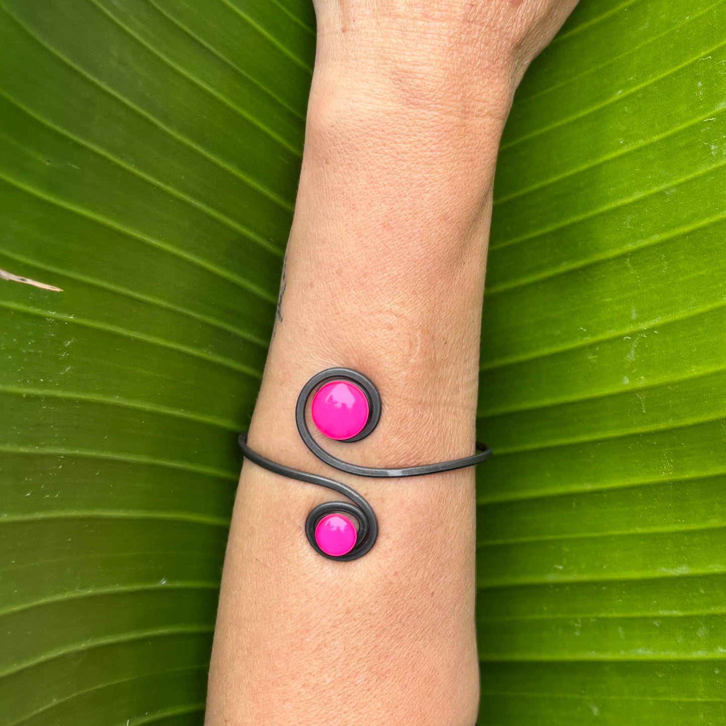 Presentamos el Brazalete Doble Sol Fucsia, una colaboración exclusiva de Caomka con el artista Mauricio Andrade. Hecho a mano en Barcelona, combina la energía vibrante del vidrio fundido fucsia con la elegancia ligera del hierro forjado, en un diseño delicado, flexible y lleno de vida.
