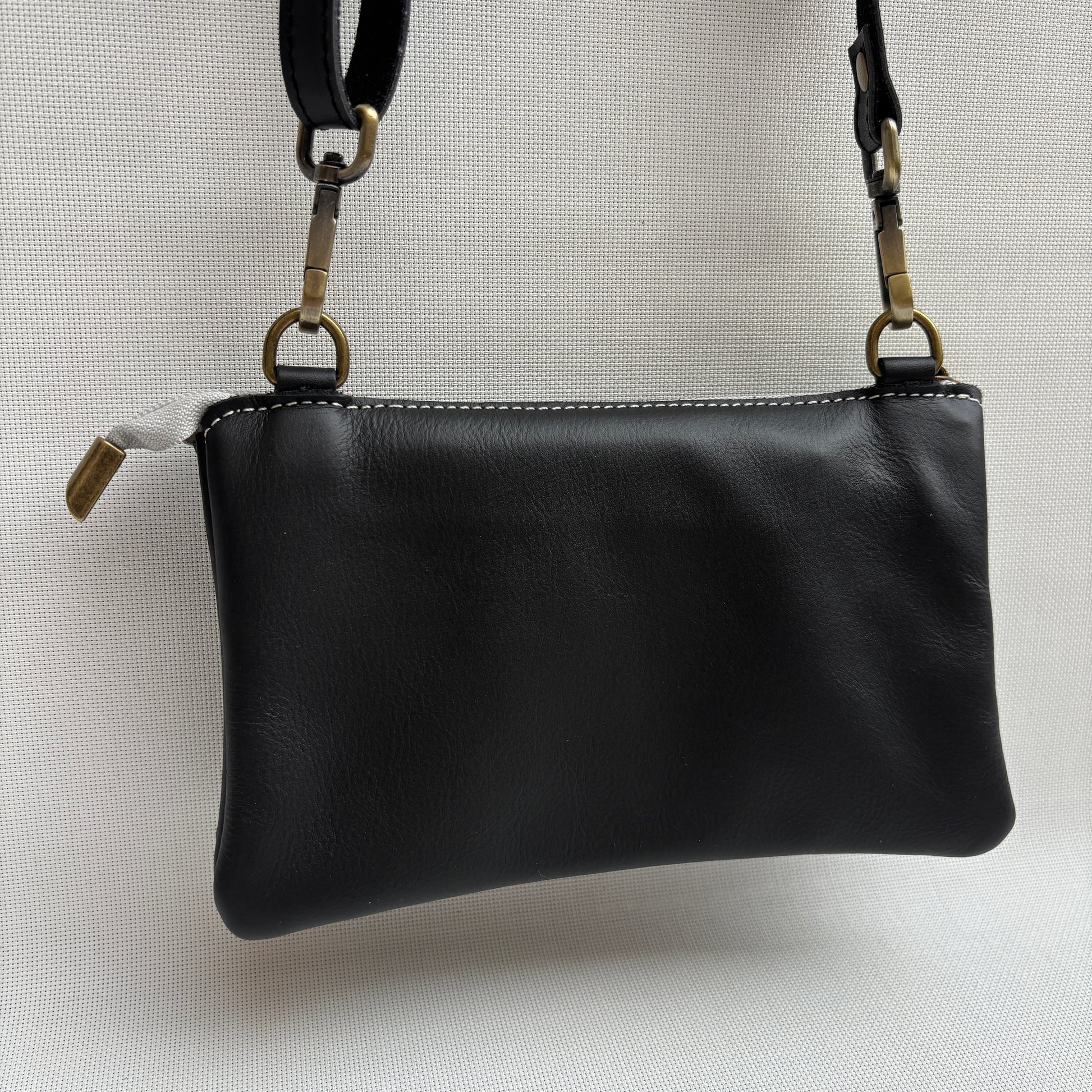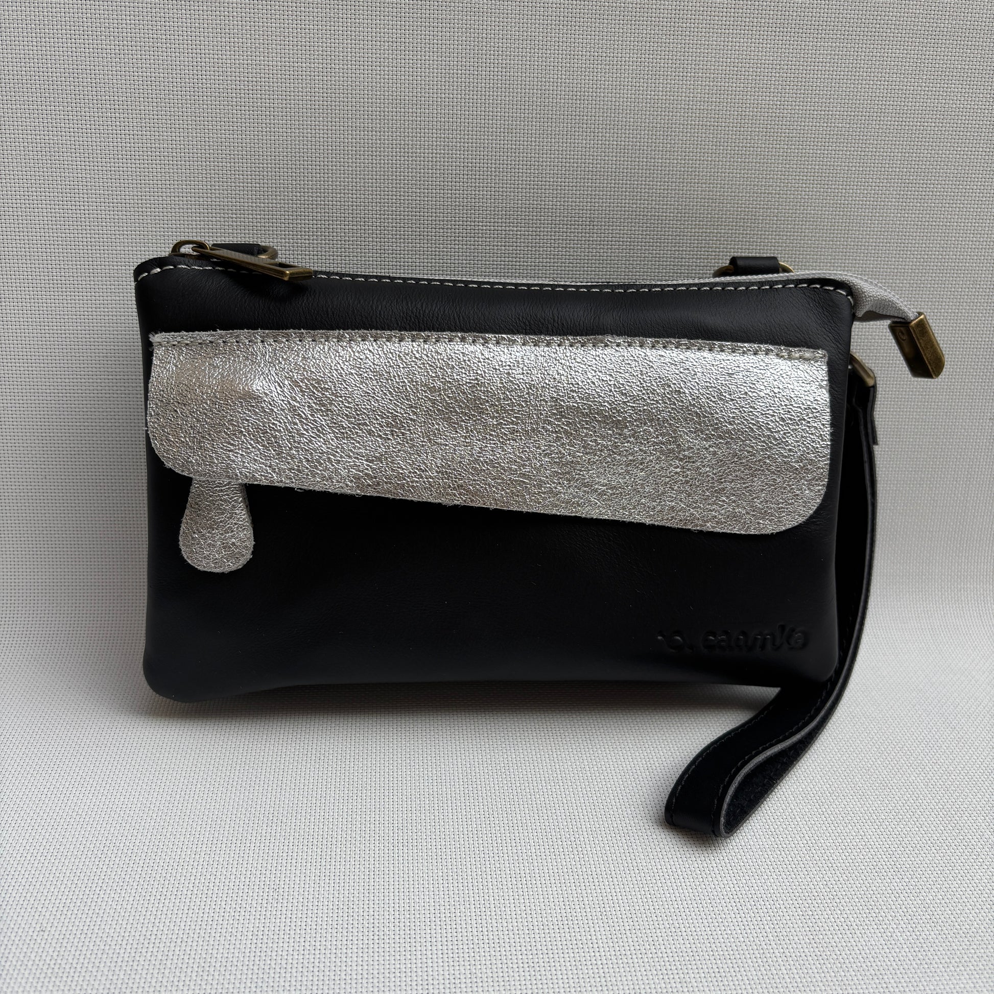 Confeccionado a mano en piel natural, destaca por su solapa grabada en plateado y cuerpo en negro, una combinación elegante que se adapta a cualquier estilo.