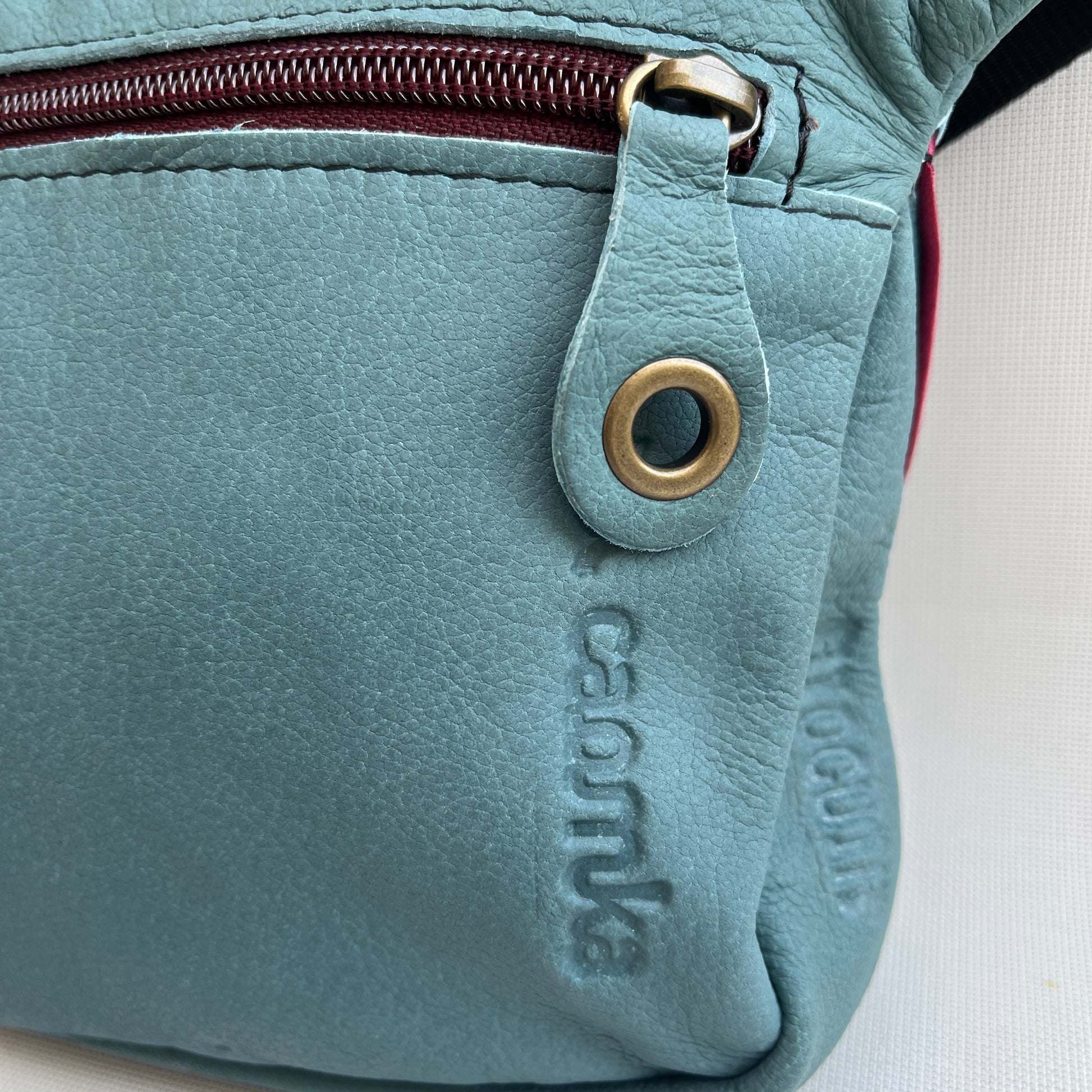 Bolsillo trasero extra con cremallera de nylon en color burdeos y tirador especial de piel.