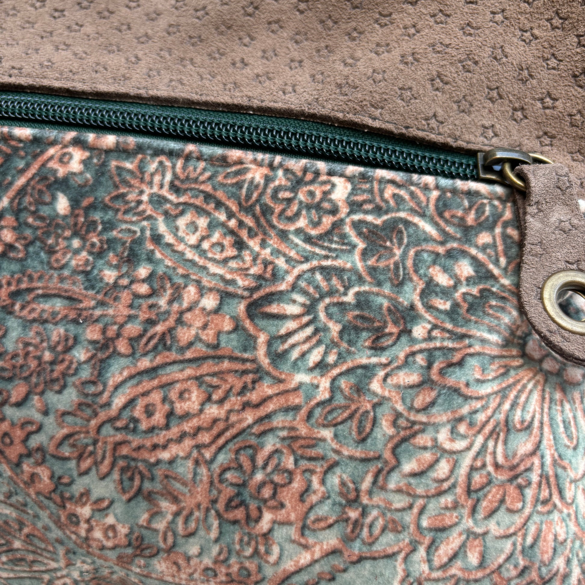 Bolsillo trasero extra con cremallera a juego y tirador especial de piel.