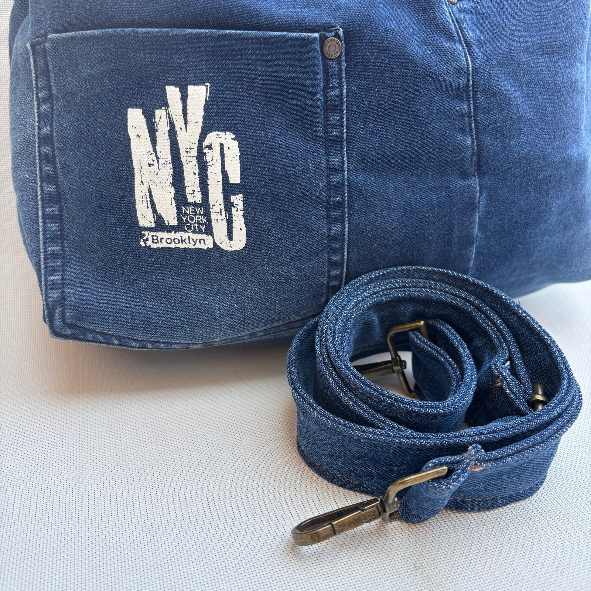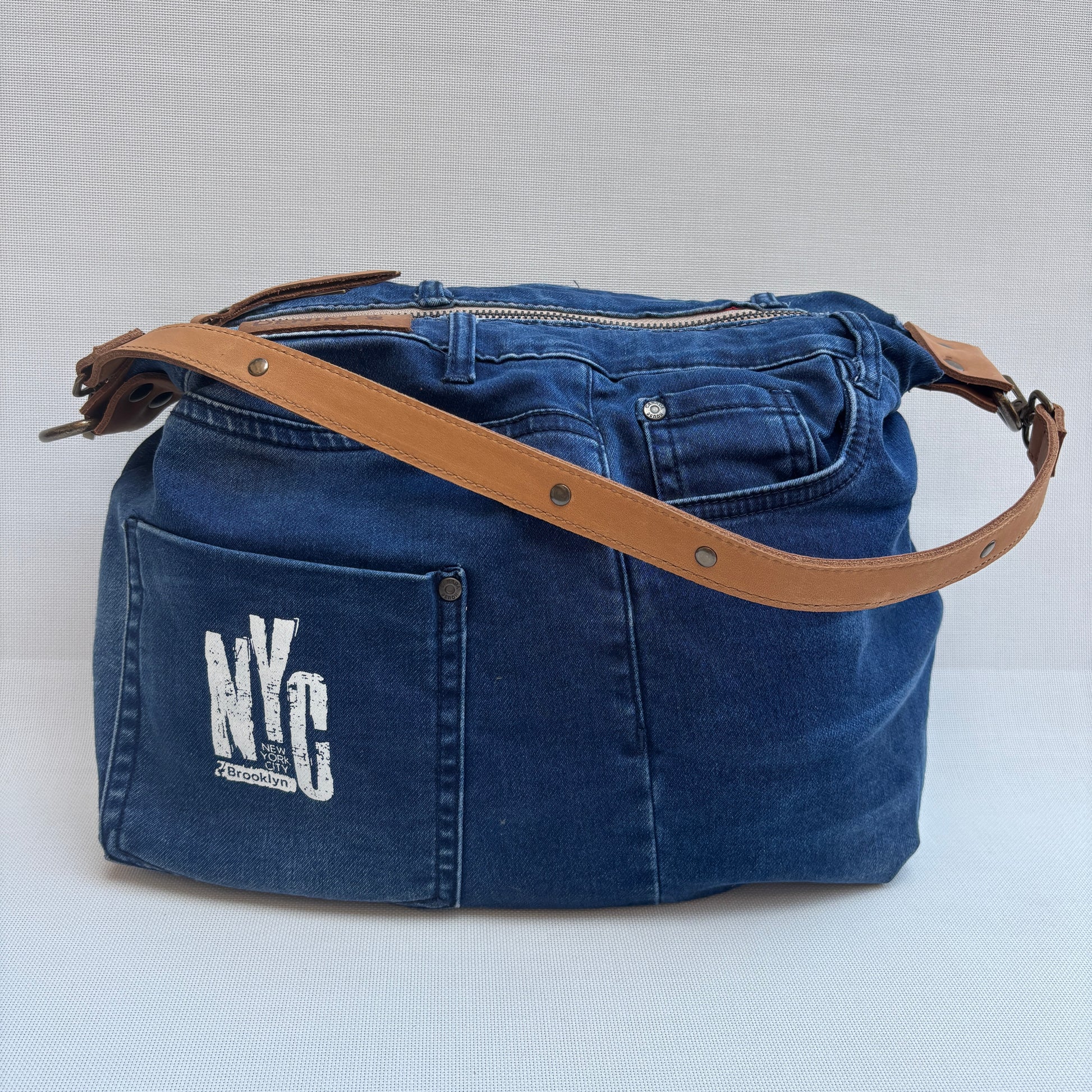 Bolso Multifunción en tela vaquera reciclada y resistente procedente de pantalones y chaquetas vaqueras reutilizadas.