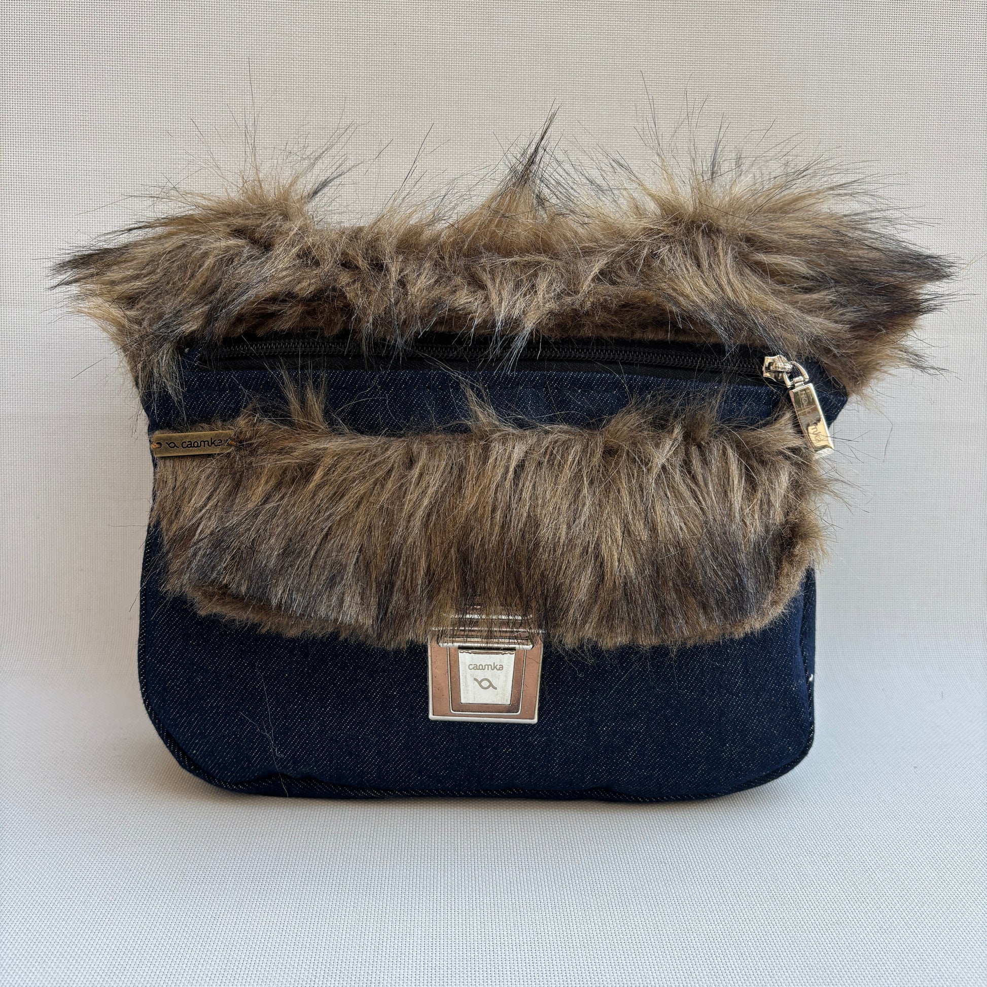 El cuerpo en tejido vaquero azul oscuro aporta estructura y resistencia, mientras que la solapa en pelo largo en tonos marrón, beige y negro introduce volumen, textura y personalidad.