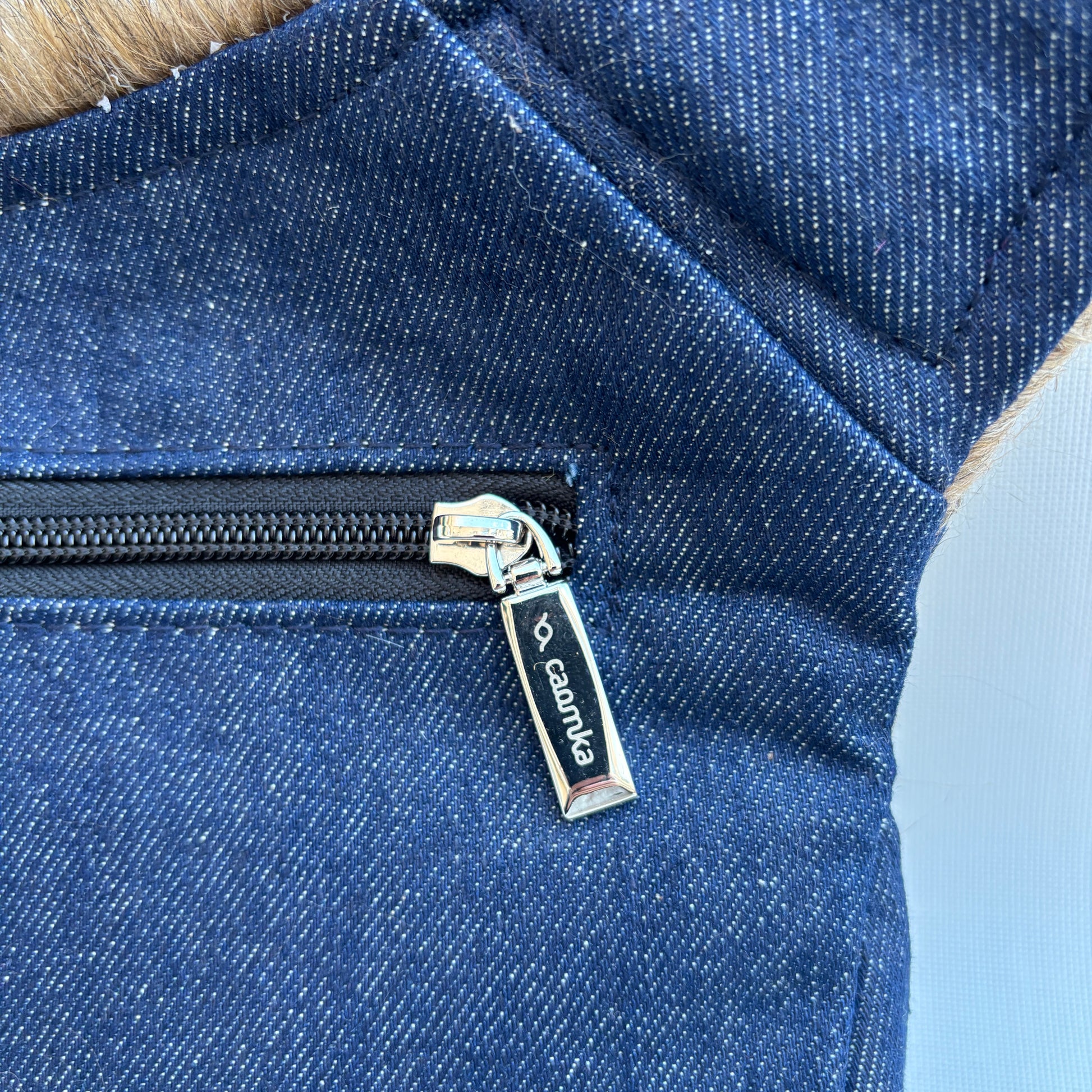 El contraste entre el acabado urbano del jeans y el efecto salvaje del pelo convierte esta riñonera en una declaración de estilo: cómoda, diferente y con presencia.