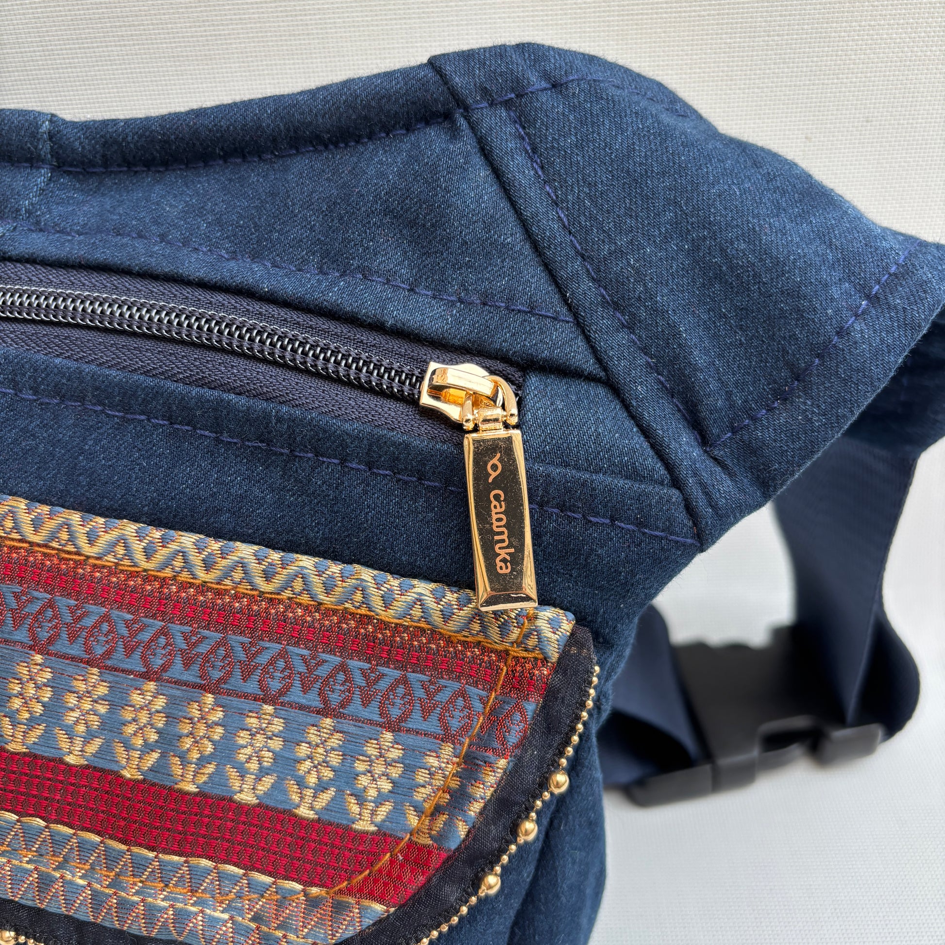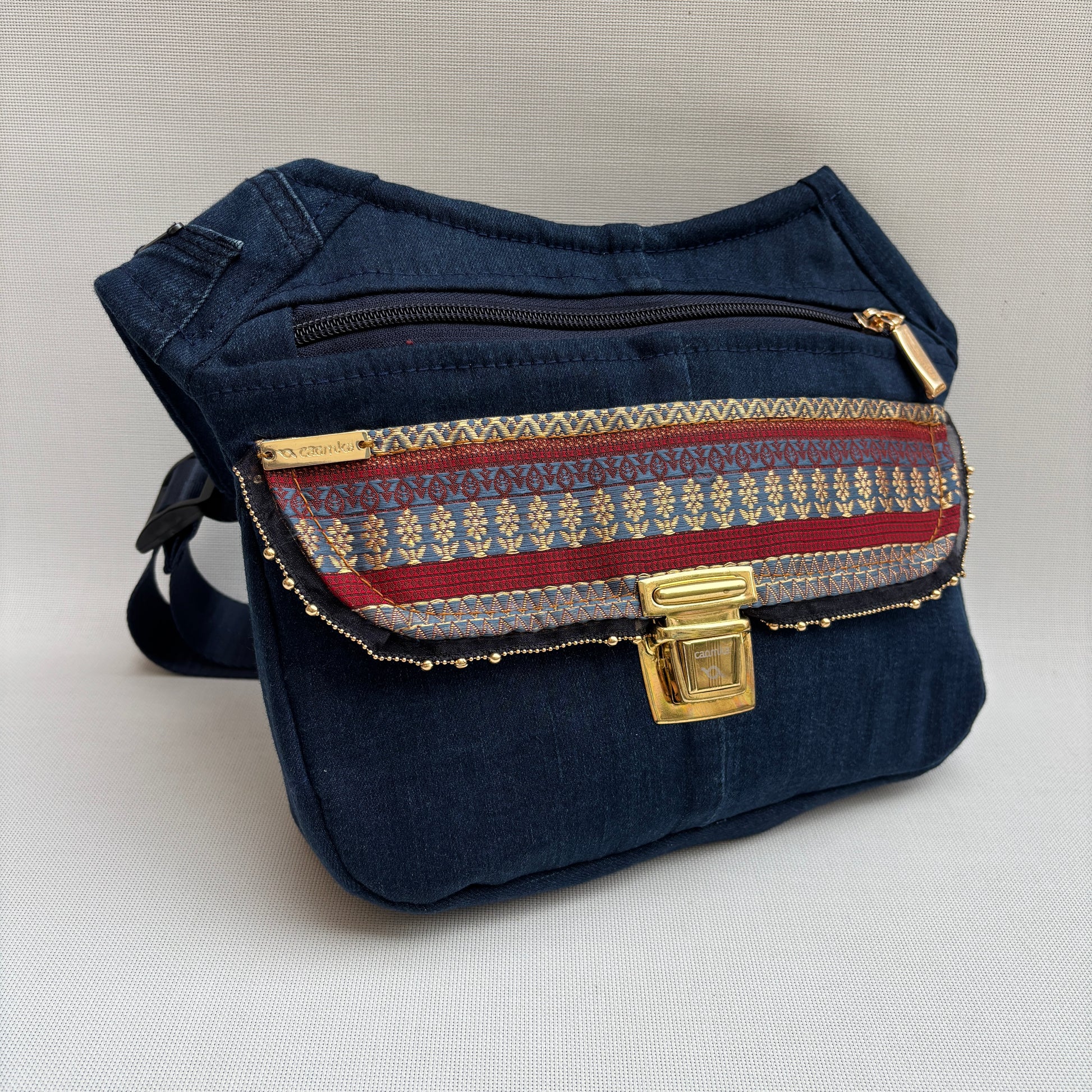 Confeccionada a partir de tejido vaquero reciclado, cada costura y cada textura hablan de una segunda vida convertida en diseño. Su base en denim oscuro aporta fuerza y versatilidad, mientras que la solapa combina tejidos con detalles geométricos en tonos rojo, azul y dorado que elevan la pieza con un aire sofisticado.