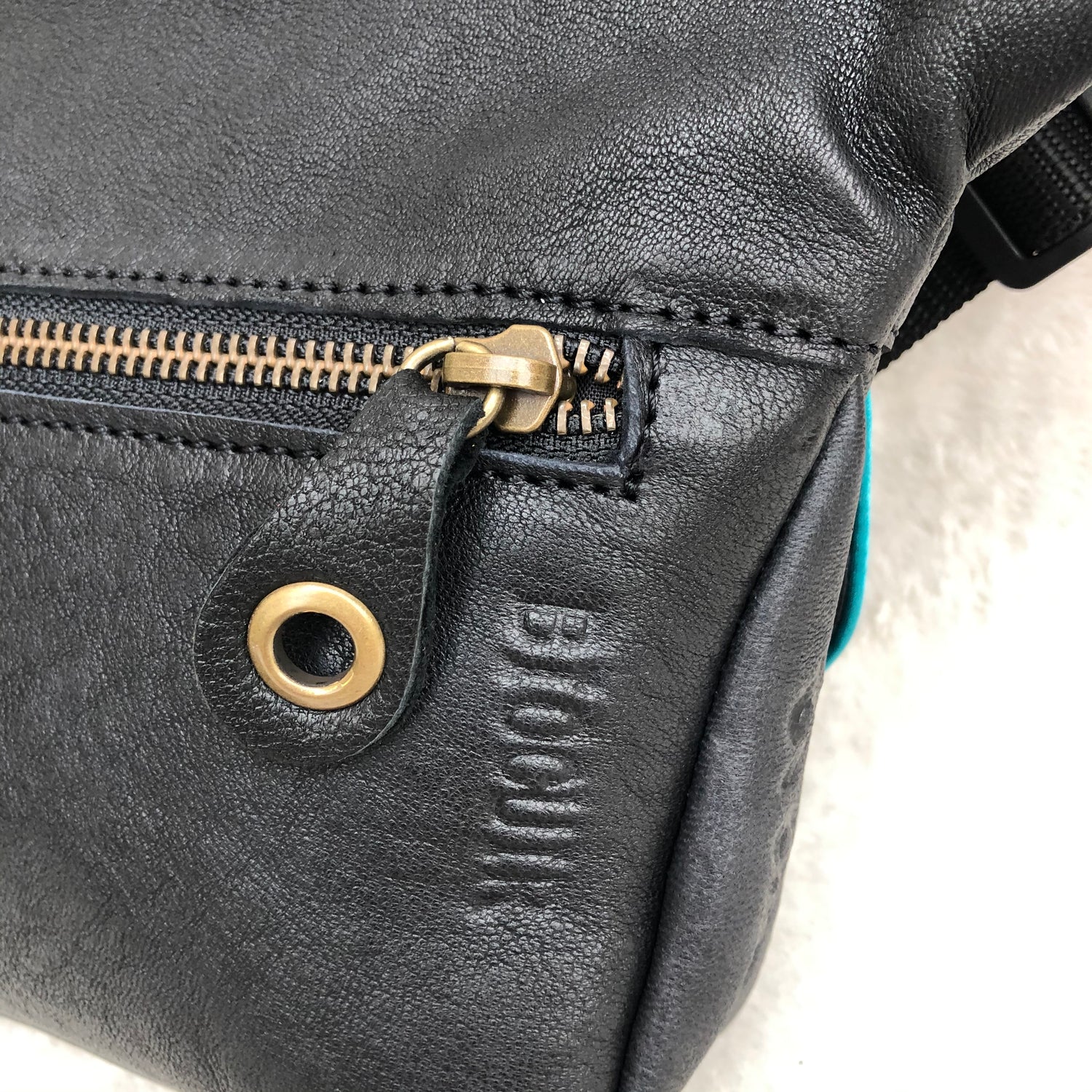Bolsillo extra trasero (15cm) con cremallera color Oro Viejo y tirador de piel.