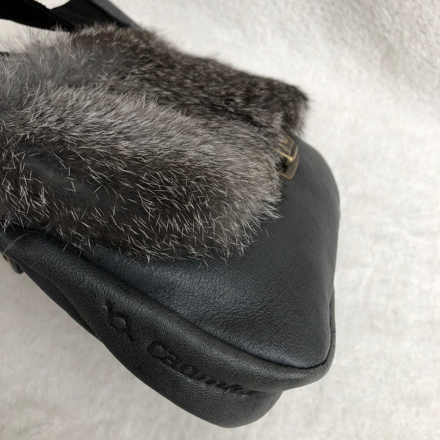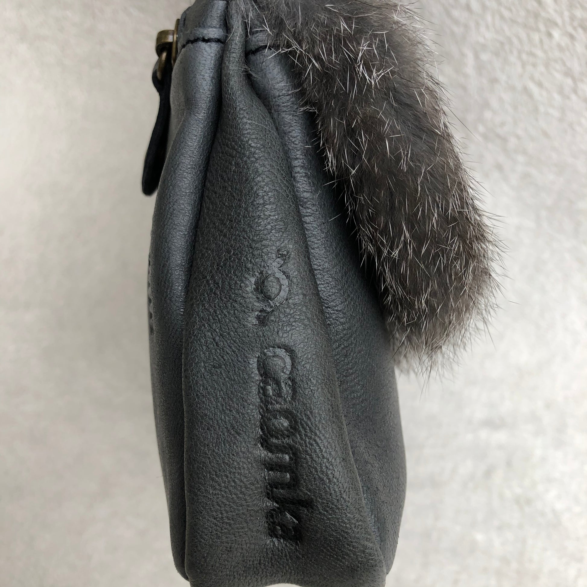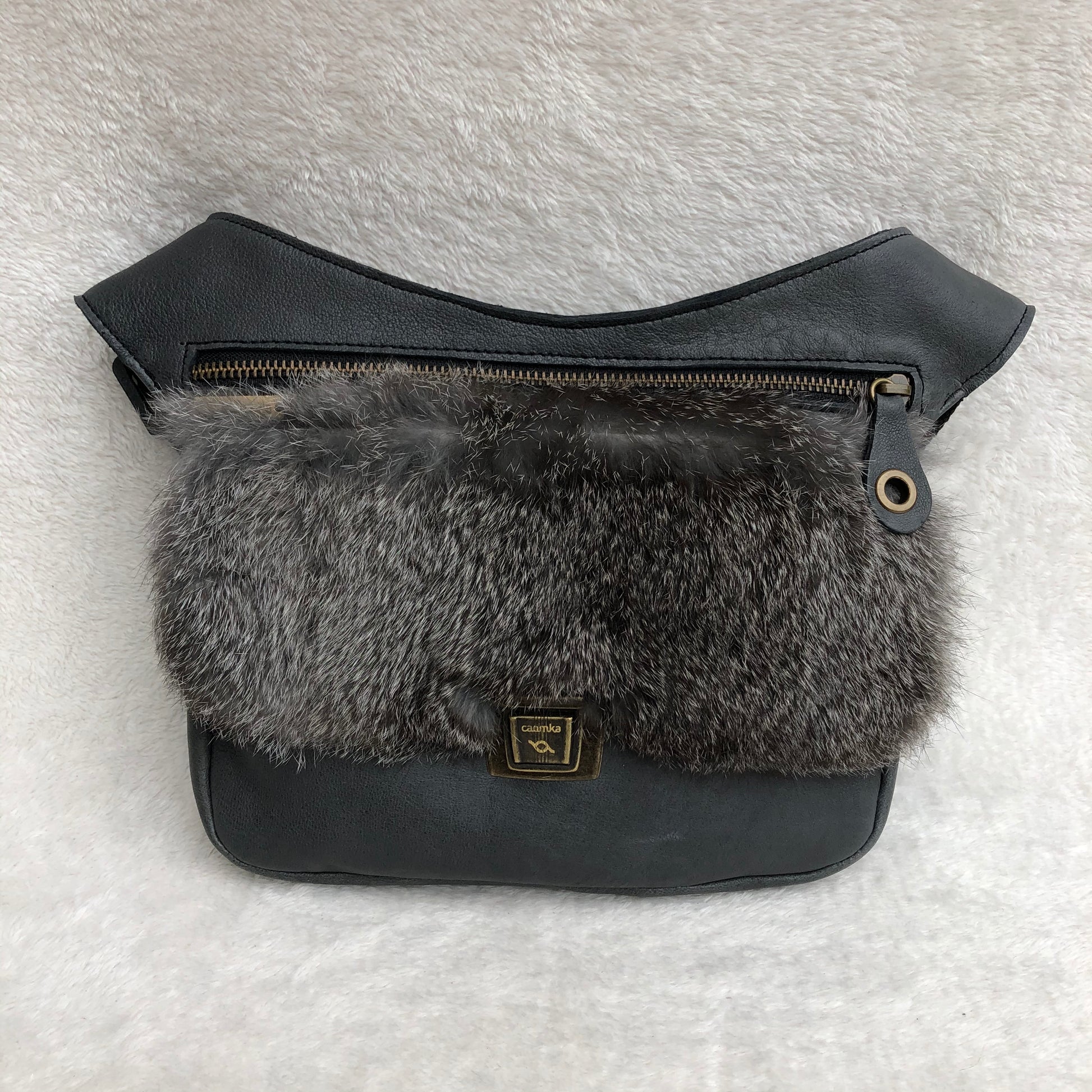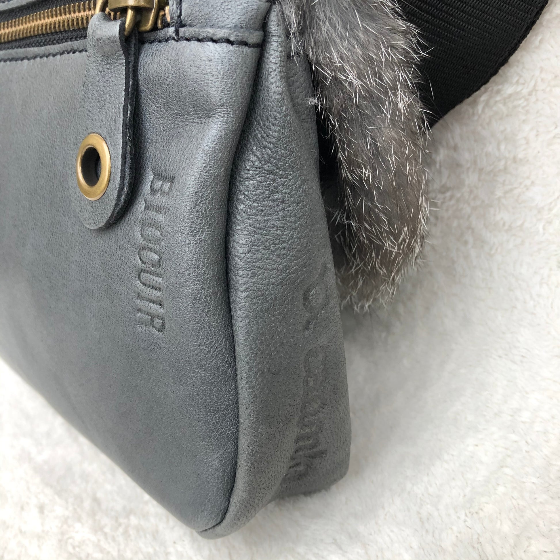 Bolsillo trasero extra con cremallera en Plata y tirador especial de piel con círculo en oro viejo.