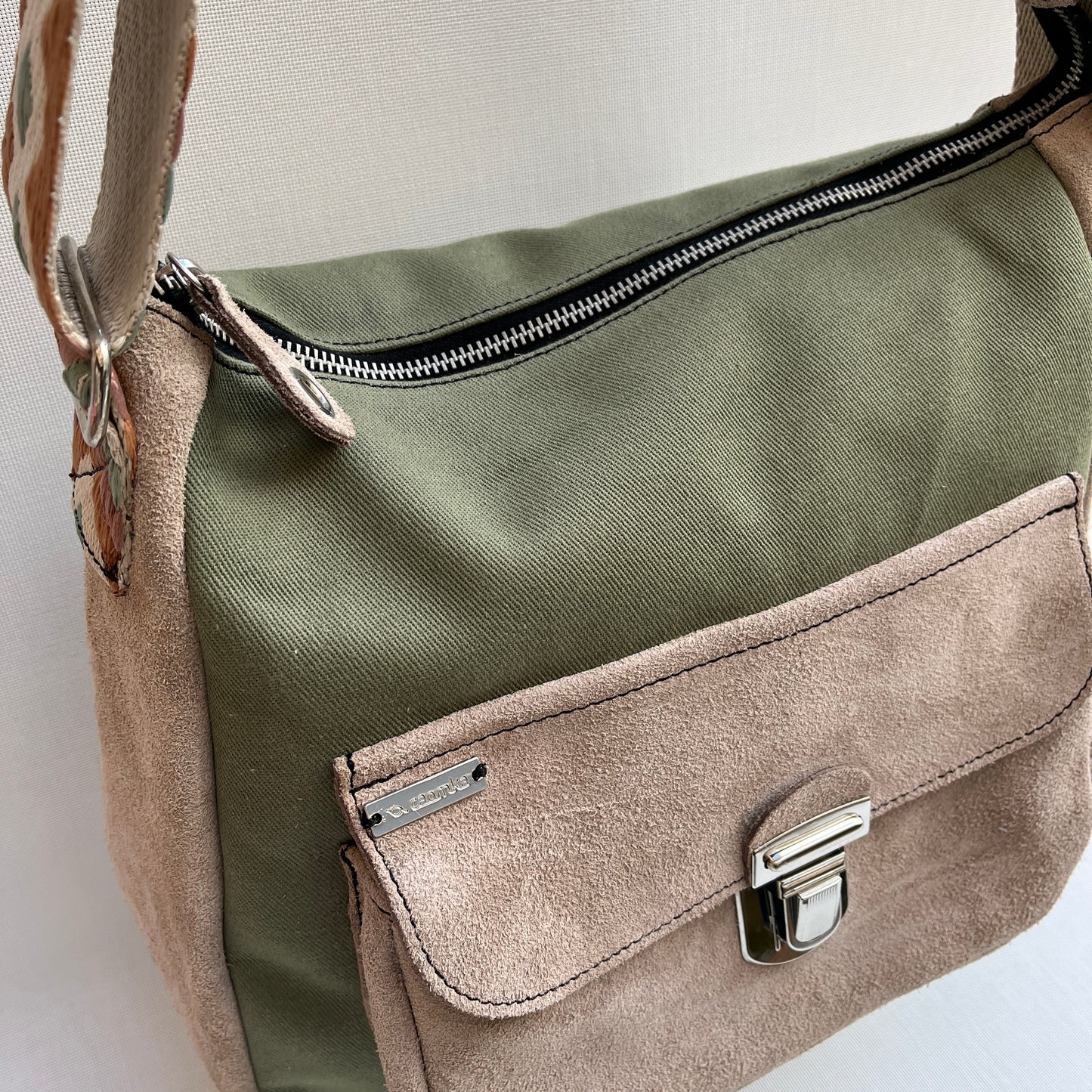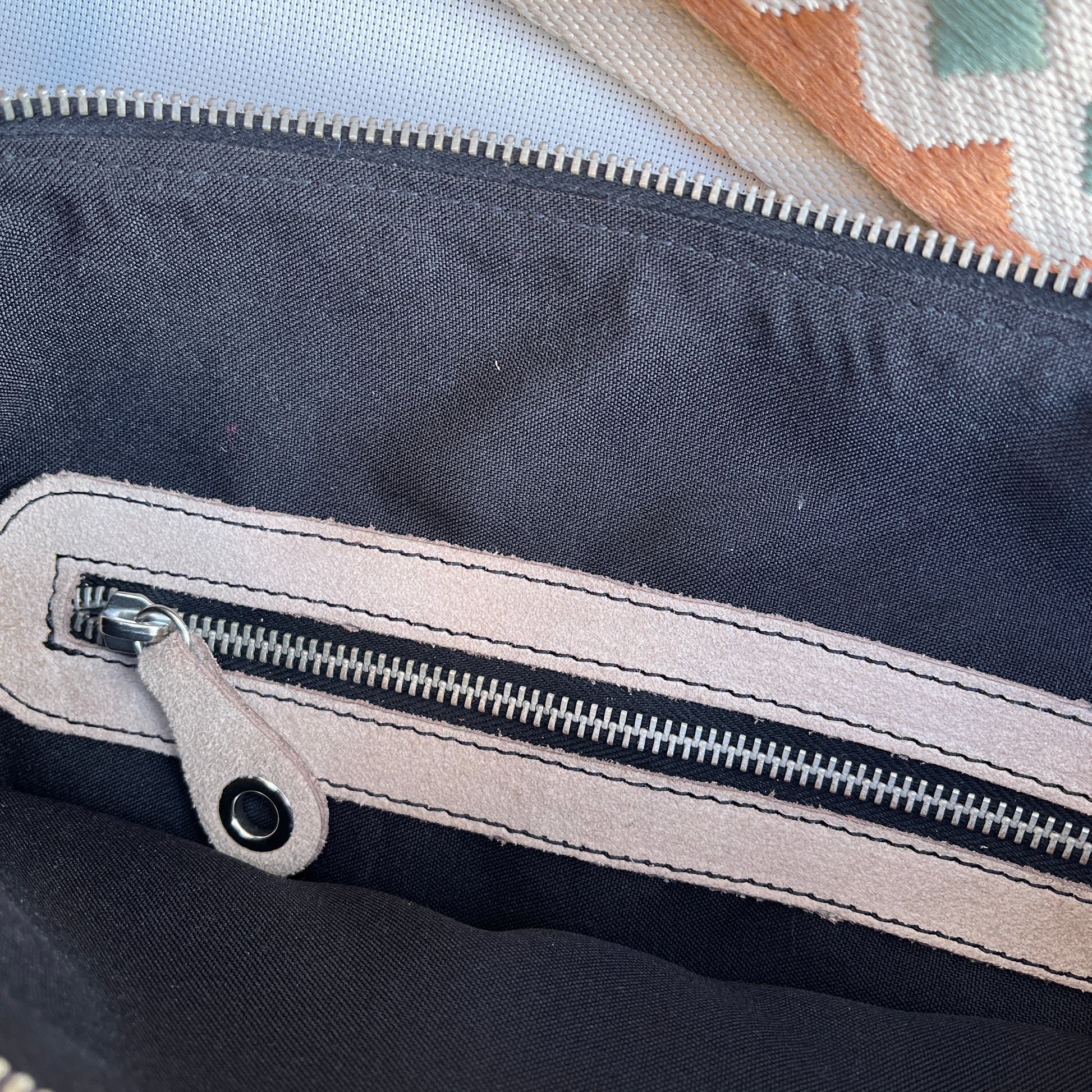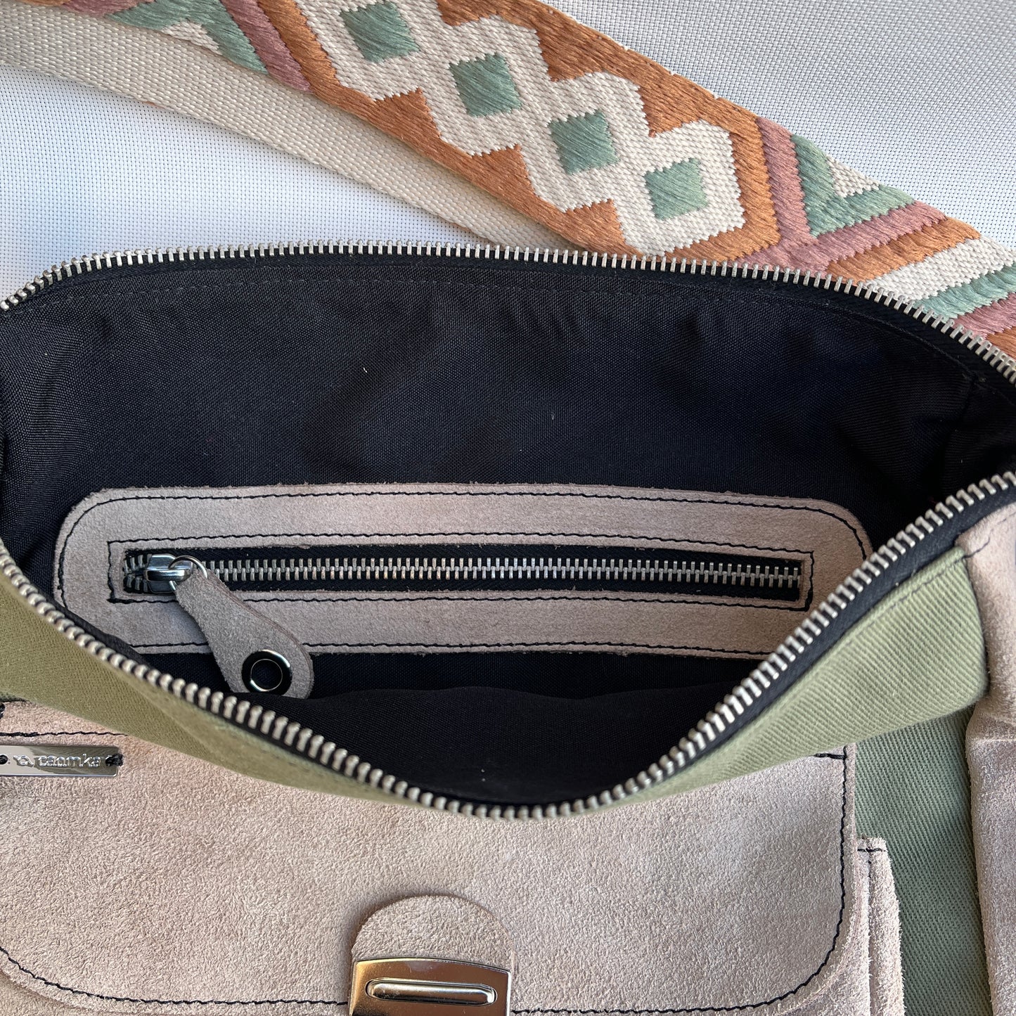 Bolsillo interior con cierre en cremallera plata y tirador especial de piel.