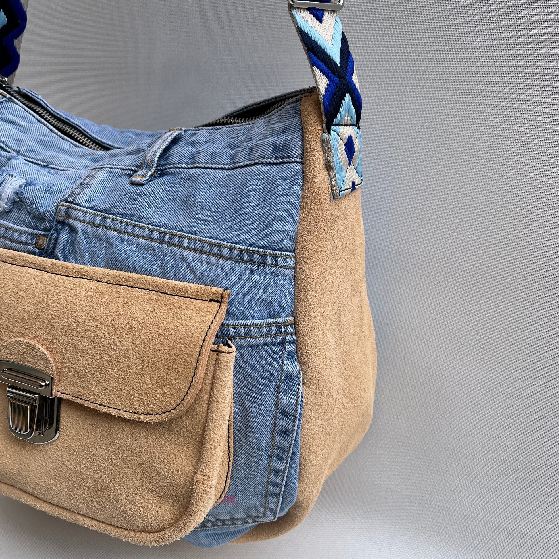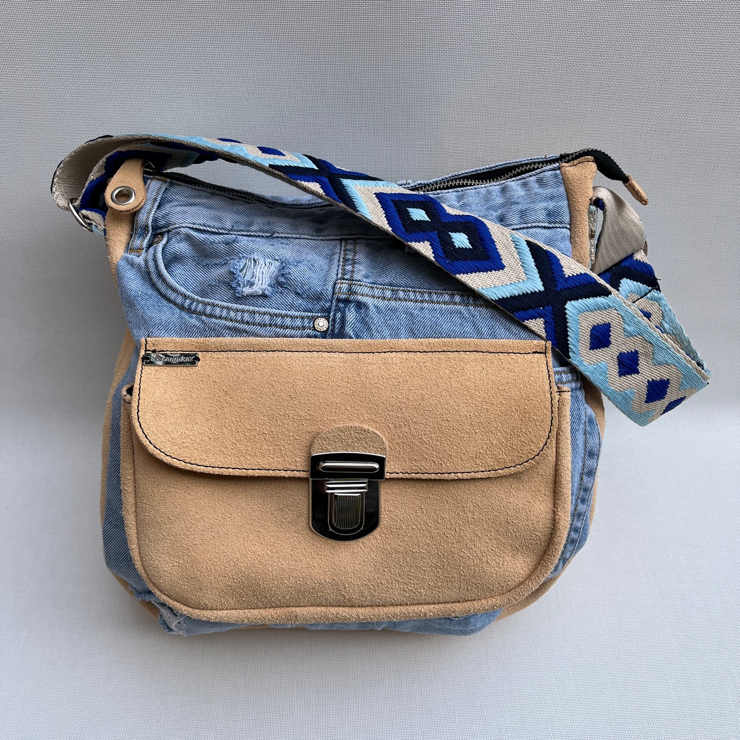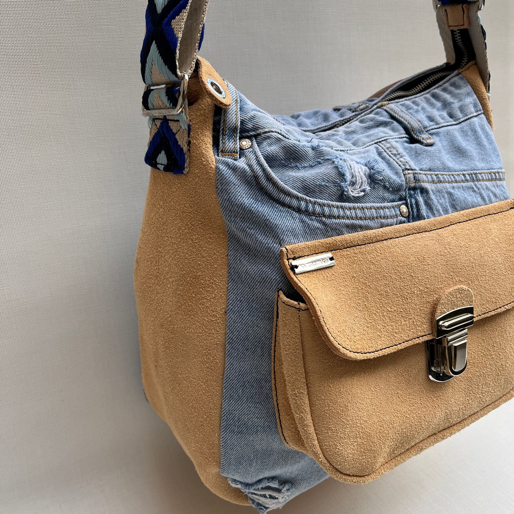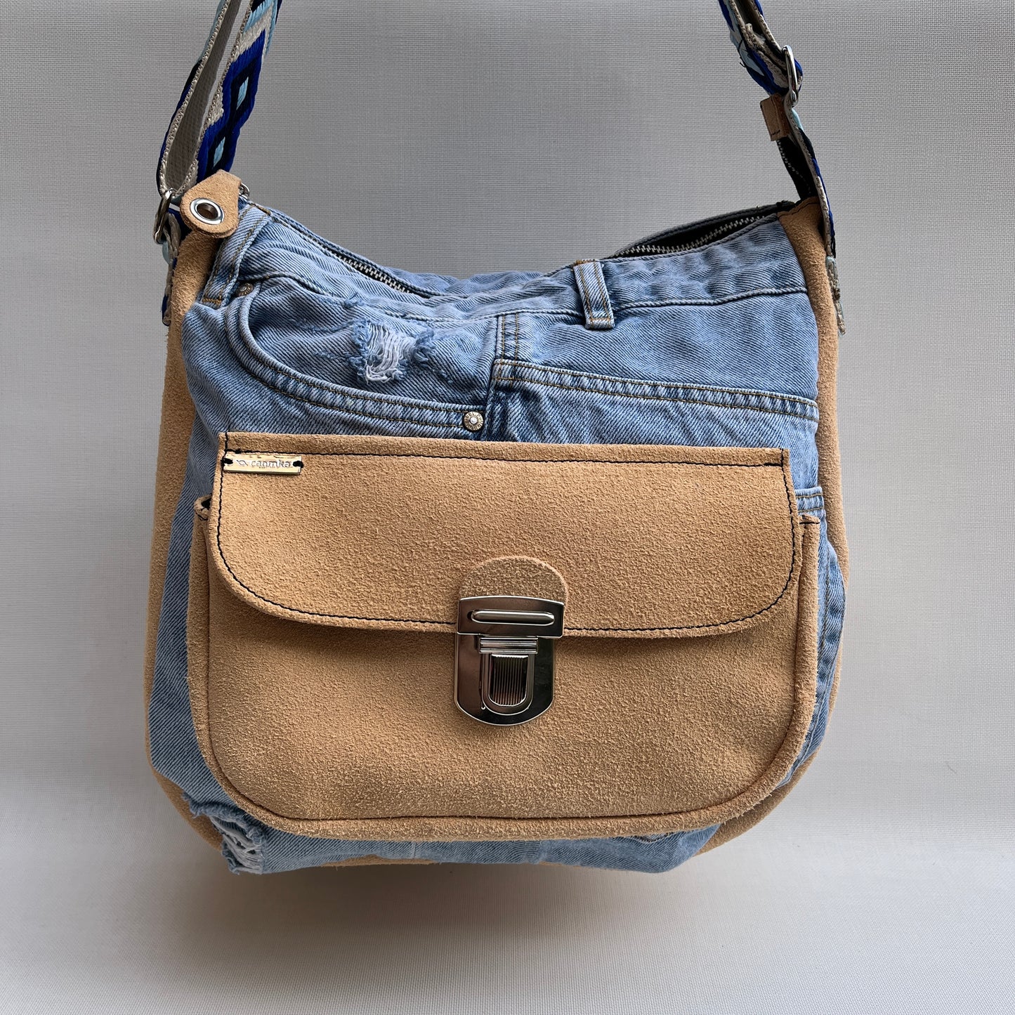 Bolso Tote Caomka confeccionado en piel natural BioCuir® piel girada (serraje) y tejido procedente de vaqueros reutilizados.