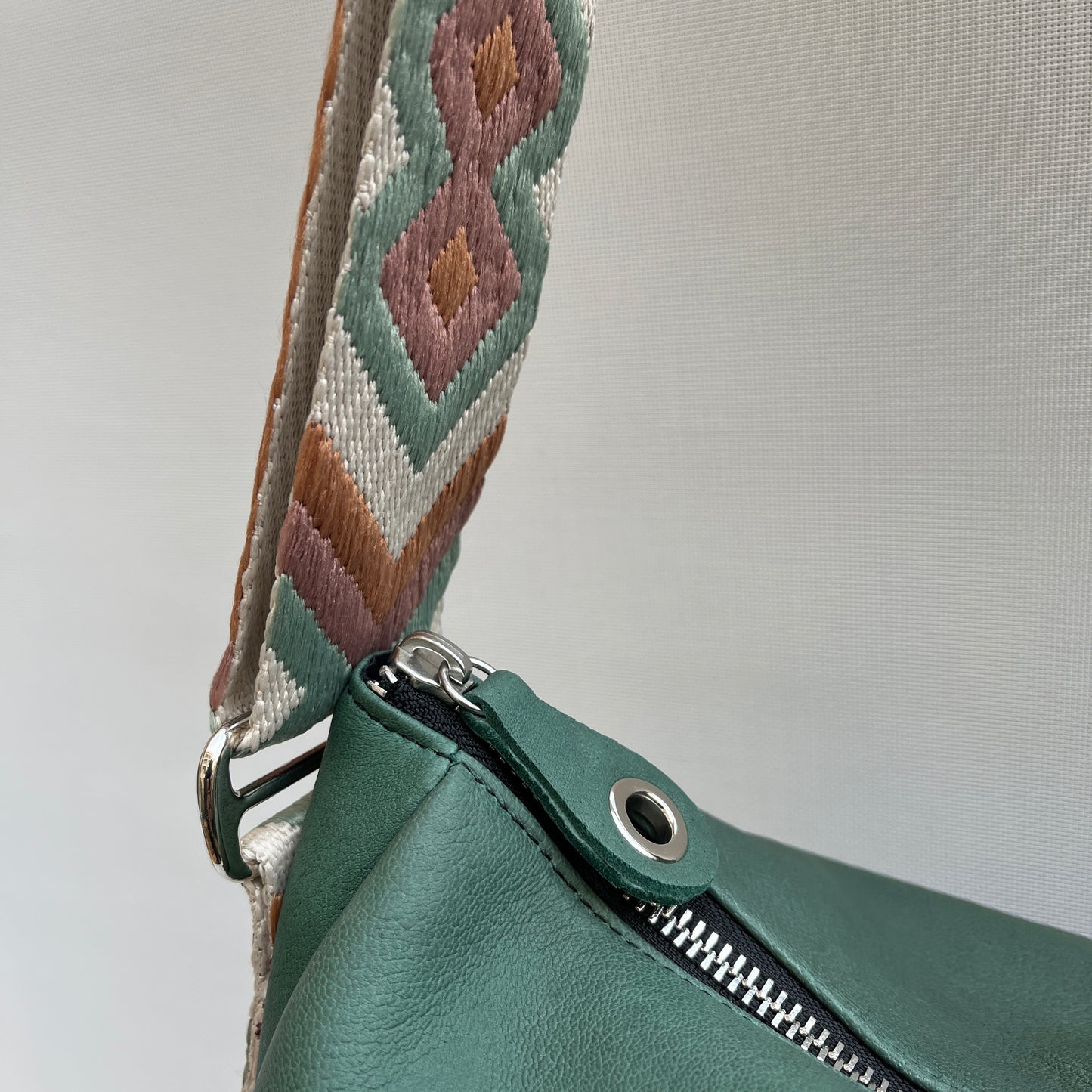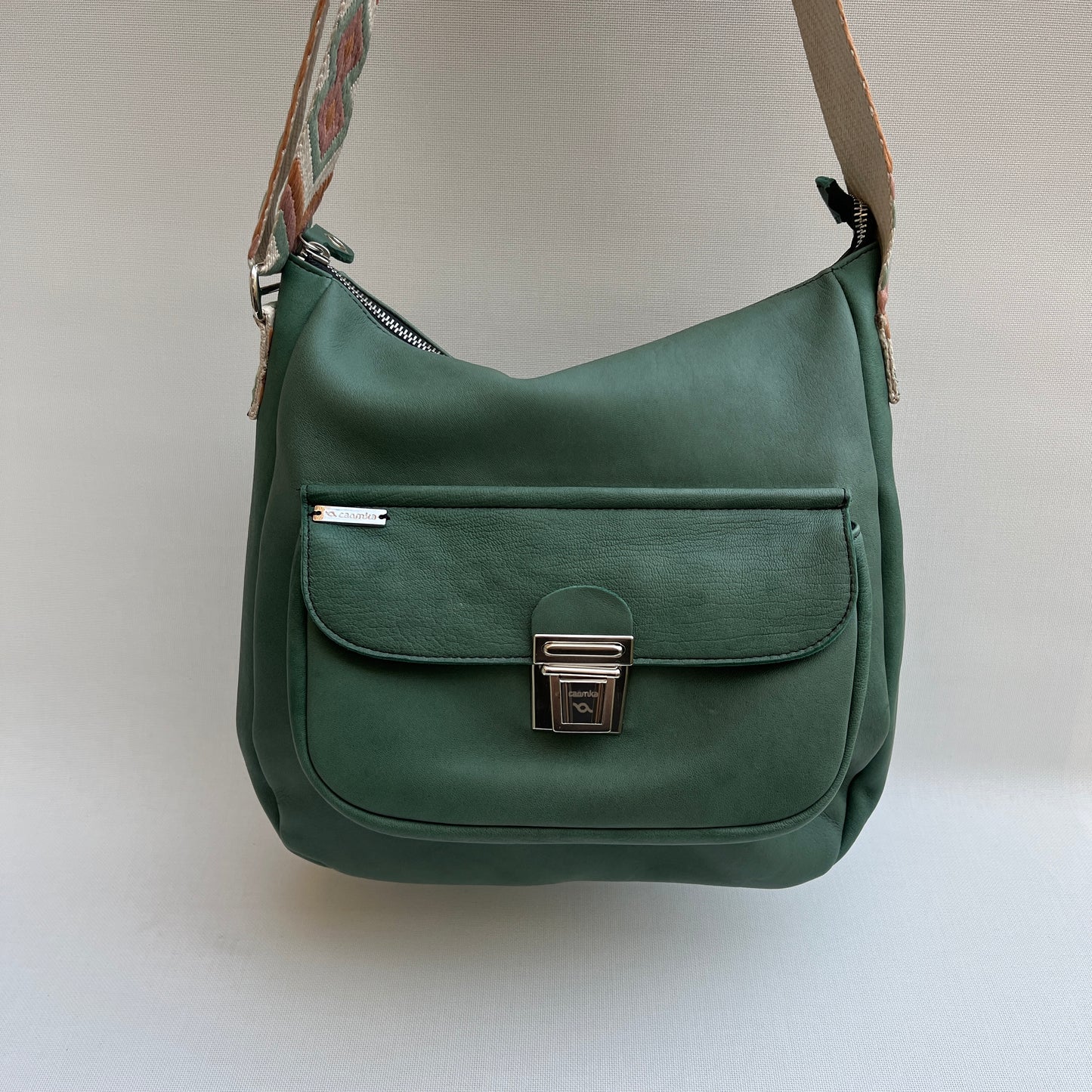 Gran apertura del bolsillo principal con cierre de cremallera en color plata con tirador especial de piel.