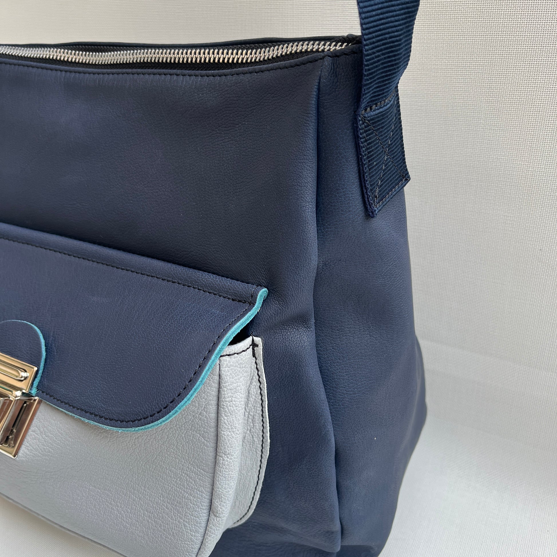 Gran apertura del bolsillo principal con cierre de cremallera en color plata con tirador especial de piel.
