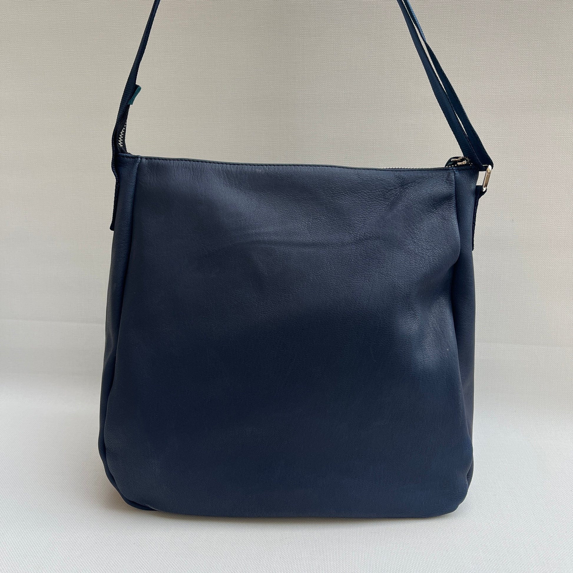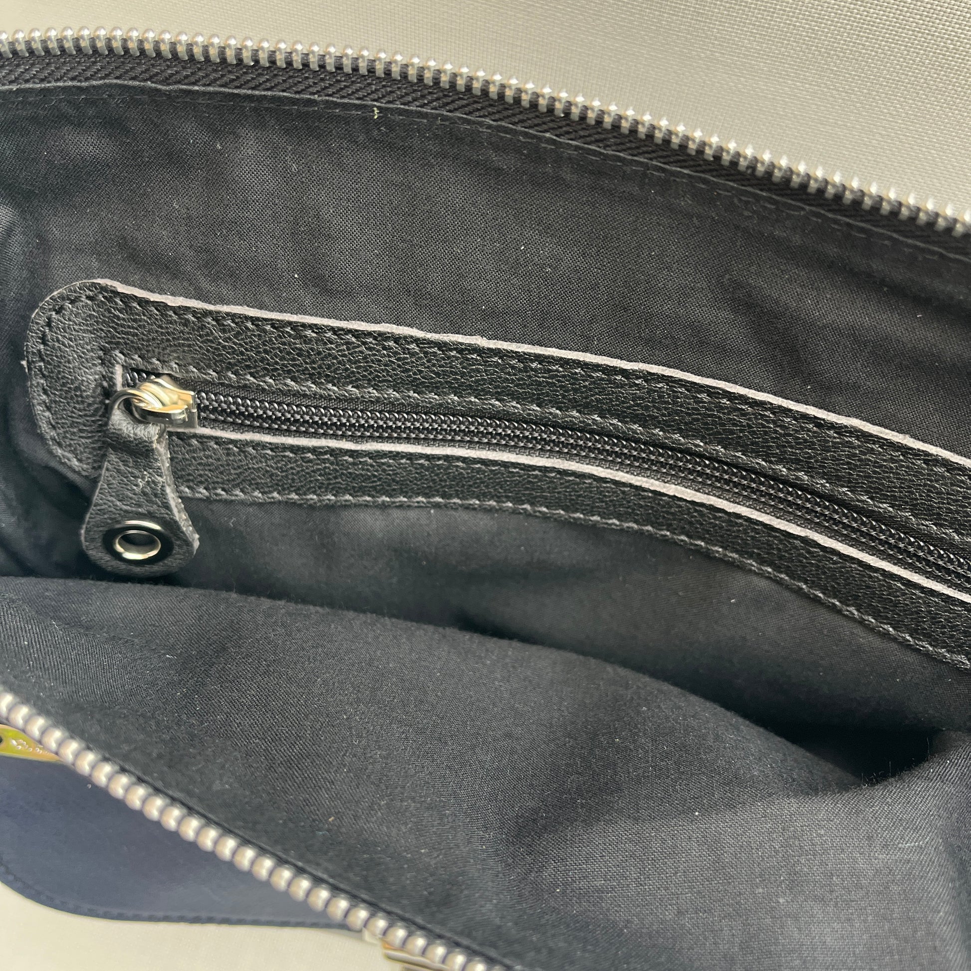 Bolsillo interior con cierre en cremallera plata y tirador especial de piel.