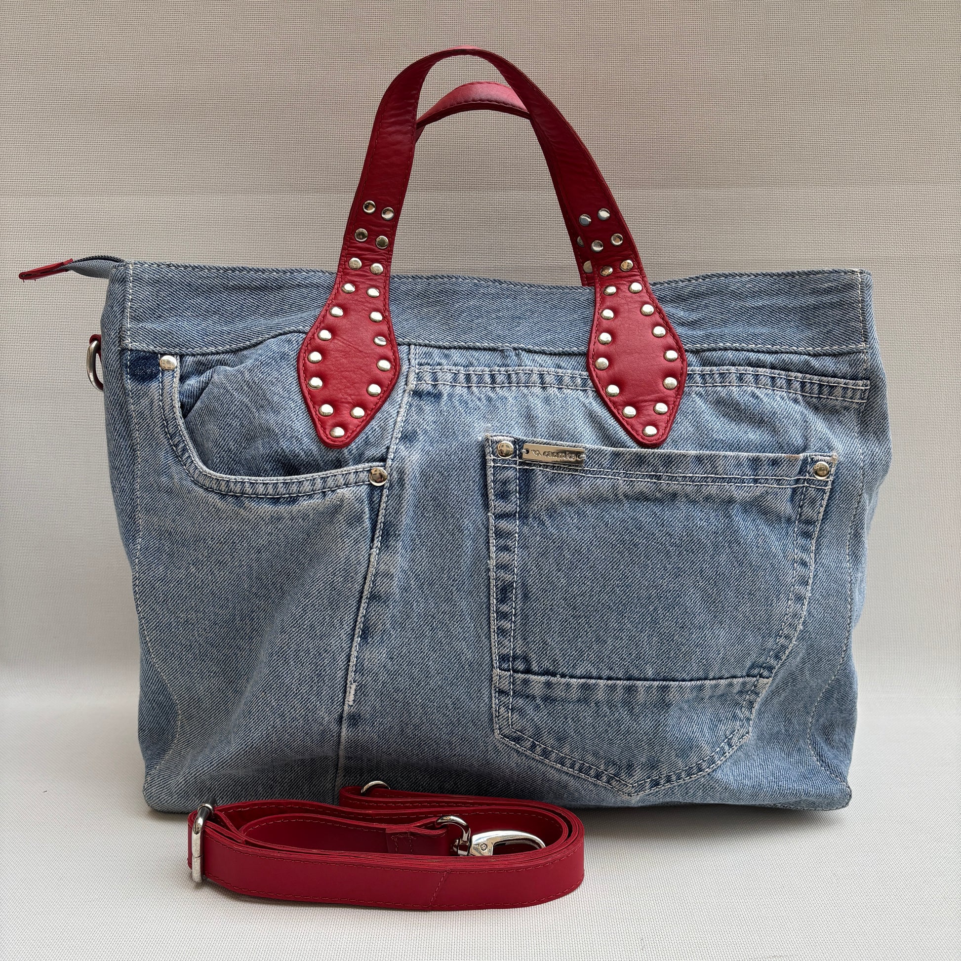 El contraste con las asas y correa en piel roja con tachuelas aporta un punto cañero y sofisticado a la vez, convirtiéndolo en un bolso que no pasa desapercibido.