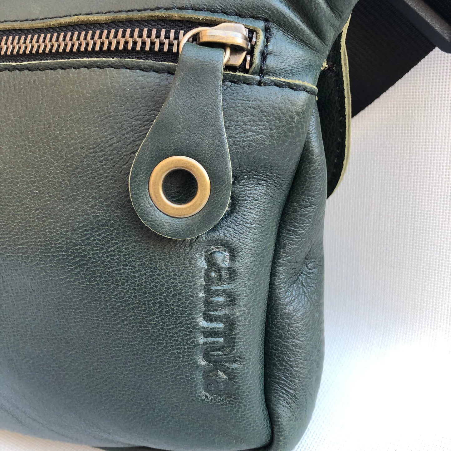 Bolsillo trasero extra con cremallera en Oro Viejo y tirador especial de piel.