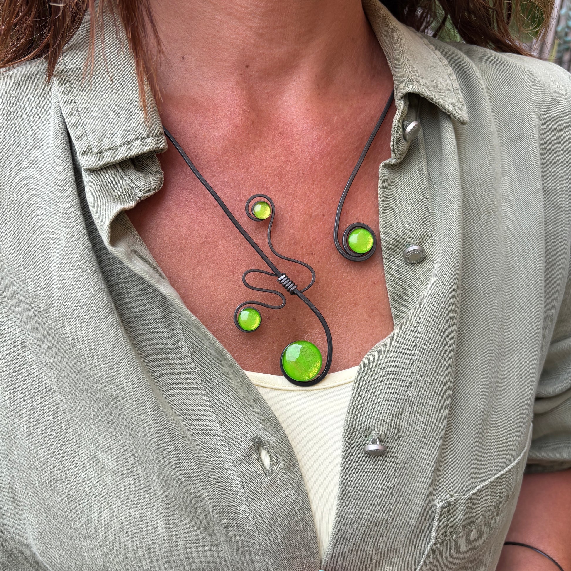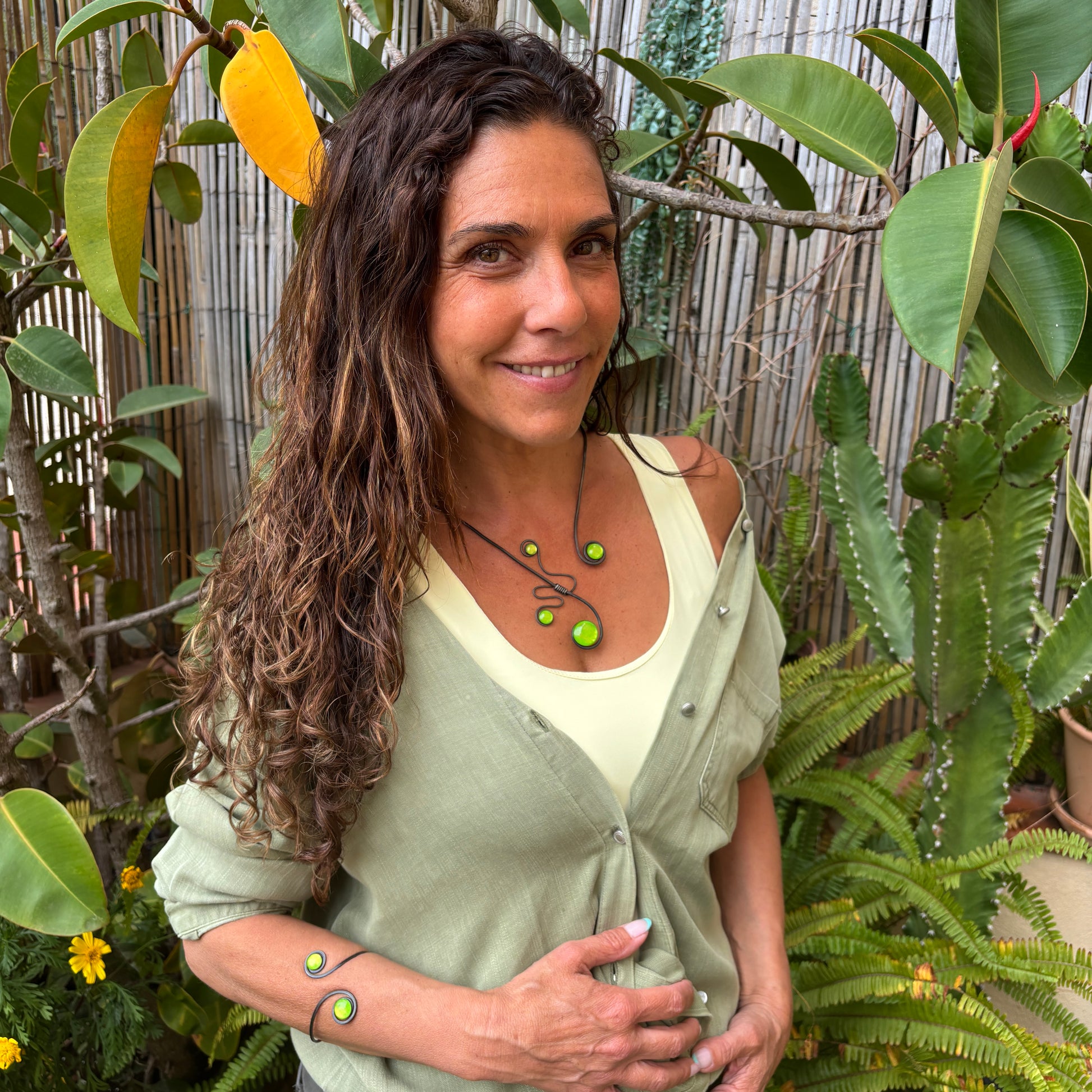 Presentamos el Collar Cuatro Soles Lima · Pieza Única, una creación muy especial de Caomka en colaboración con el artista Mauricio Andrade. Hecho a mano en Barcelona, fusiona la fuerza luminosa del vidrio fundido en color lima con la elegancia escultórica del hierro forjado, en un diseño fluido, artístico y absolutamente irrepetible.