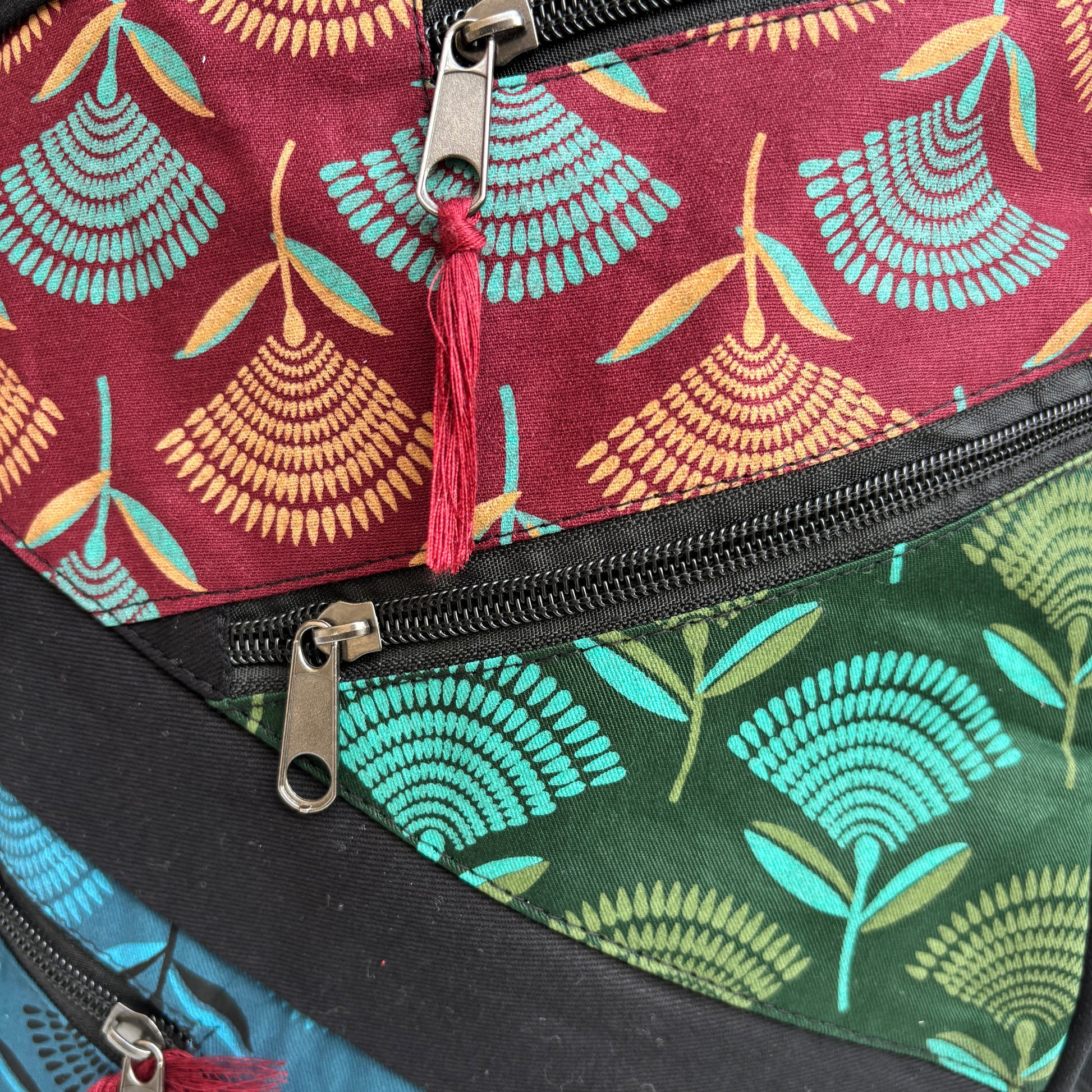 Mochila confeccionada a mano en Kathmandú, Nepal, con las mejores lanas y algodones locales y tintados de manera artesanal con tintes naturales.