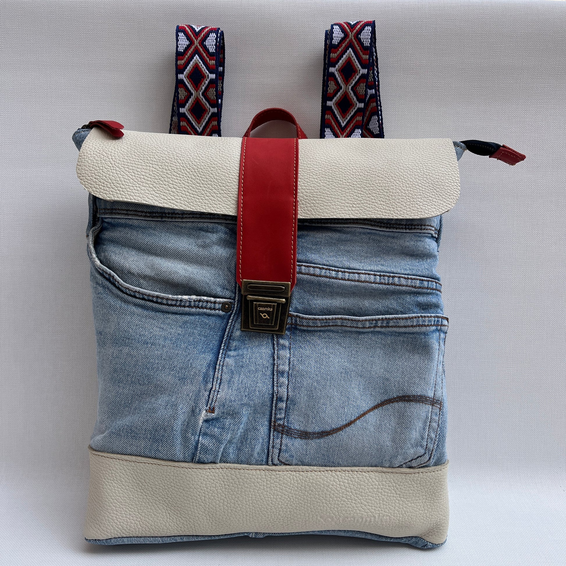 Mochila Caomka ultraligera confeccionada con tejido procedente de vaqueros reutilizados combinados con piel/cuero.