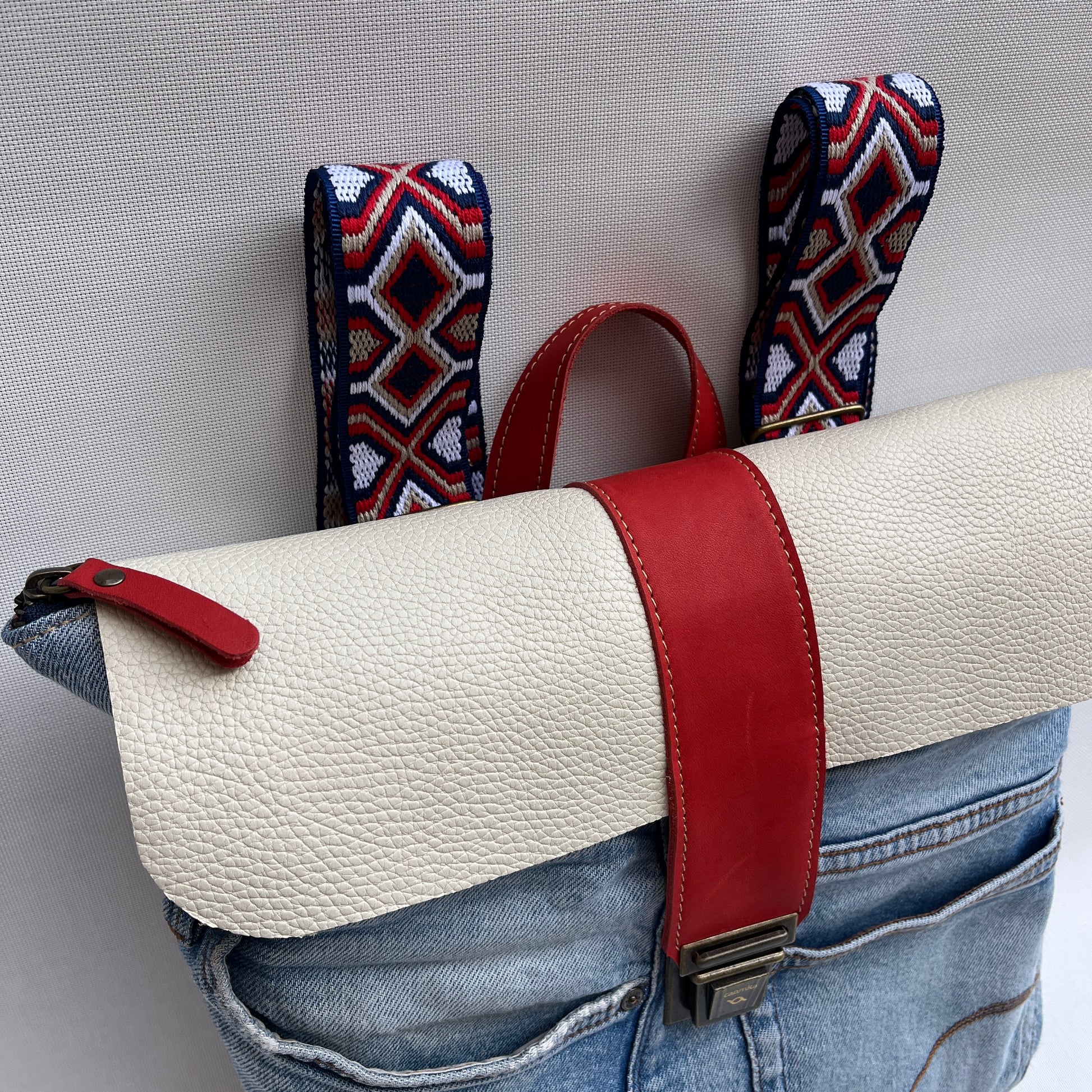 Bolsillo principal delantero en cuero en color contrastado al estilo y personalidad Caomka con cierre vintage "Click Clack" en color oro viejo.
