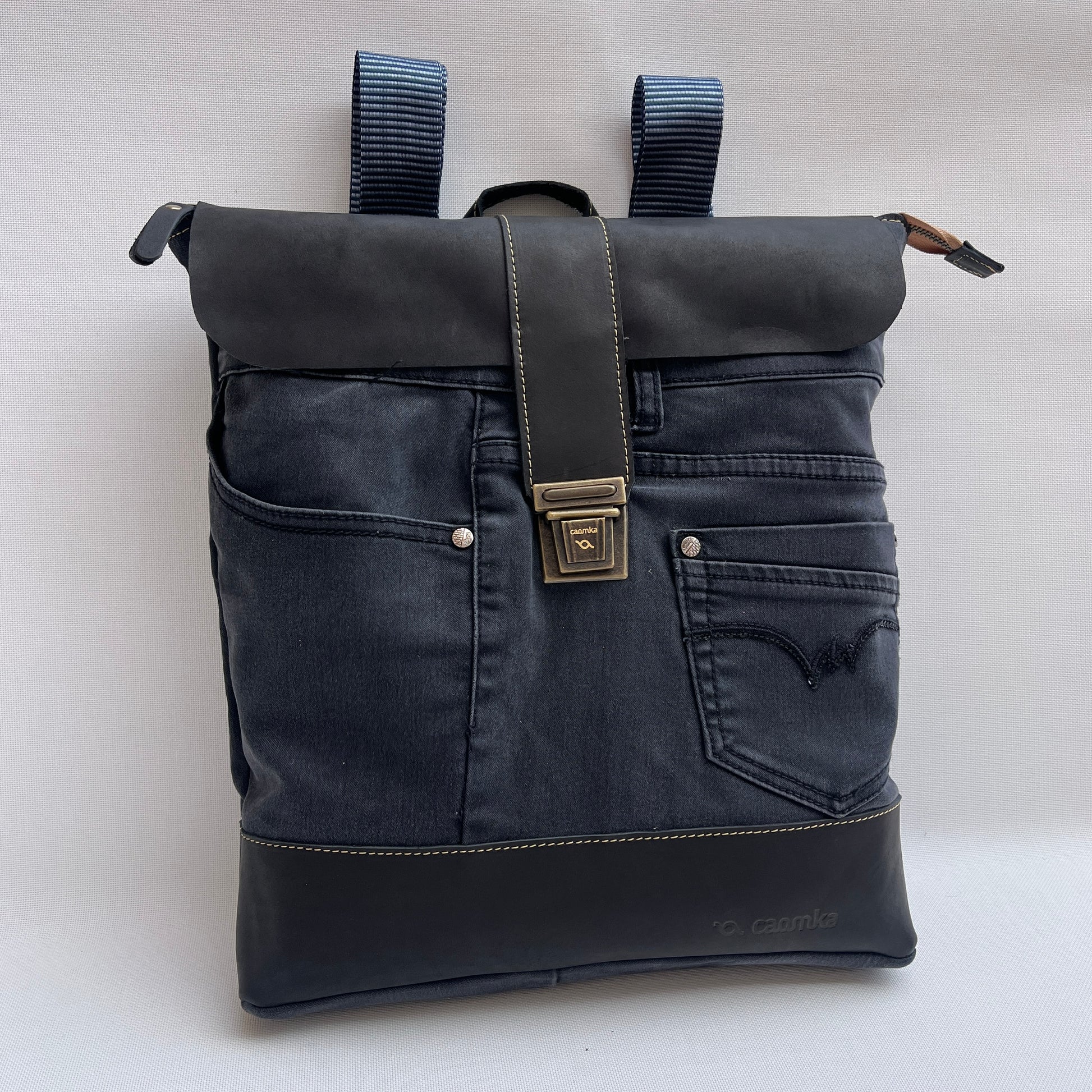 Mochila Caomka ultraligera confeccionada con tejido procedente de vaqueros reutilizados combinados con piel/cuero.