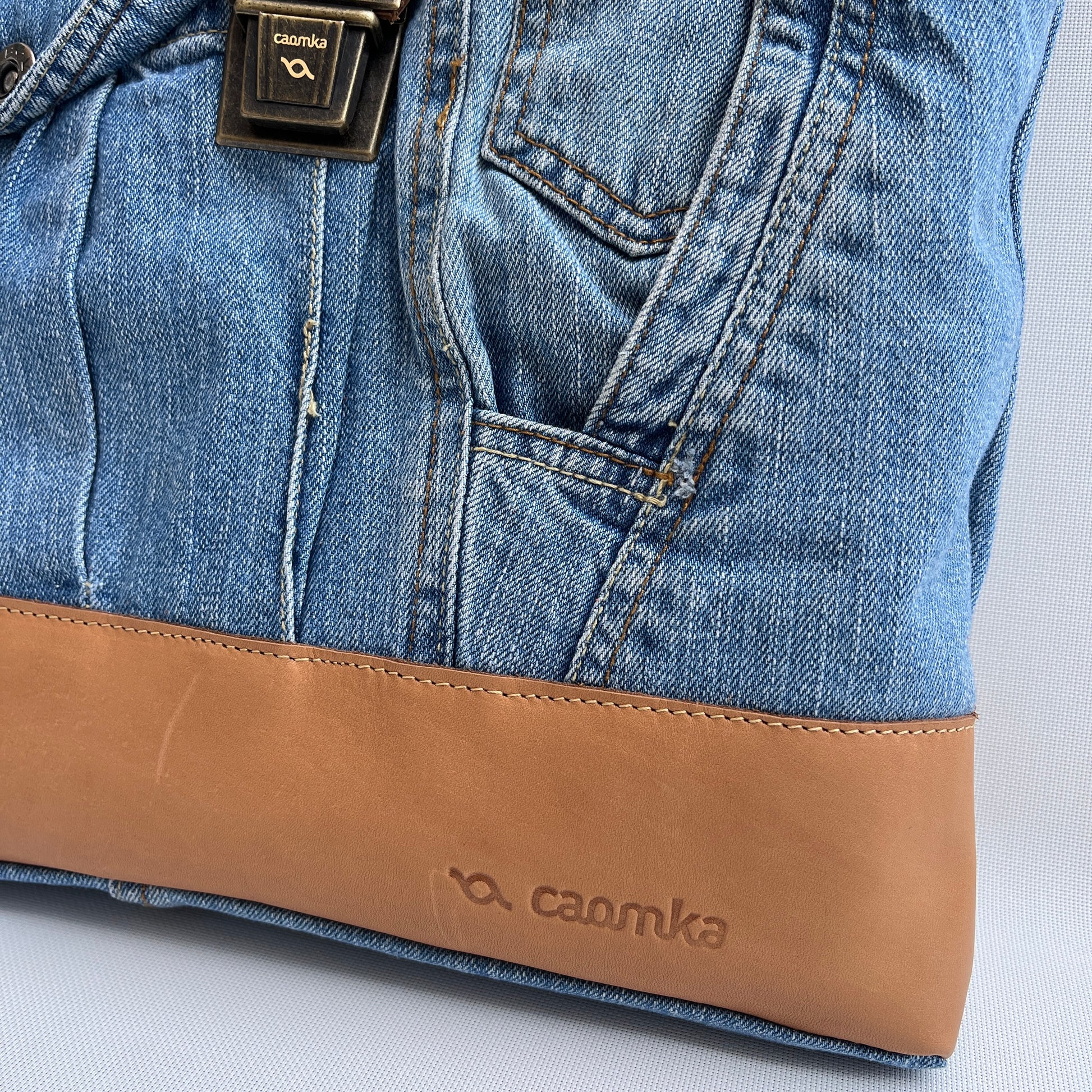Mochila Caomka ultraligera confeccionada con tejido procedente de vaqueros reutilizados combinados con piel/cuero.