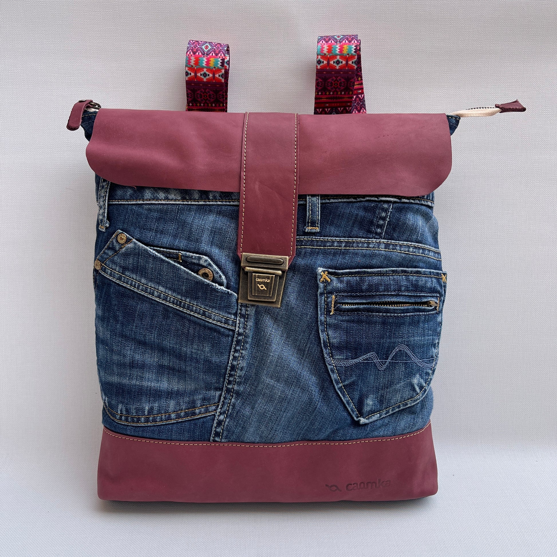 Mochila Caomka ultraligera confeccionada con tejido procedente de vaqueros reutilizados combinados con piel/cuero.