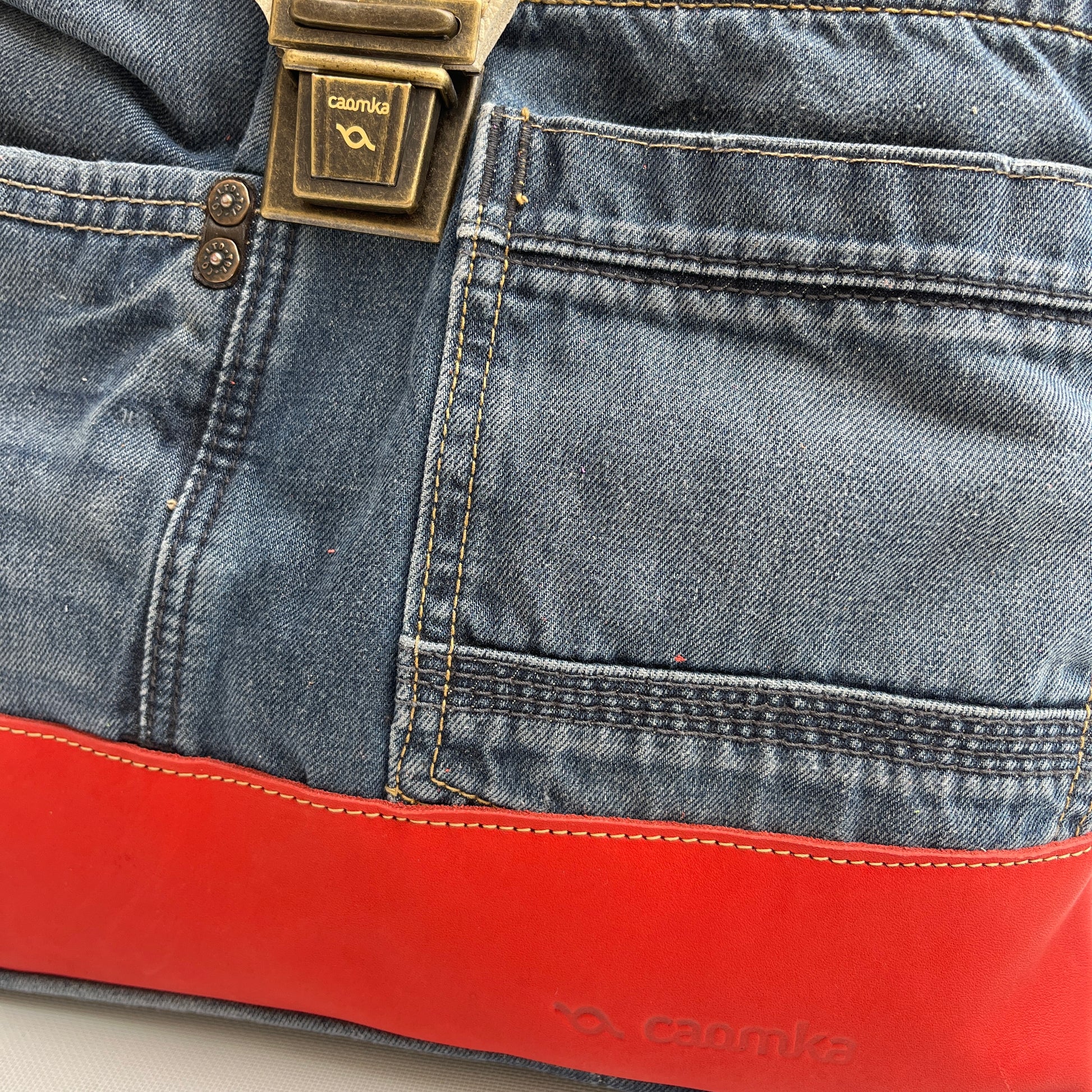 Mochila Caomka ultraligera confeccionada con tejido procedente de vaqueros reutilizados combinados con piel/cuero.