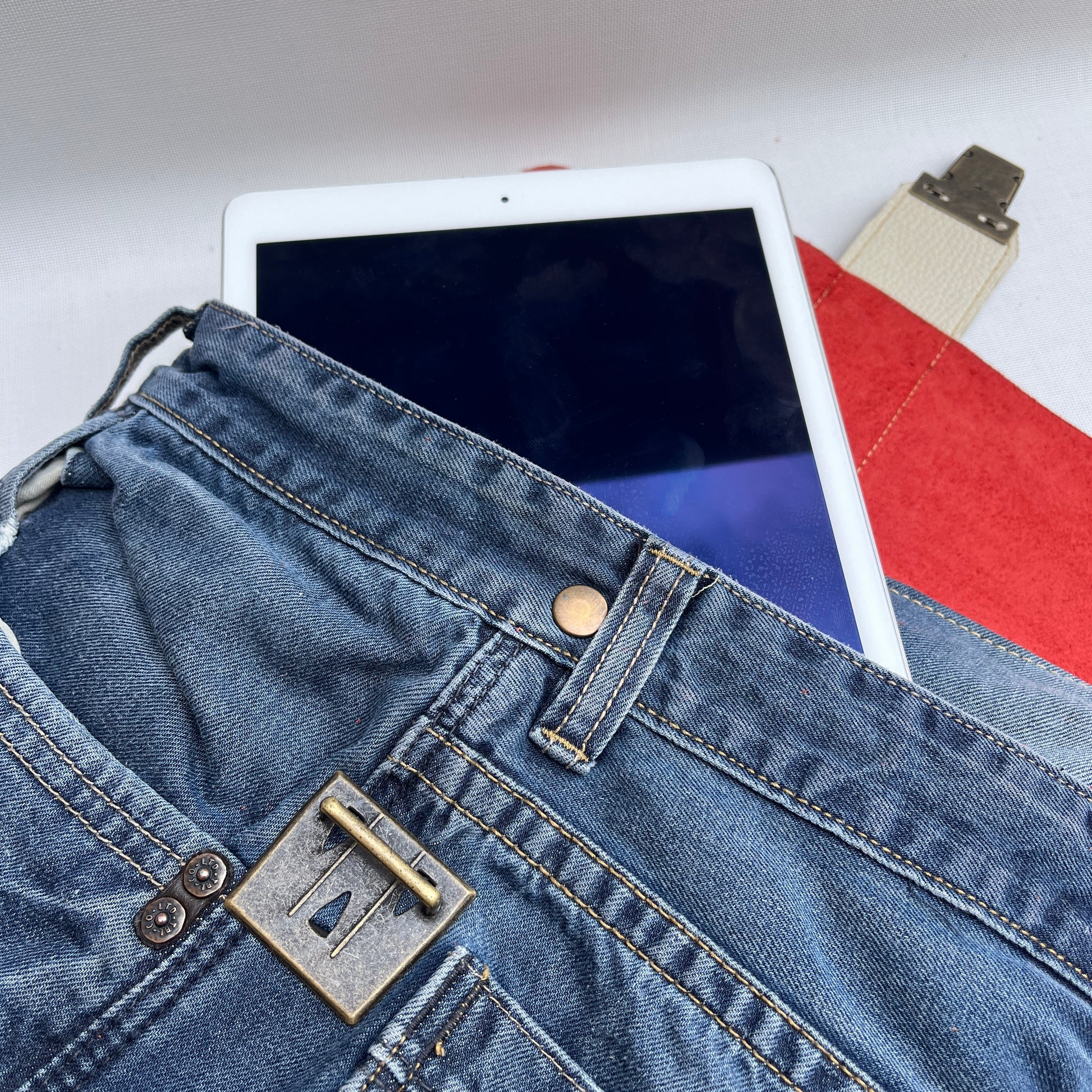 Bolsillo principal delantero en cuero en color contrastado al estilo y personalidad Caomka con cierre vintage "Click Clack" en color oro viejo.