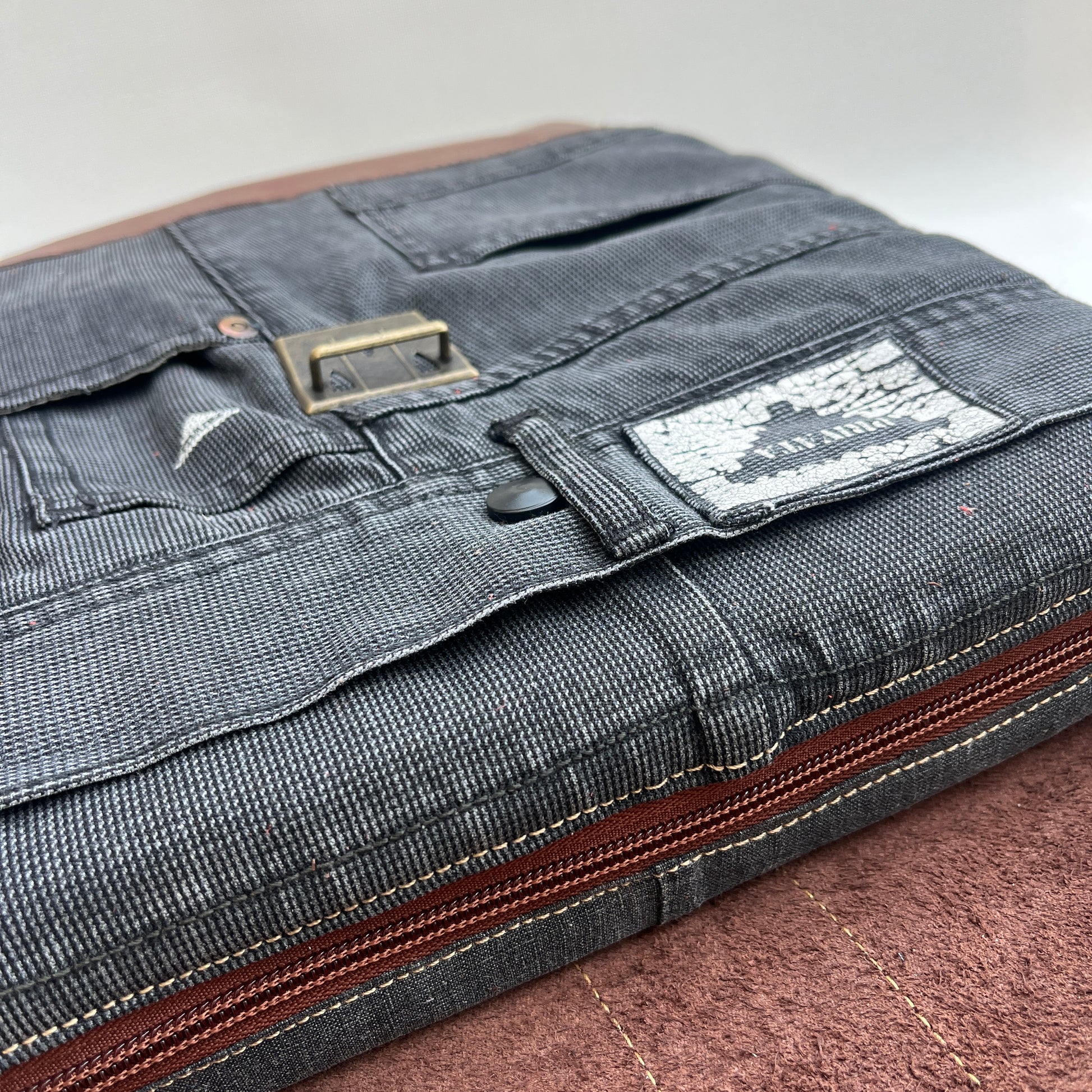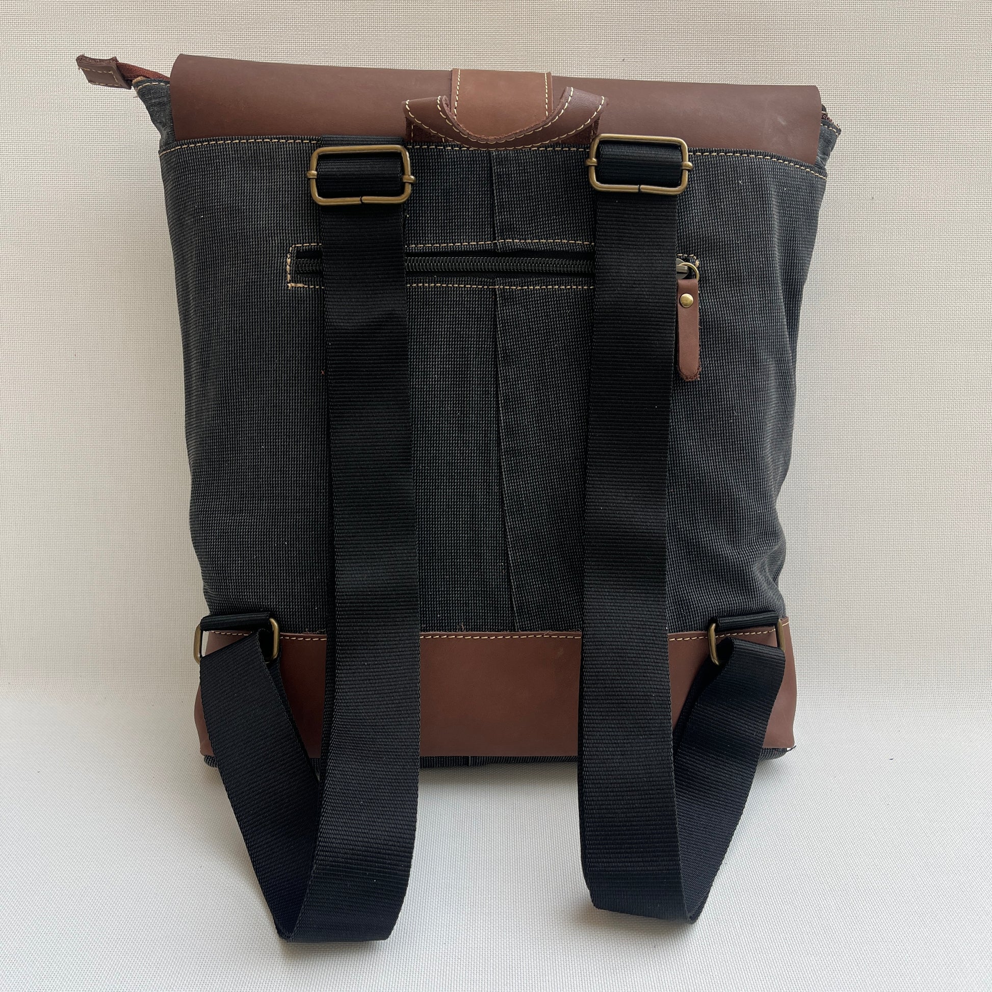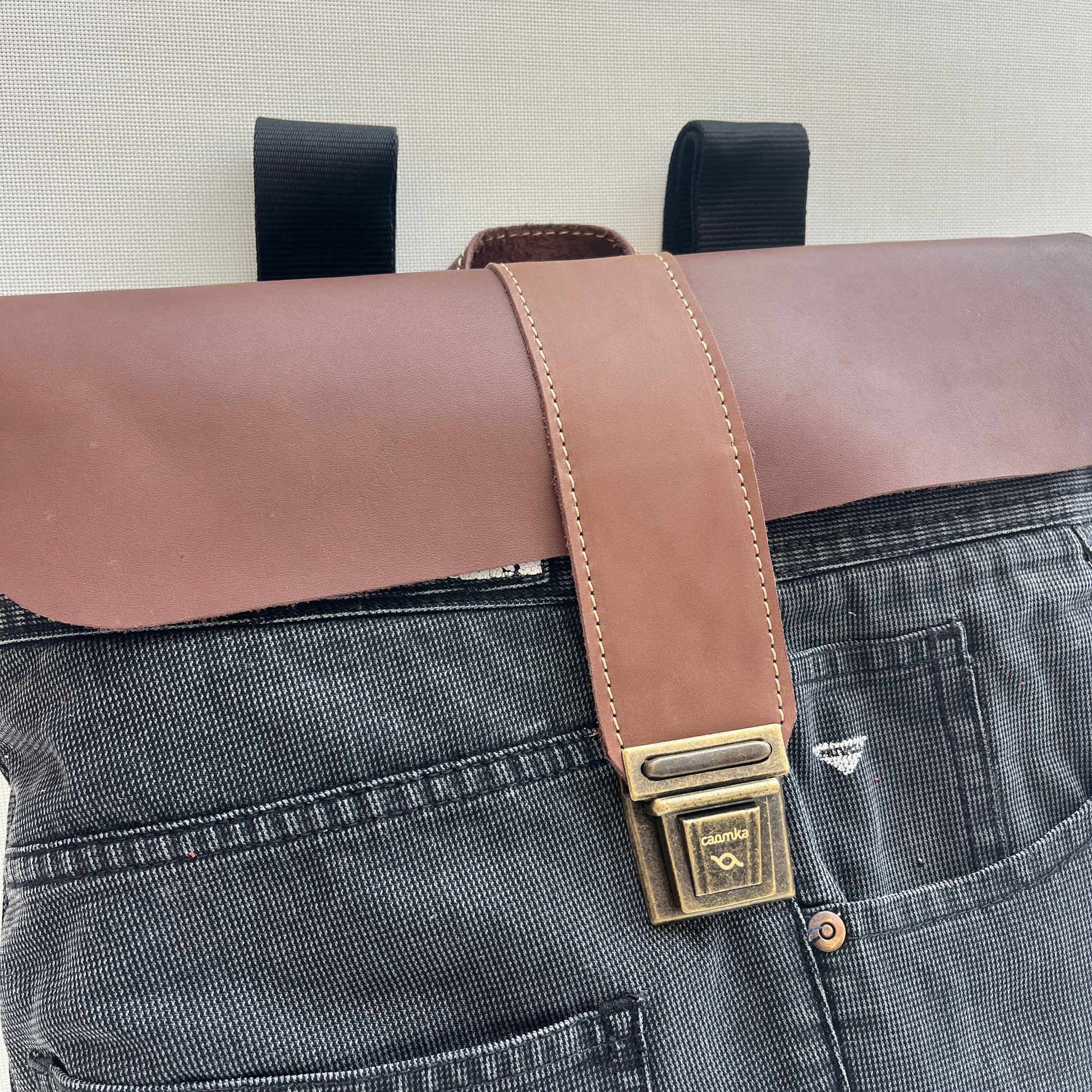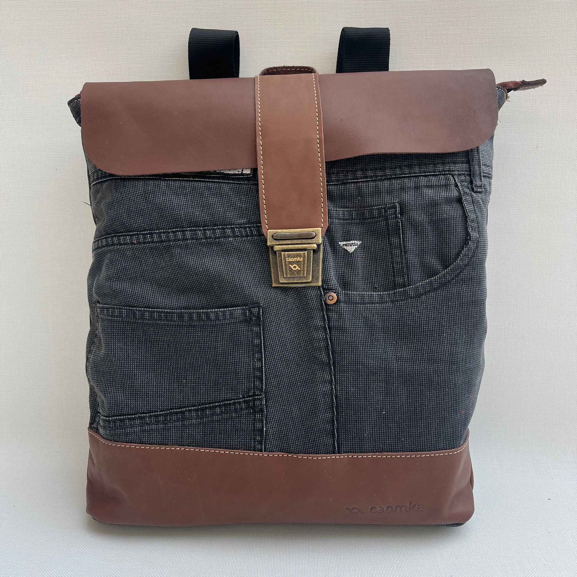 Mochila Caomka ultraligera confeccionada con tejido procedente de vaqueros reutilizados combinados con piel/cuero.