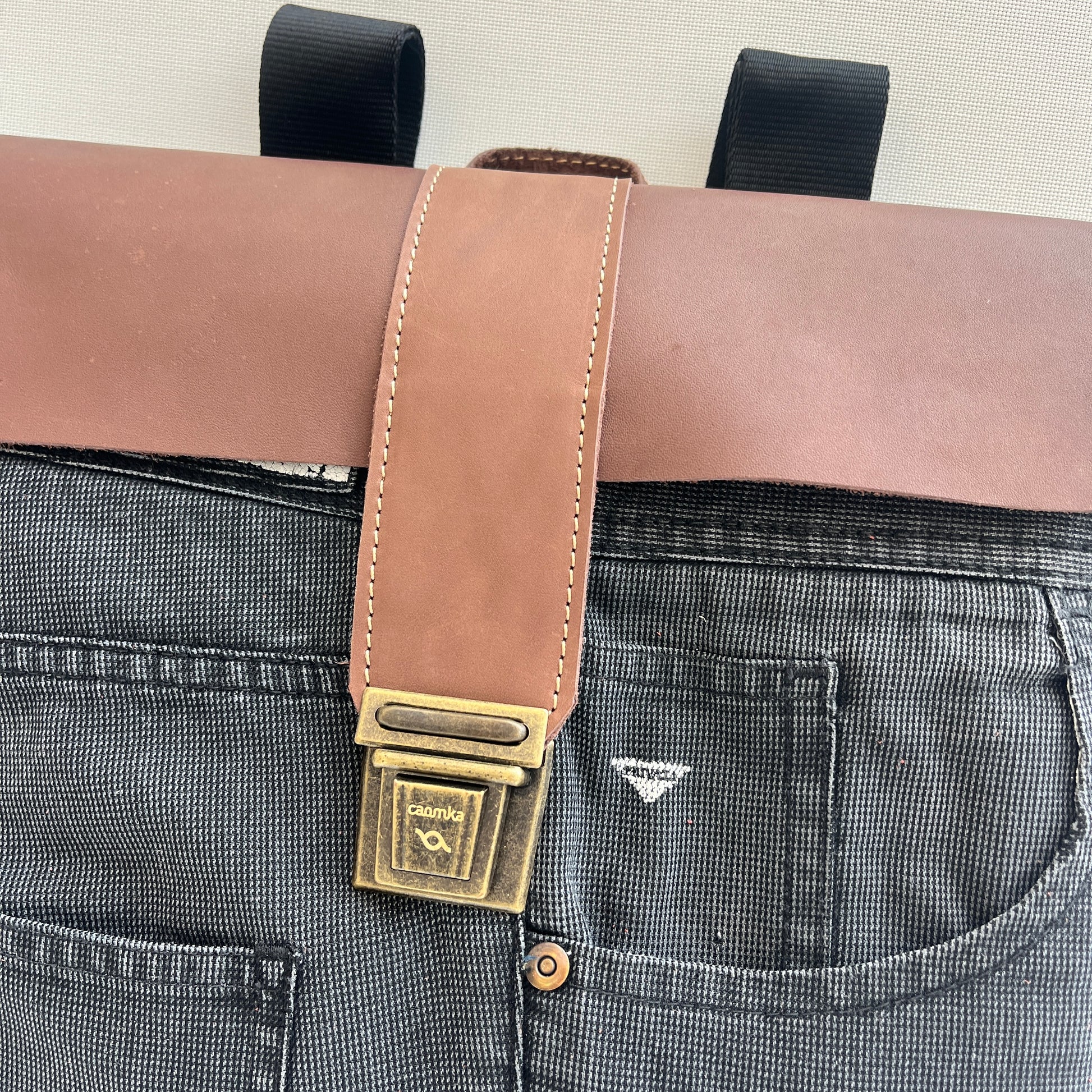 Bolsillo principal delantero en cuero en color contrastado al estilo y personalidad Caomka con cierre vintage "Click Clack" en color oro viejo.