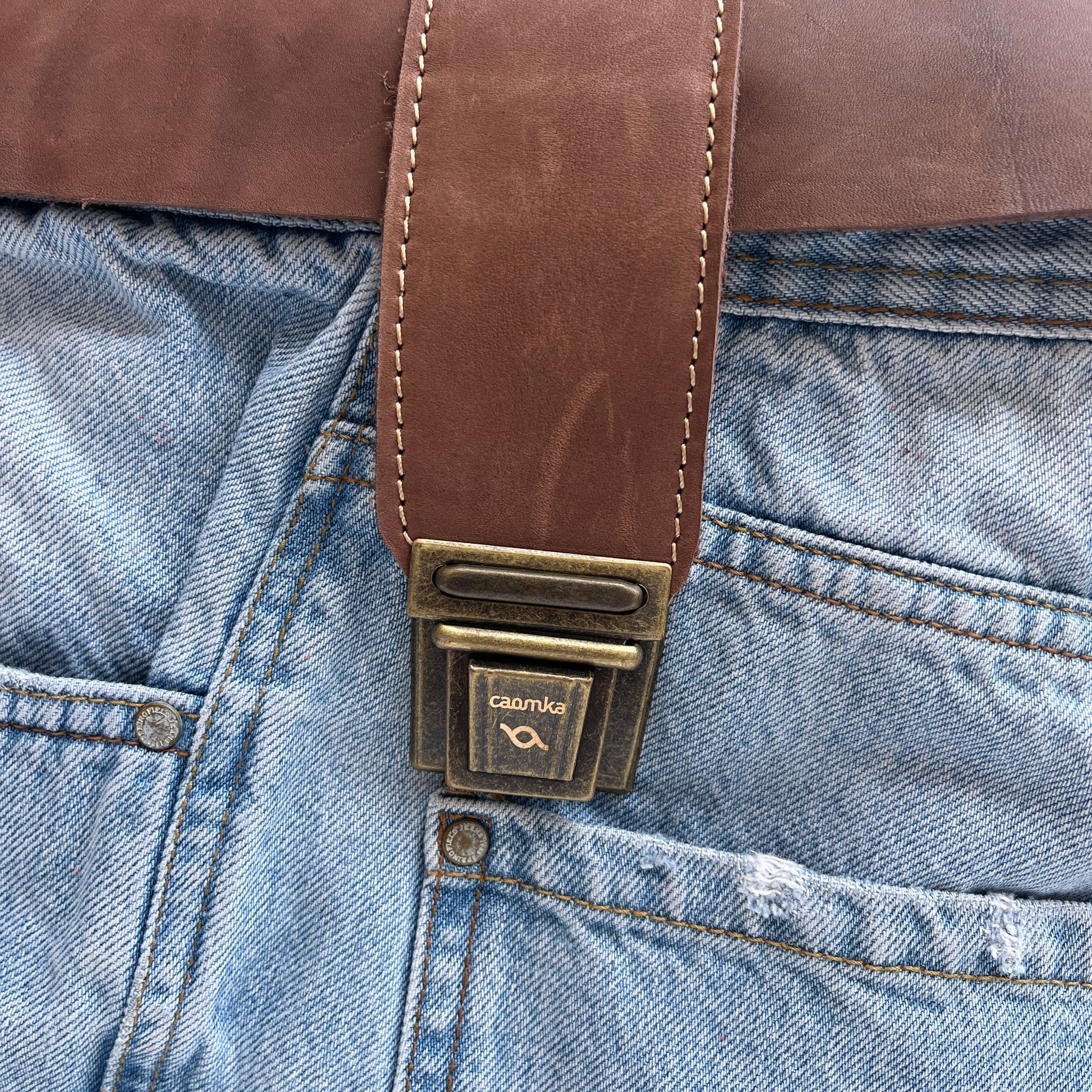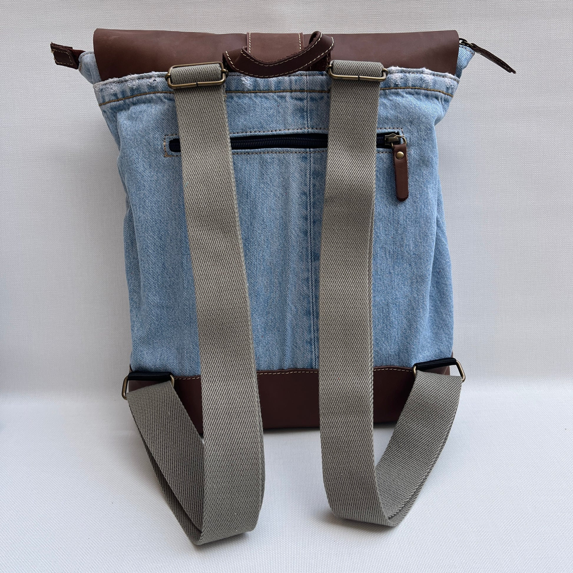 Mochila Caomka ultraligera confeccionada con tejido procedente de vaqueros reutilizados combinados con piel/cuero.