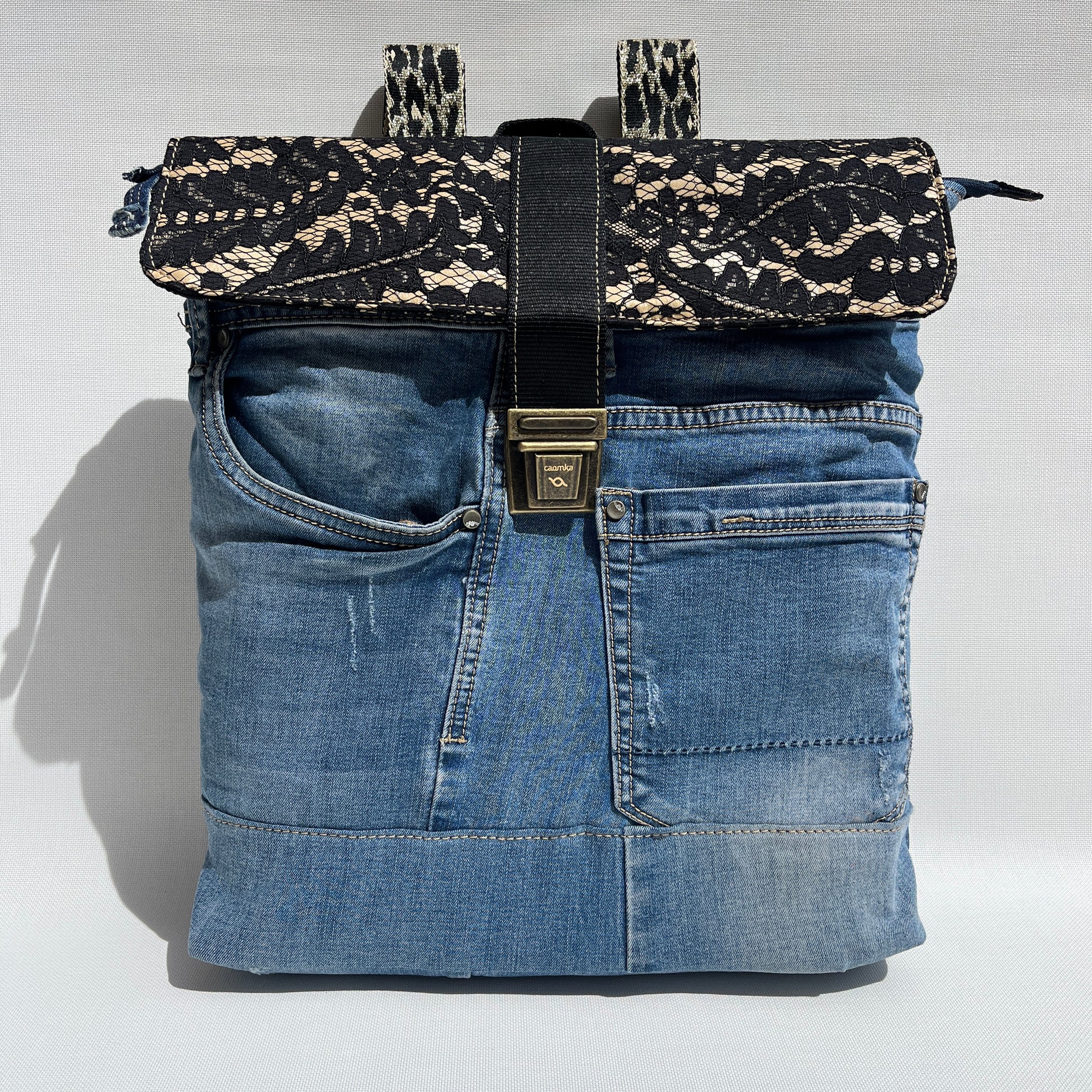 Mochila Caomka ultraligera confeccionada con tejido procedente de vaqueros reutilizados combinados con polipiel (piel vegana).