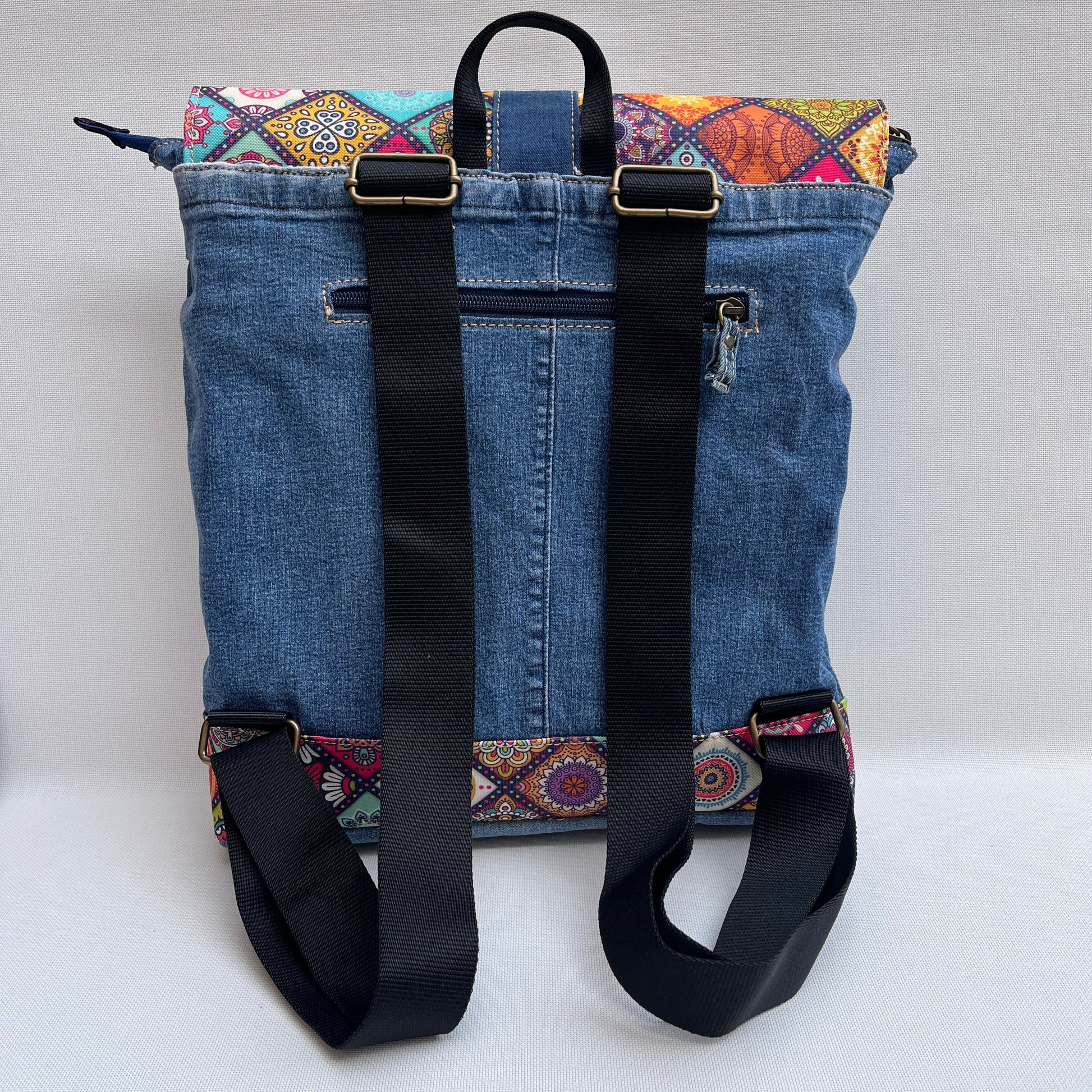 Mochila Caomka ultraligera confeccionada con tejido procedente de vaqueros reutilizados combinados con tejido de Mandalas Caomka.