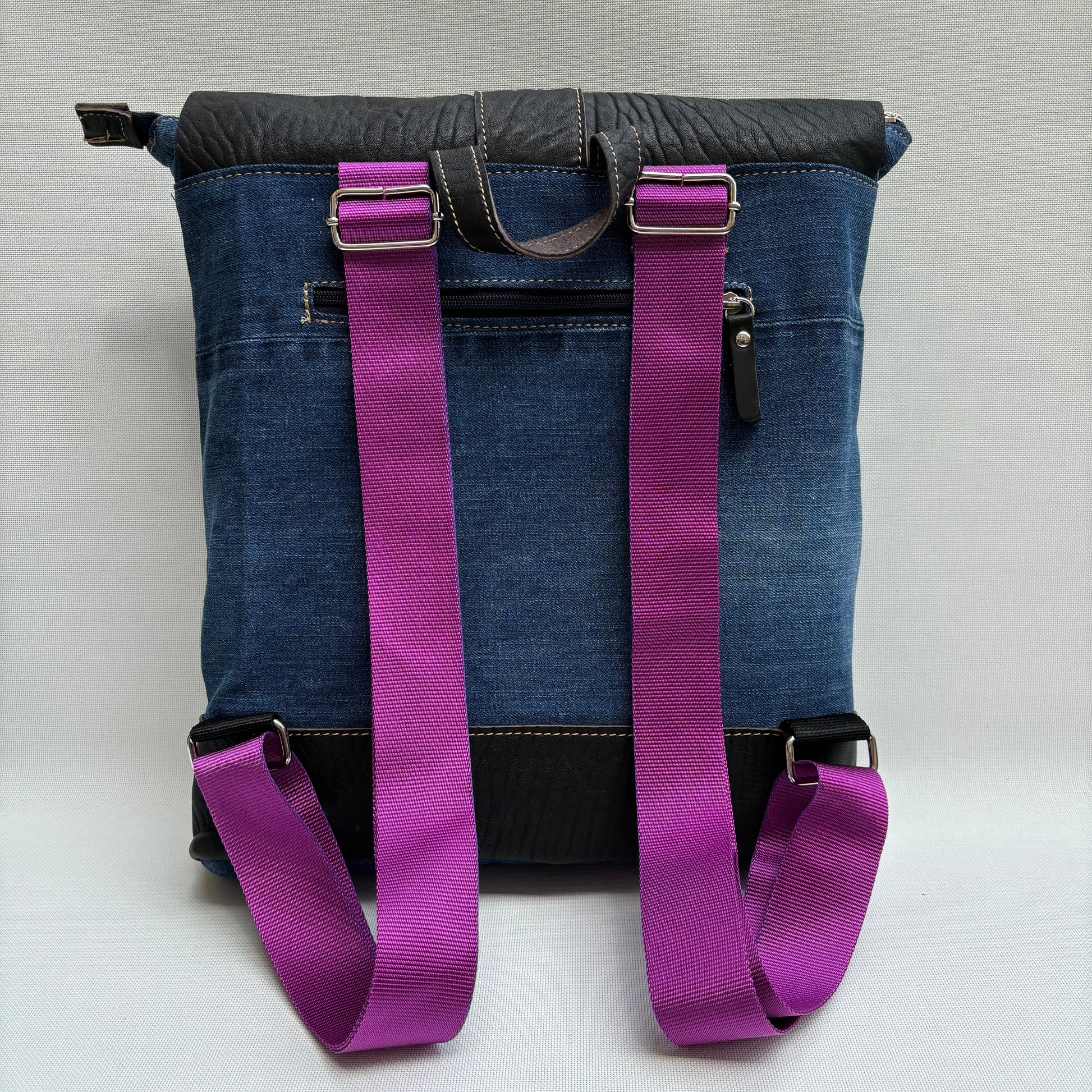Mochila Caomka ultraligera confeccionada con tejido procedente de vaqueros reutilizados combinados con piel/cuero.