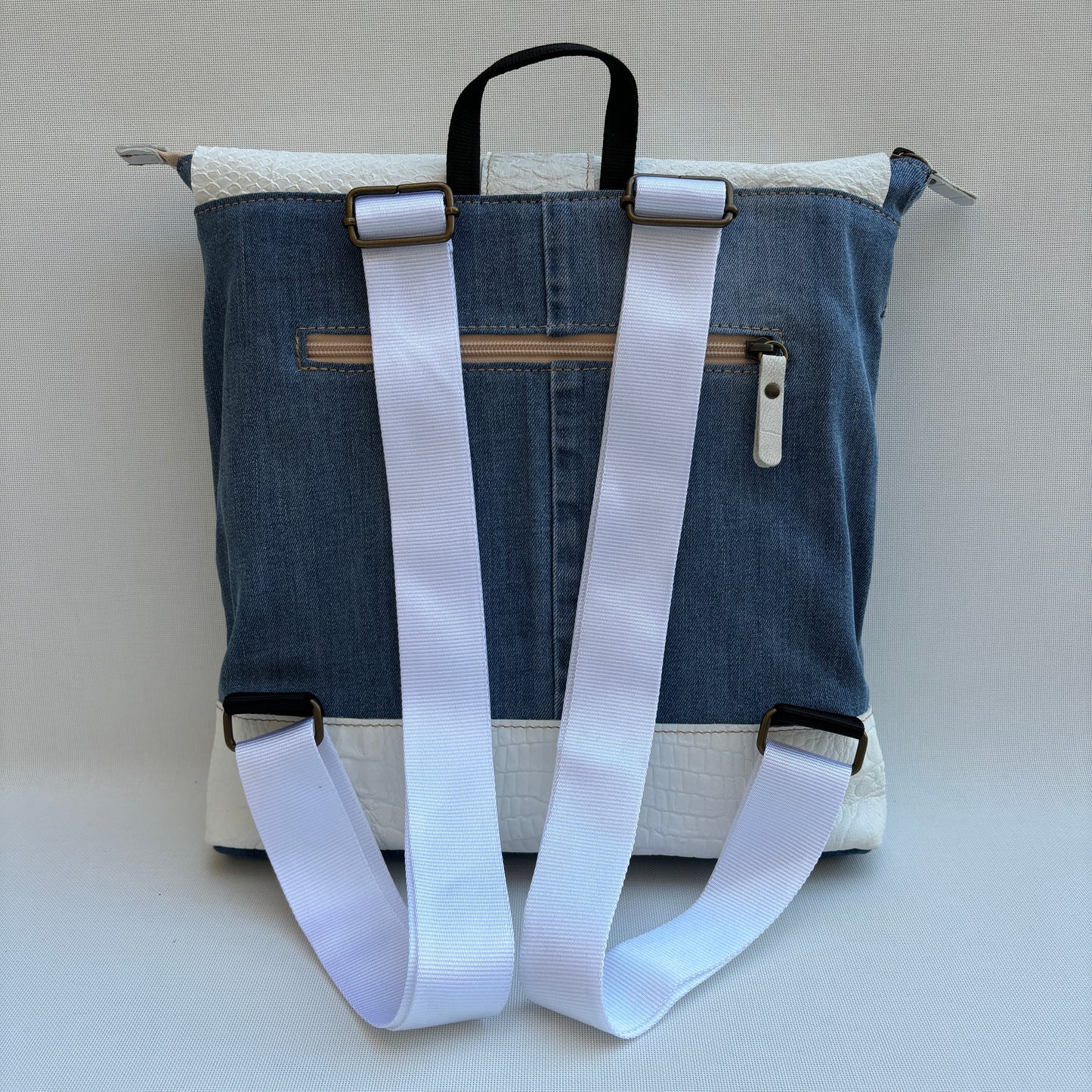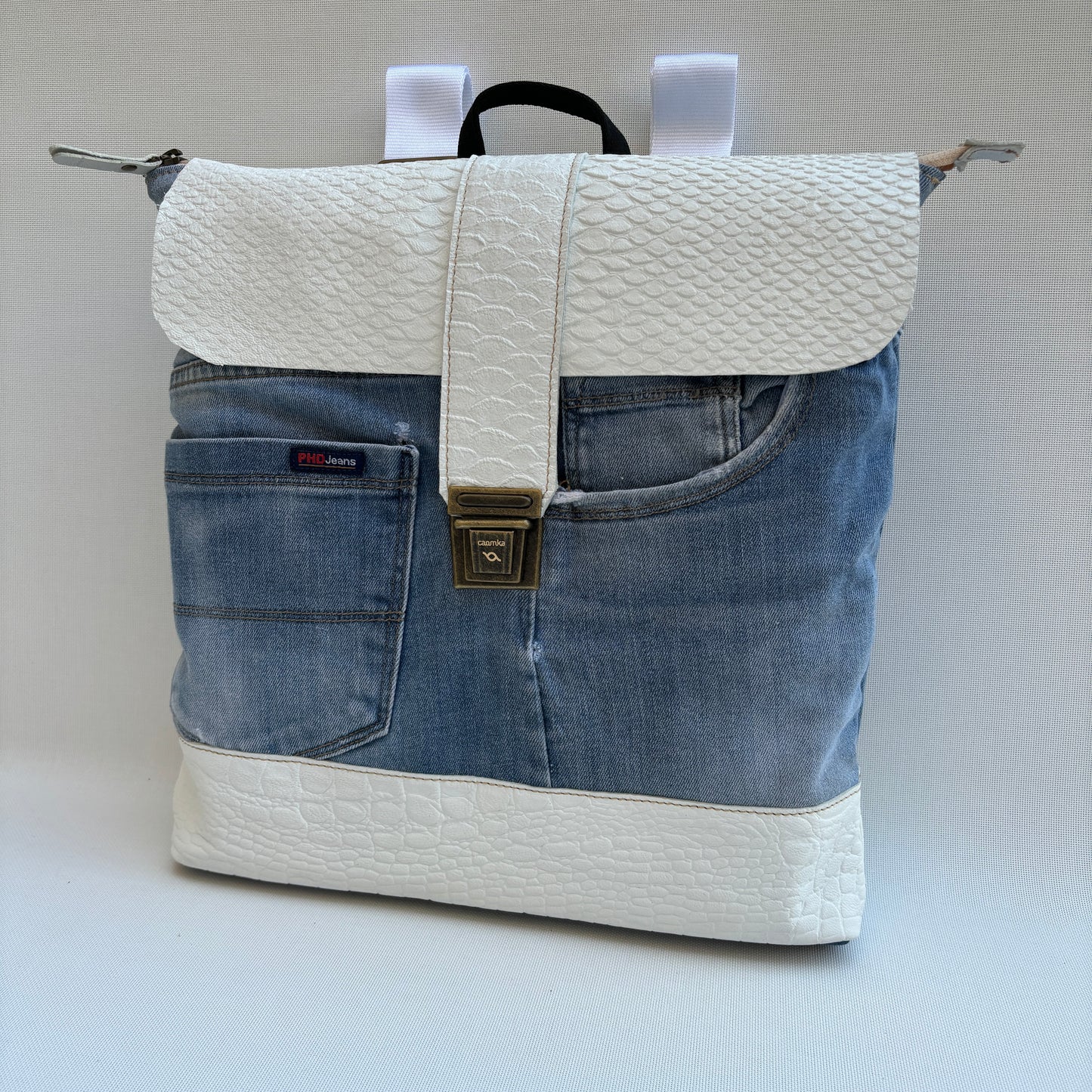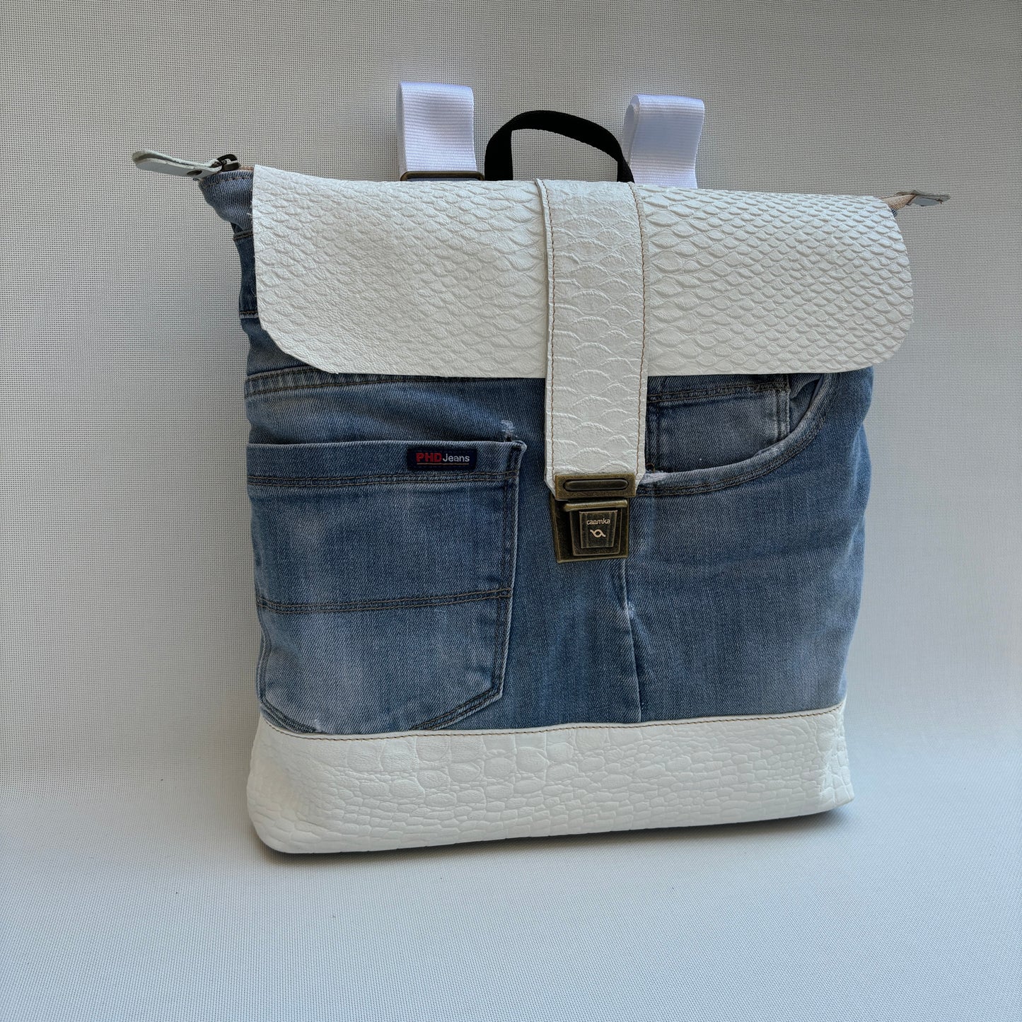 Mochila Caomka ultraligera confeccionada con tejido procedente de vaqueros reutilizados combinados con piel/cuero.