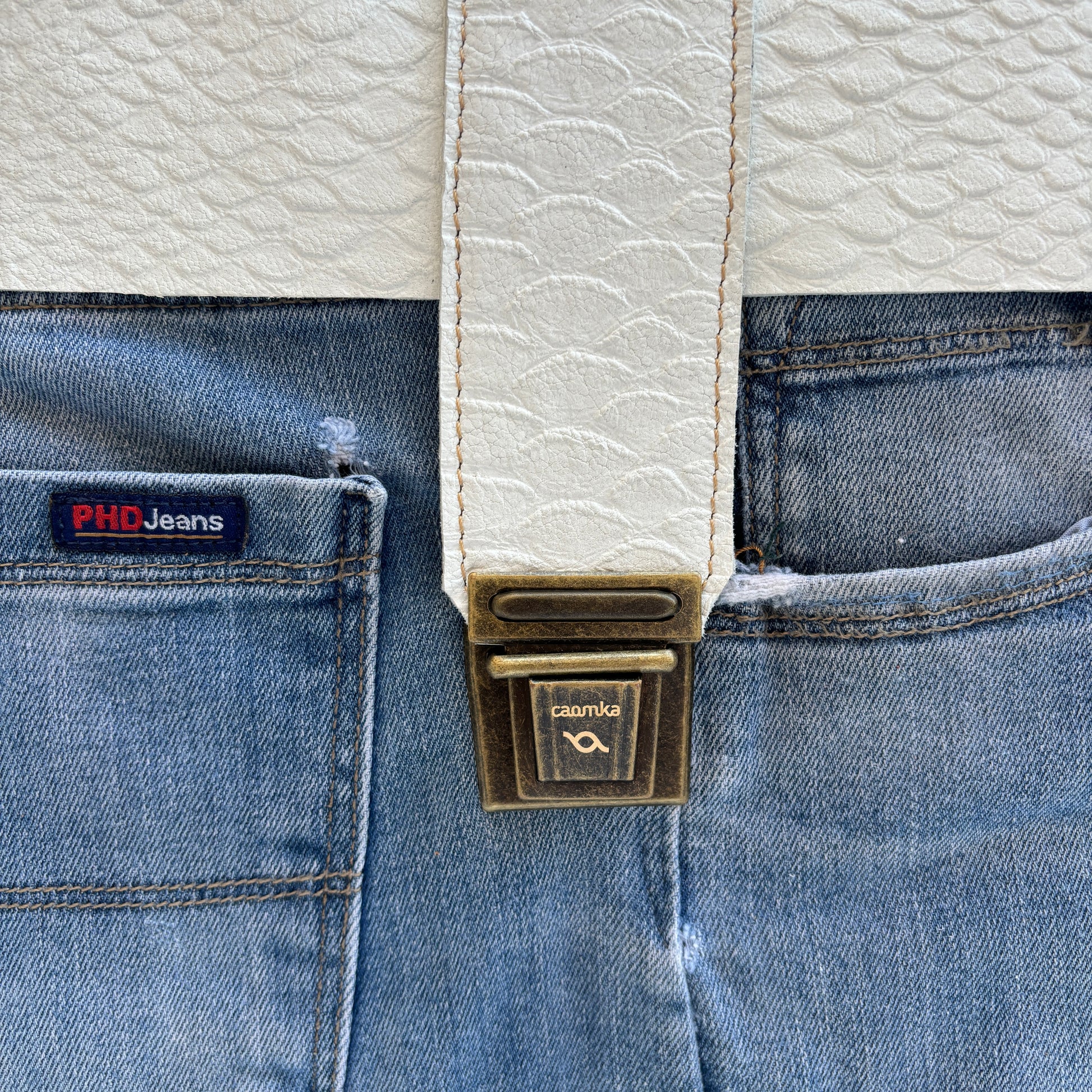 Bolsillo principal delantero en cuero en color contrastado al estilo y personalidad Caomka con cierre vintage "Click Clack" en color oro viejo.