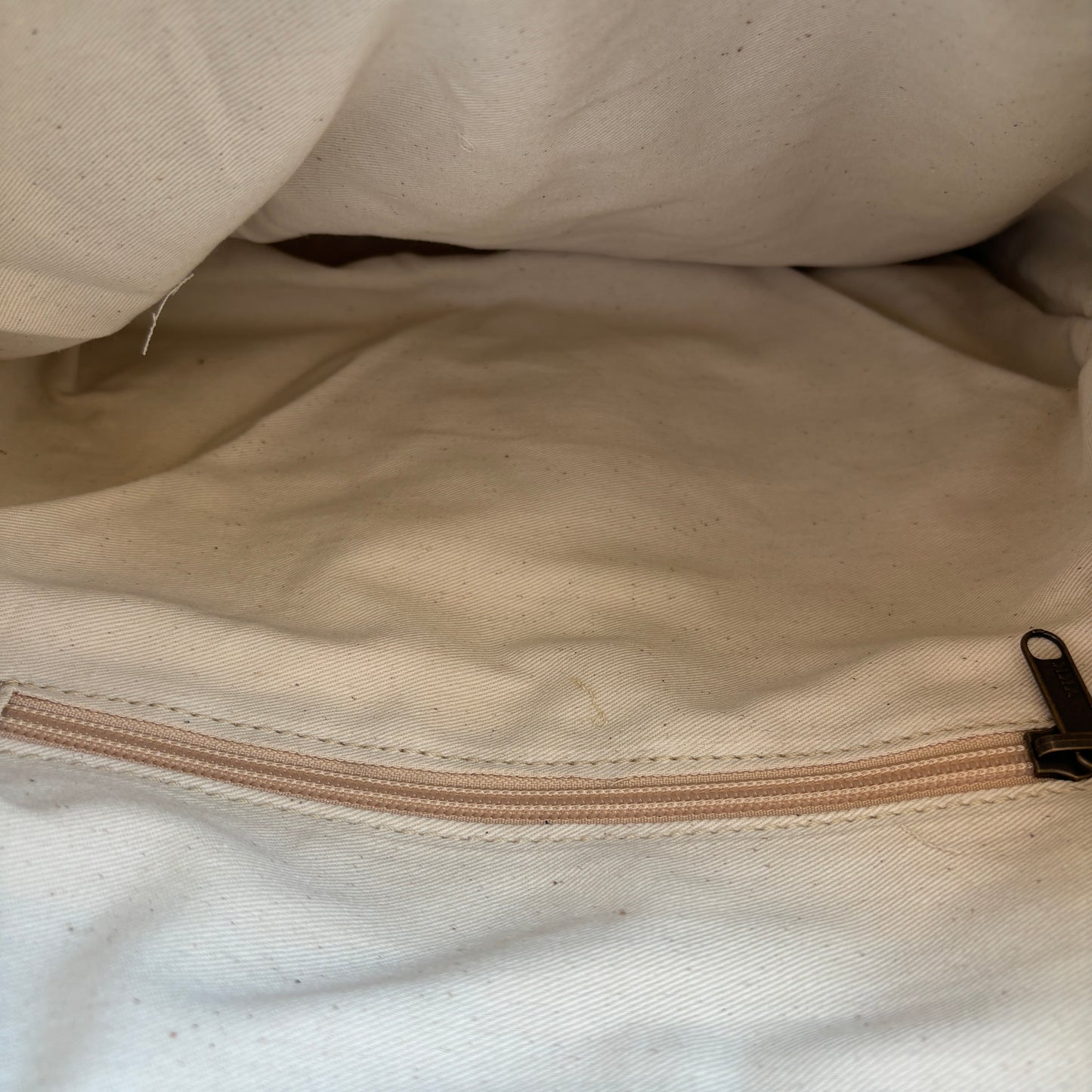 Gran apertura del bolsillo principal con cierre de cremallera en color oro viejo con tirador especial de piel.
