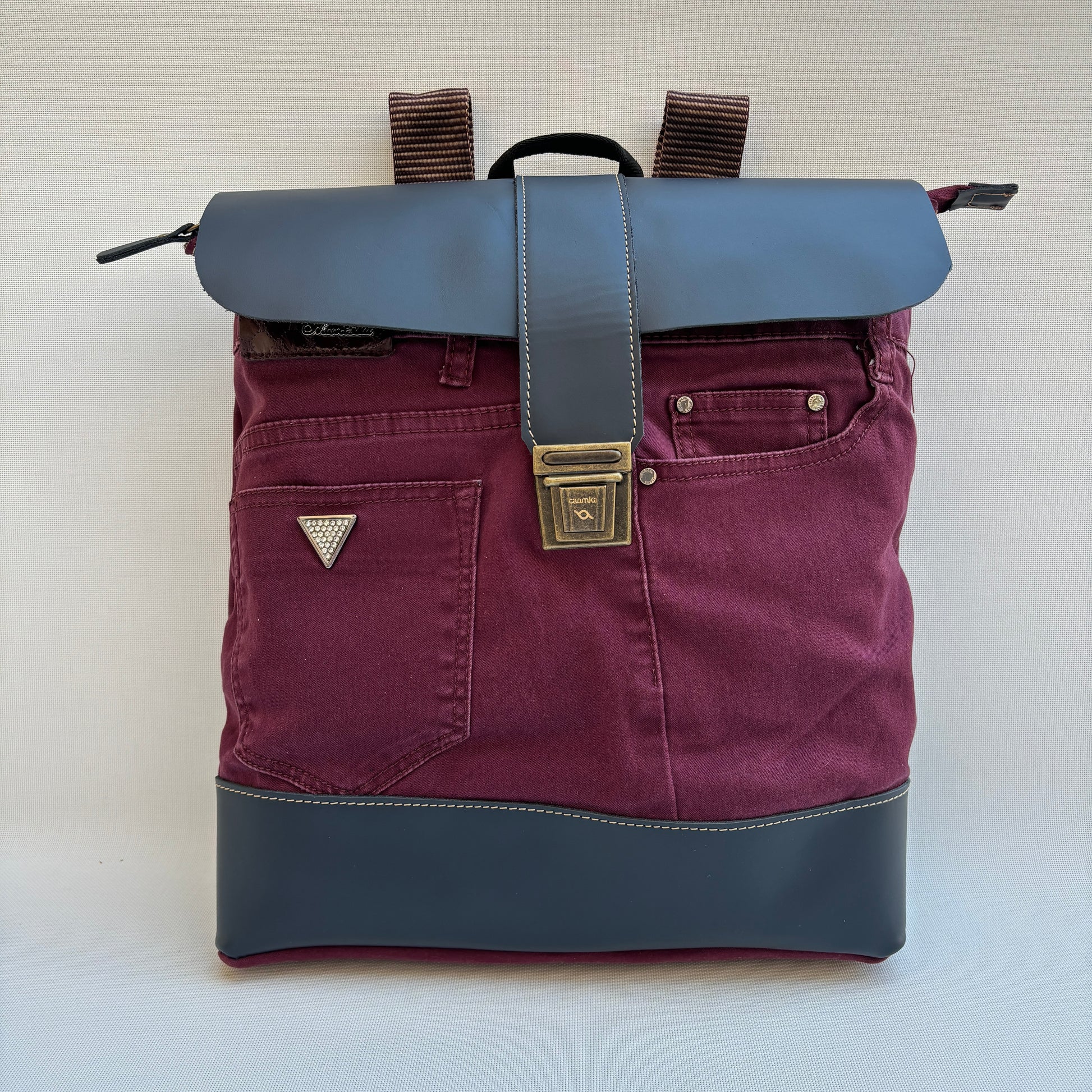 Mochila Caomka ultraligera confeccionada con tejido procedente de vaqueros reutilizados combinados con piel/cuero.