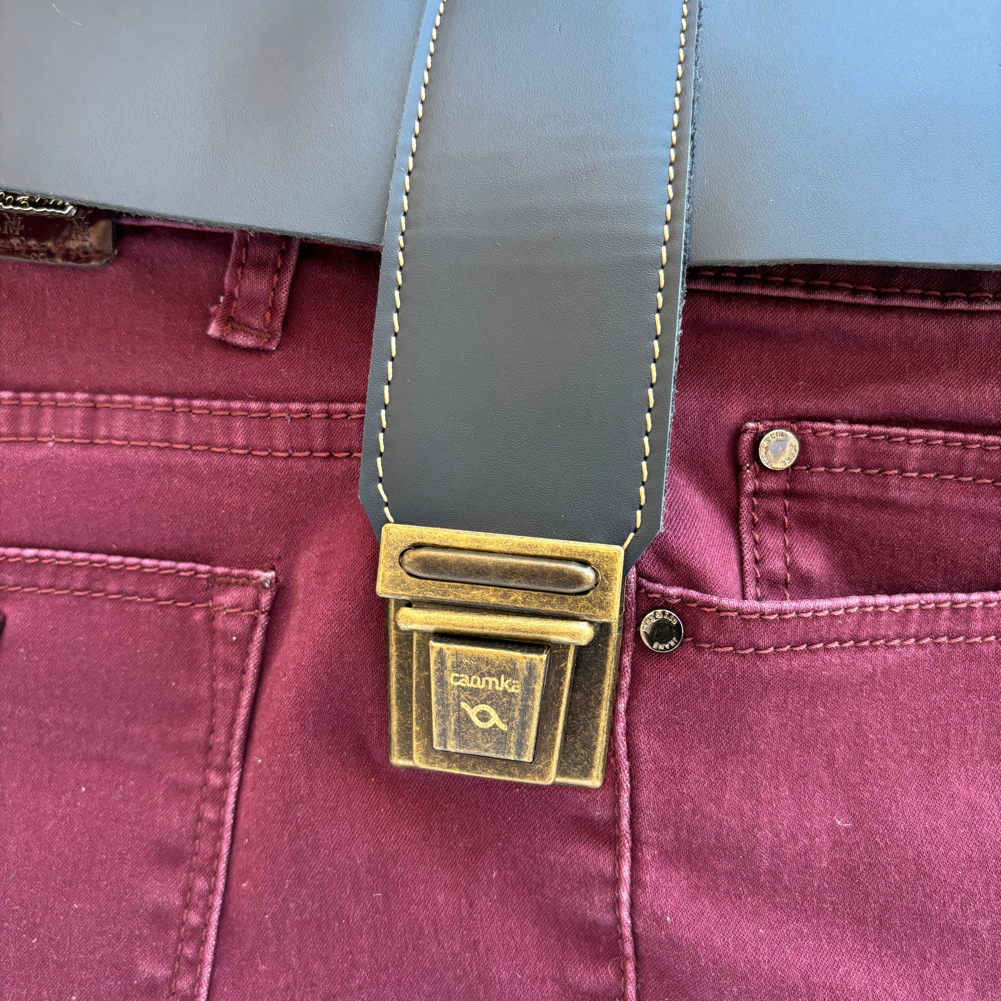 Bolsillo principal delantero en cuero en color contrastado al estilo y personalidad Caomka con cierre vintage "Click Clack" en color oro viejo.