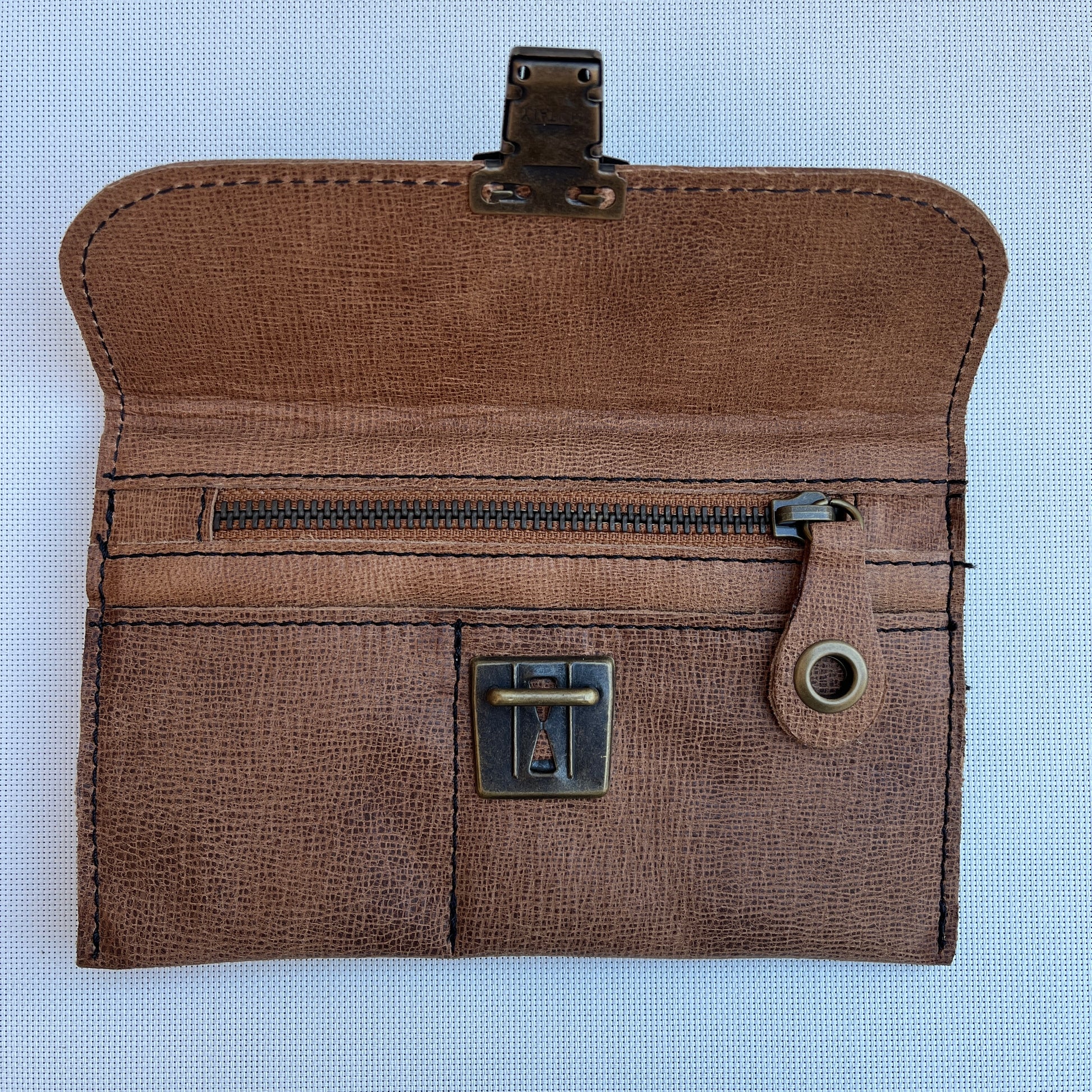 Cierre especial "Vintage" exterior. Cremallera exterior trasera y otra interior con doble tarjetero. Exterior personalizado con logo Caomka.