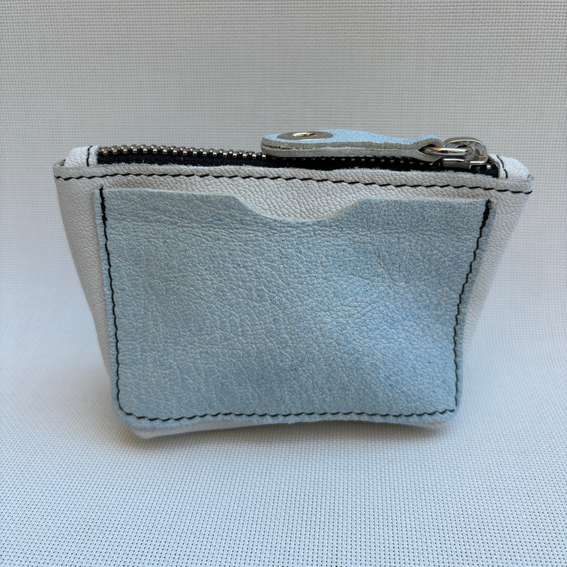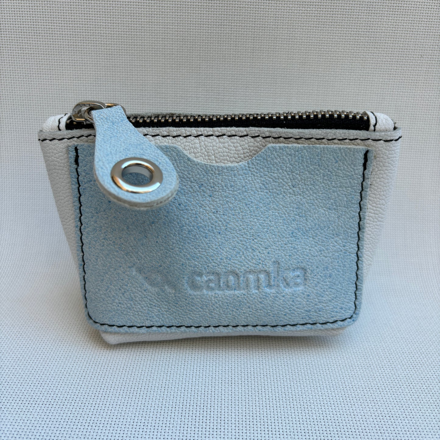 Monedero CAOMKA ideal tarjetas y monedas en Piel en color azul celeste y blanco.