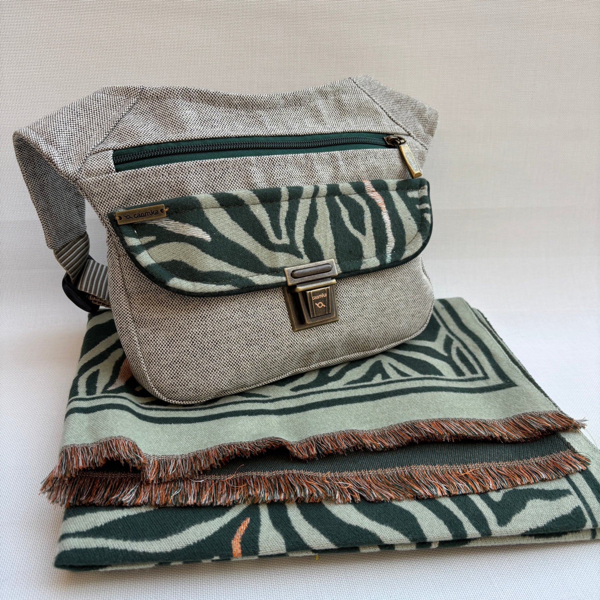Pack Riñonera + Bufanda de franela "Sweet Green Animal Print" · Pieza Única Núm. 18319