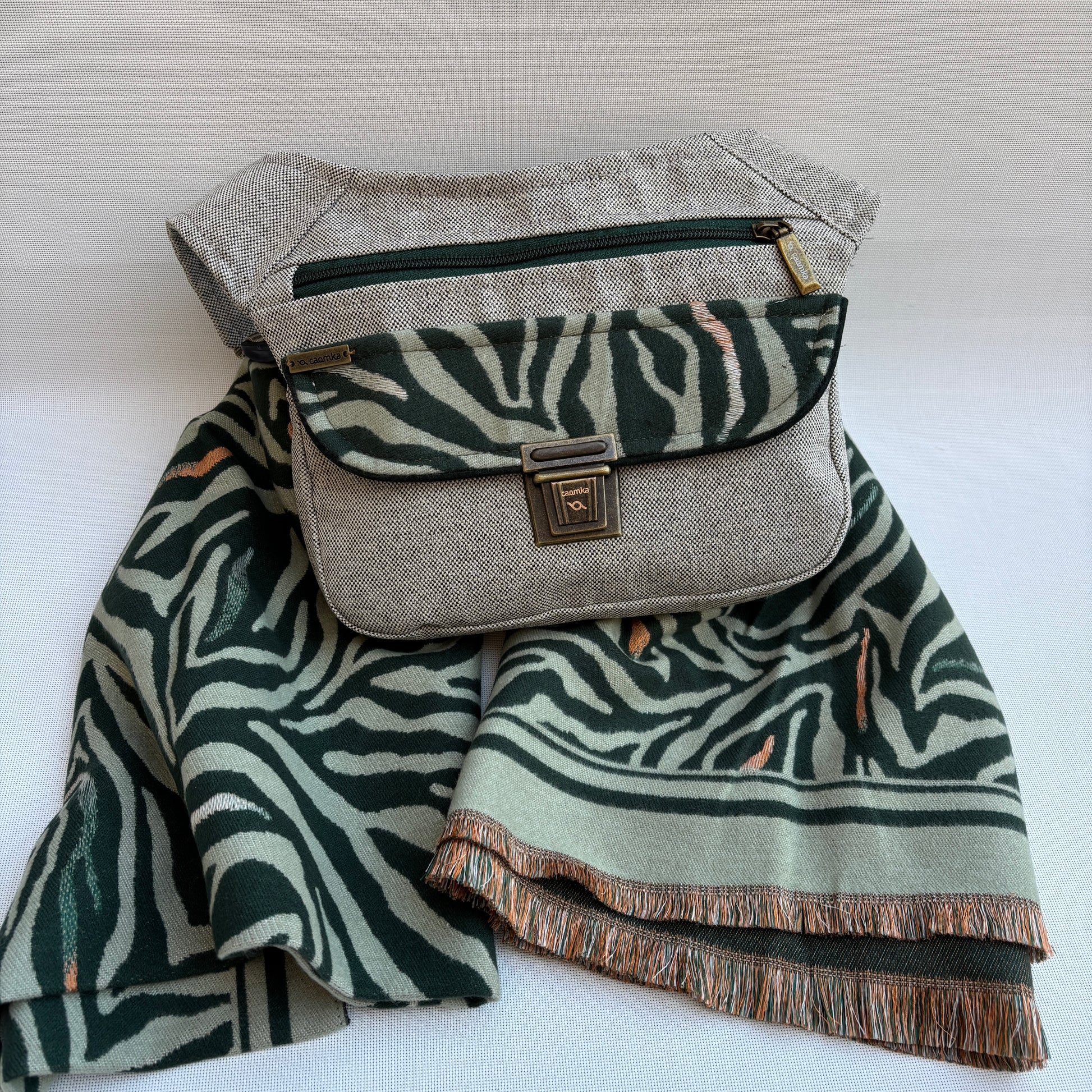 El Pack Sweet Green Animal Print 18319 reúne dos piezas que dialogan entre sí de forma natural: una riñonera artesanal y una bufanda amplia de franela con el mismo estampado.
