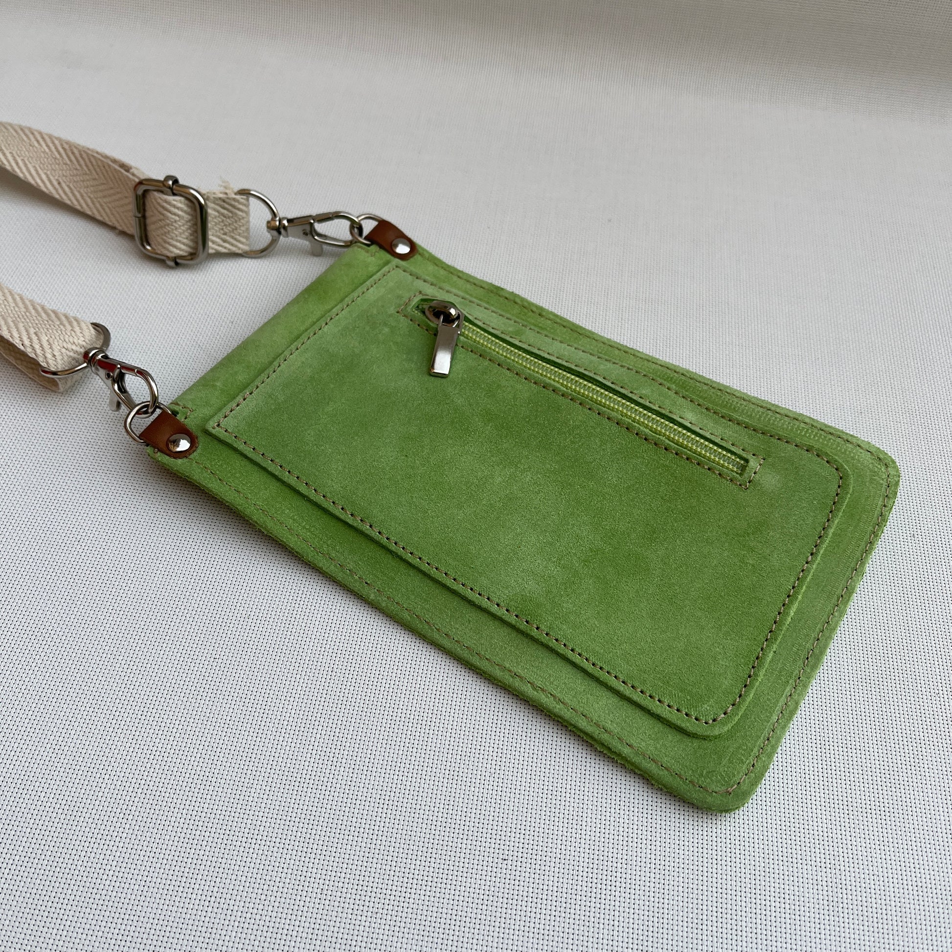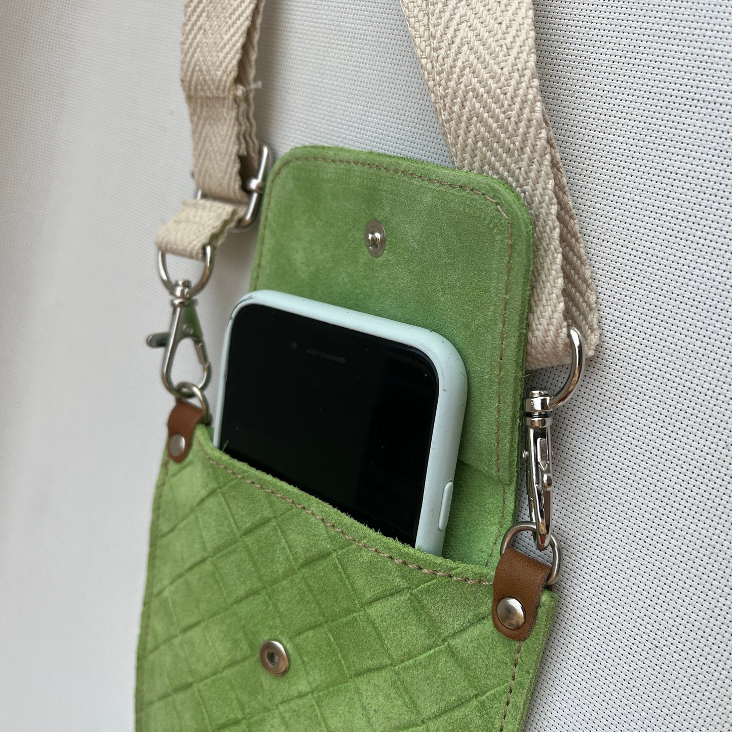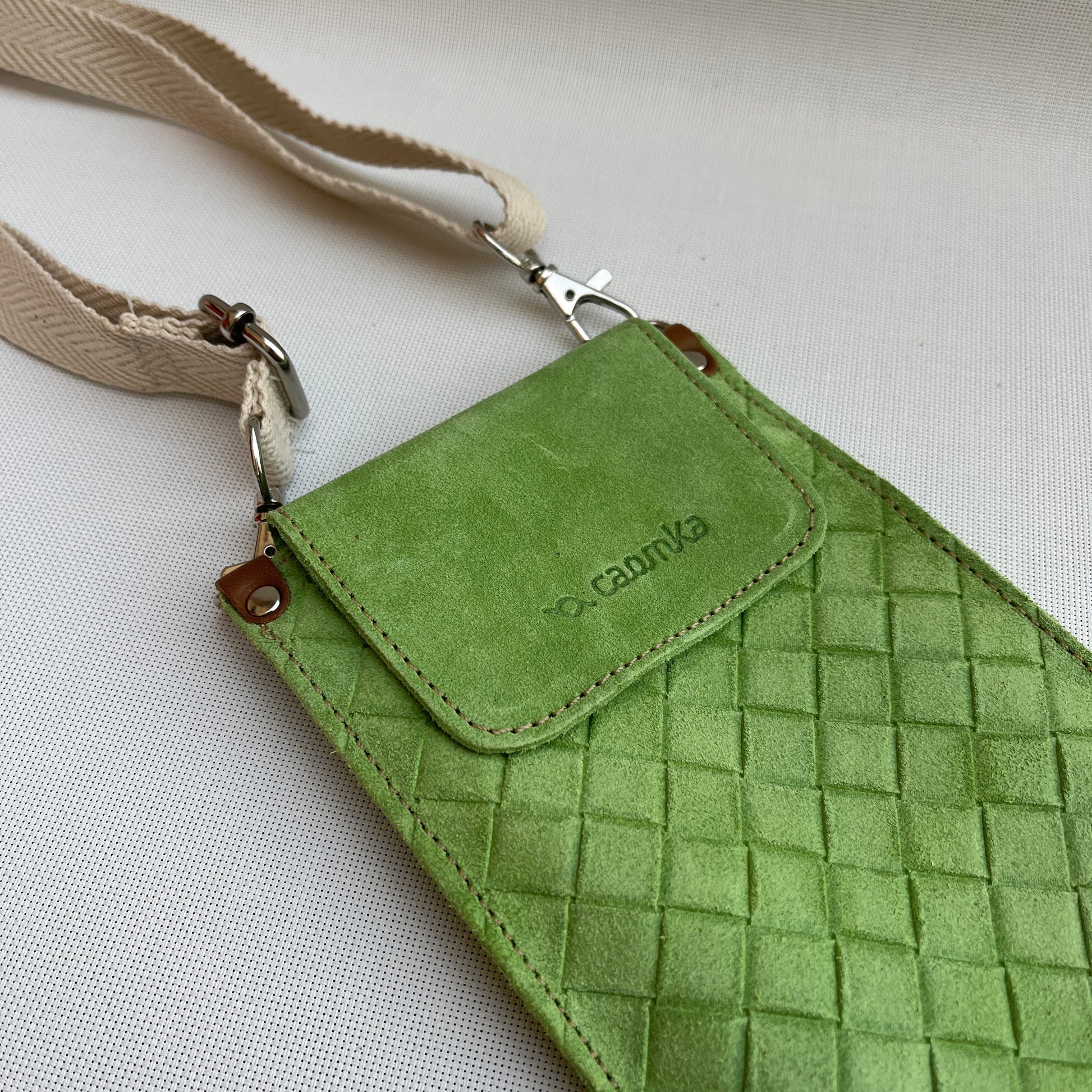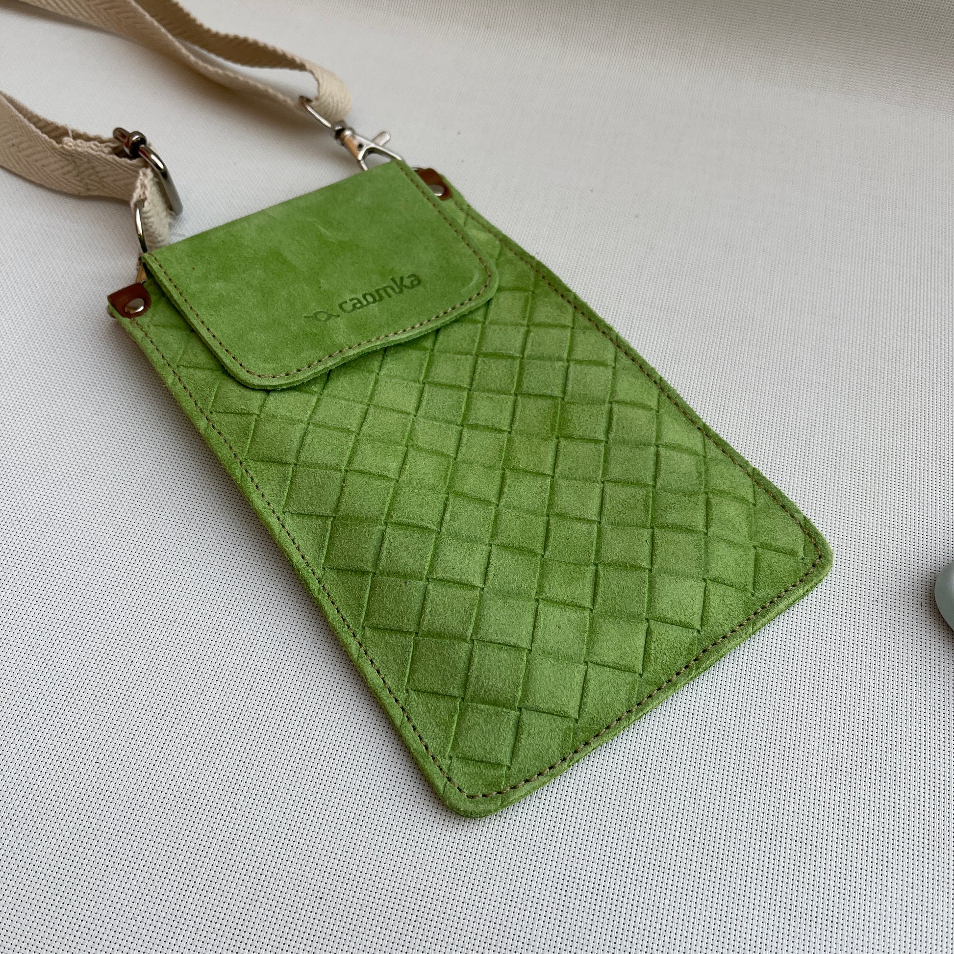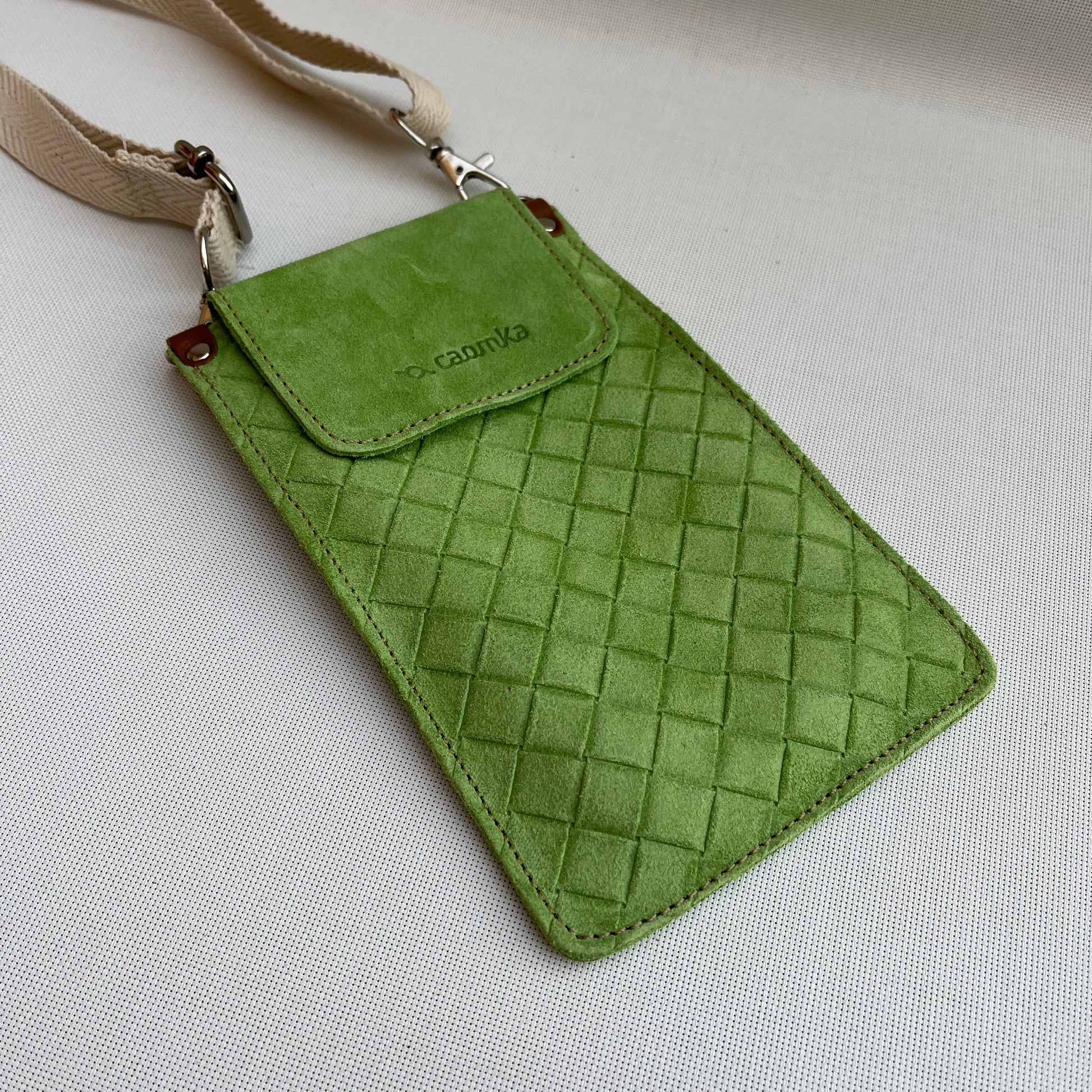 Porta Móvil · Diseño Tierra · Piel Serraje Trenzado · Verde Pistacho