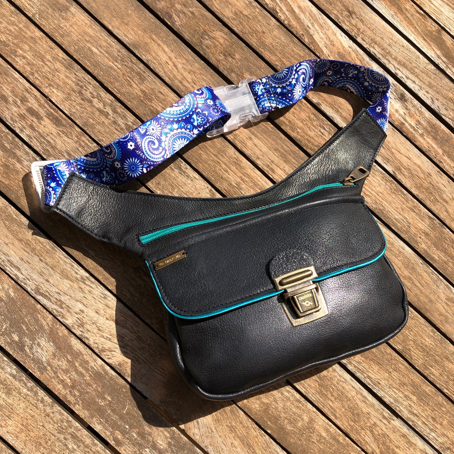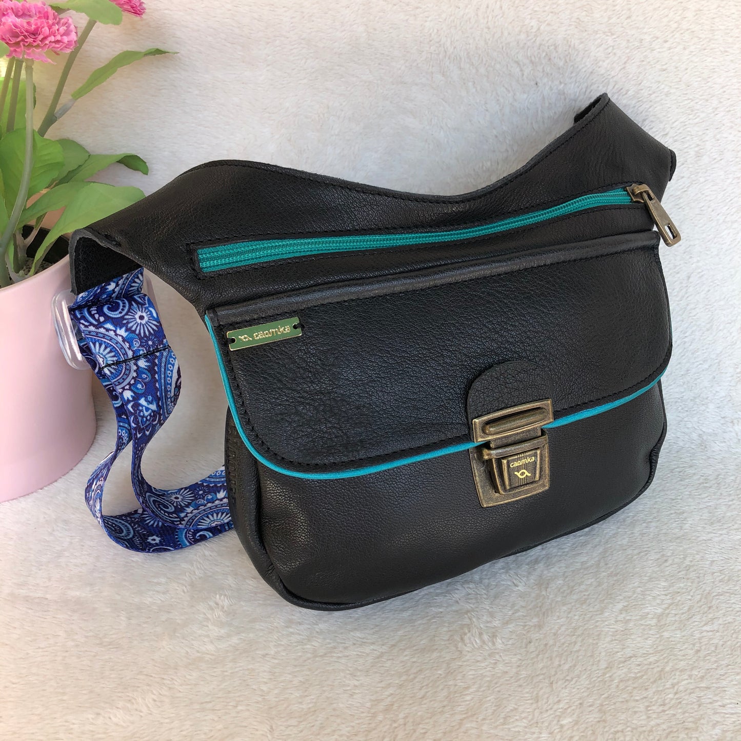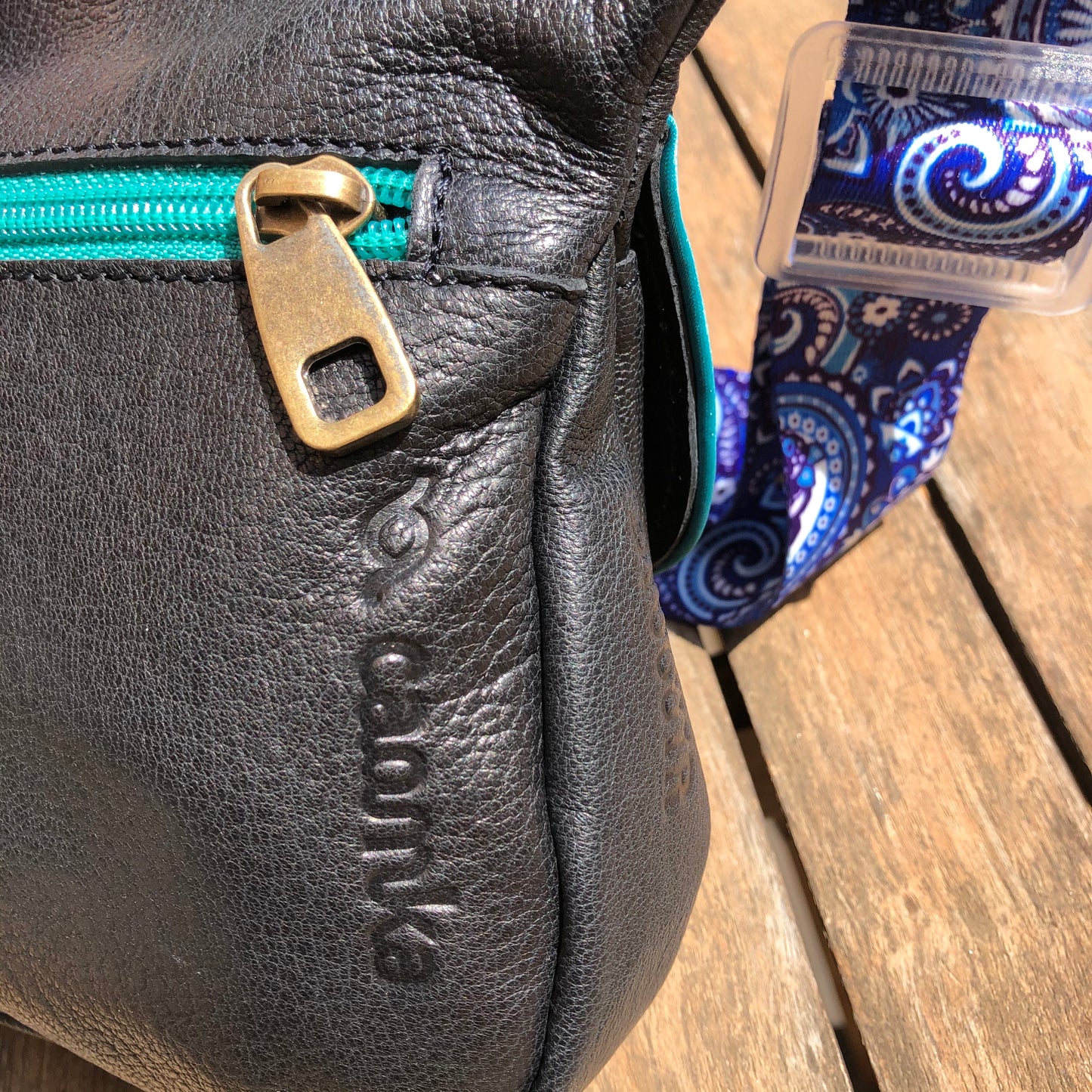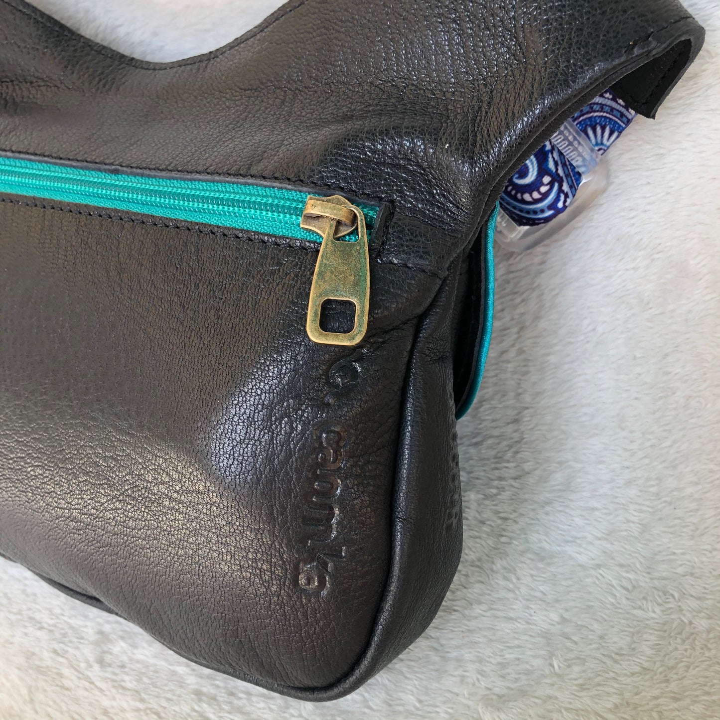 Bolsillo trasero extra con cremallera en turquesa y tirador especial de piel.