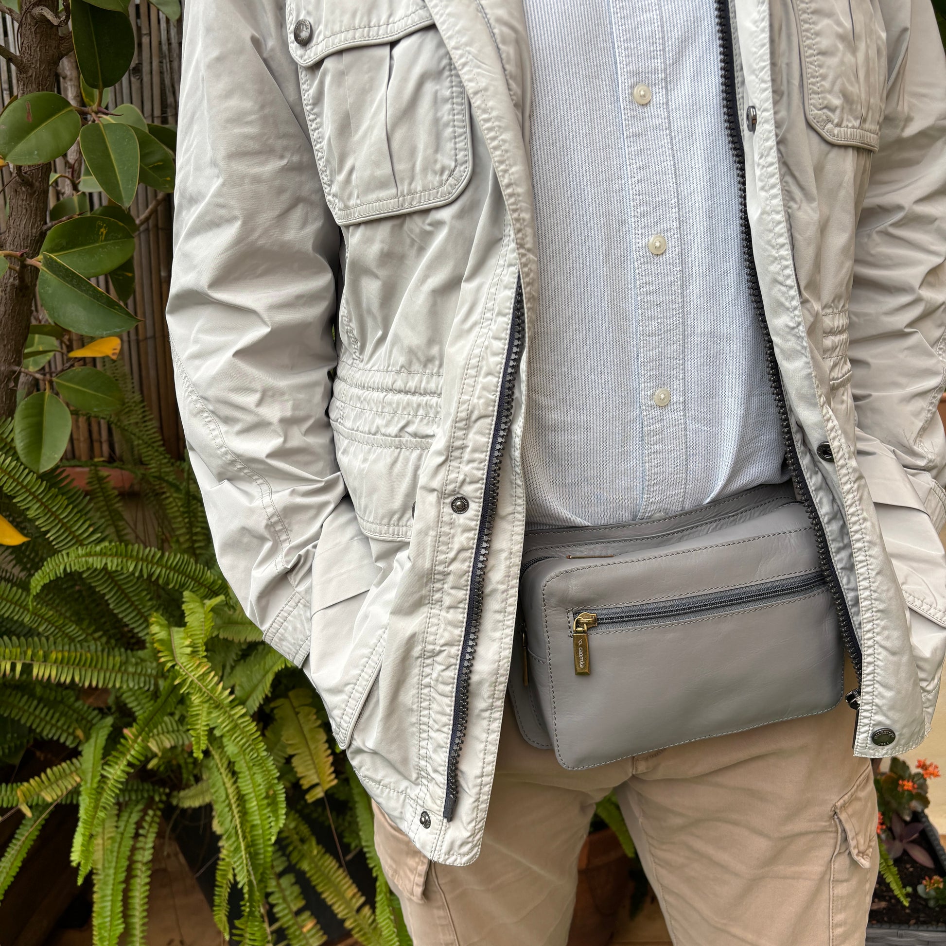 Confeccionada íntegramente en piel, su diseño unisex destaca por su formato compacto, su estructura suave y su gran funcionalidad. El gris aporta una estética equilibrada y versátil, fácil de combinar y perfecta para quienes buscan una pieza atemporal con carácter sereno.