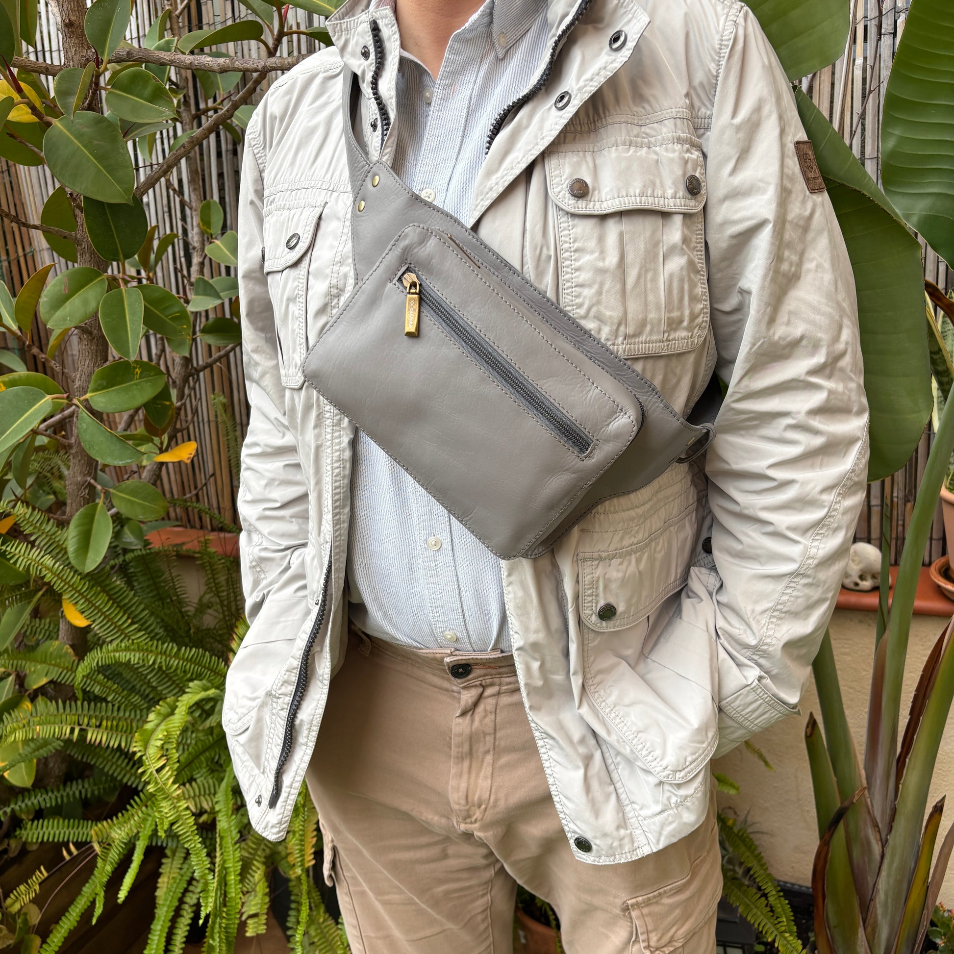 La riñonera Alfredo en color gris es una pieza de líneas sobrias y elegantes, pensada para acompañarte con comodidad y discreción en el día a día.