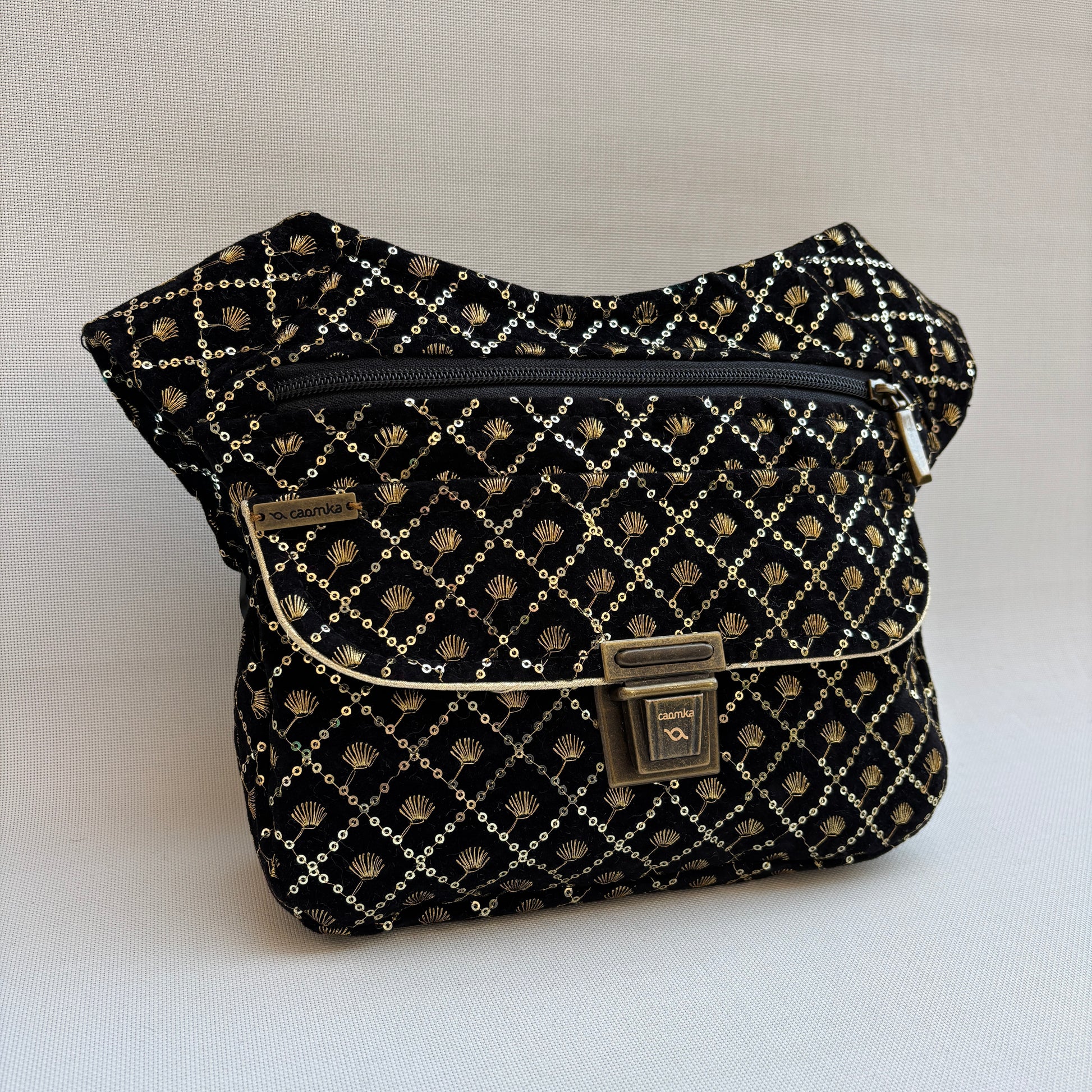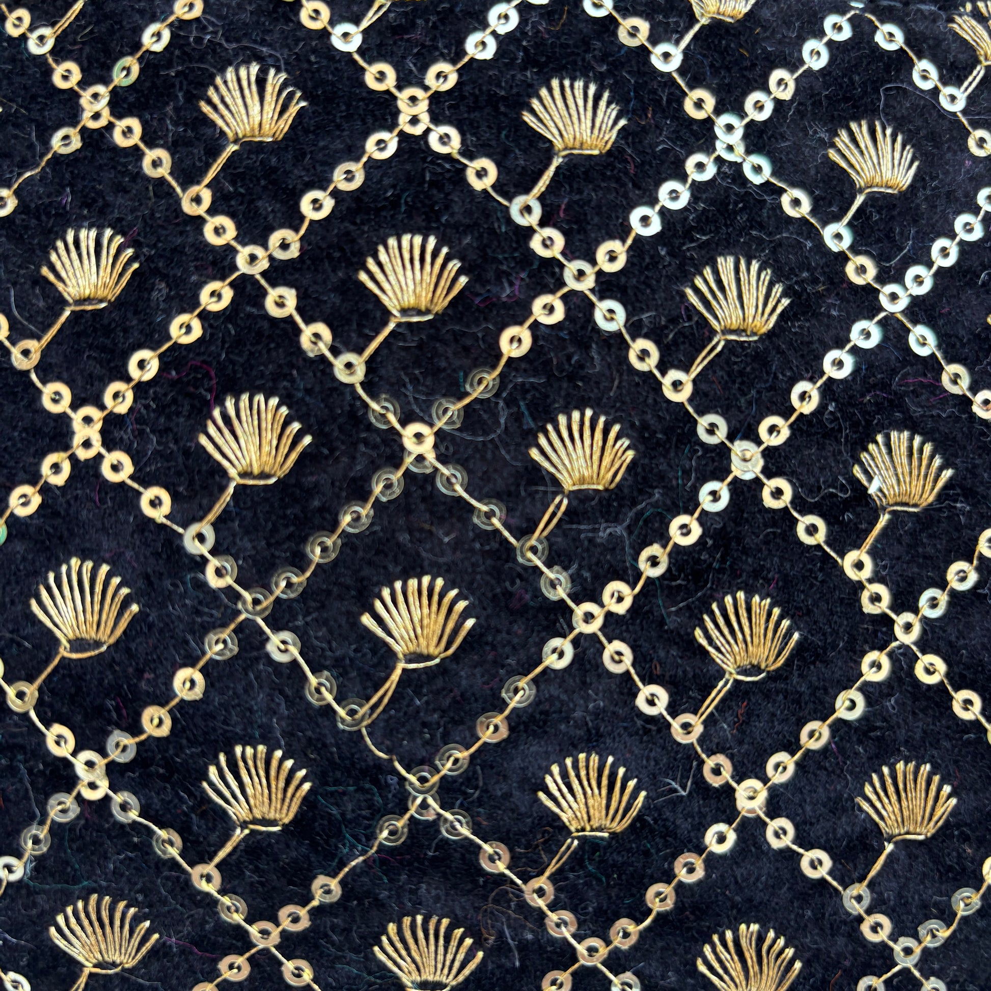 Su base en terciopelo negro aporta profundidad, suavidad y presencia, creando el lienzo perfecto para un delicado trabajo de bordado en hilo dorado y mini tachuelas, dispuesto en un patrón geométrico refinado y armonioso.